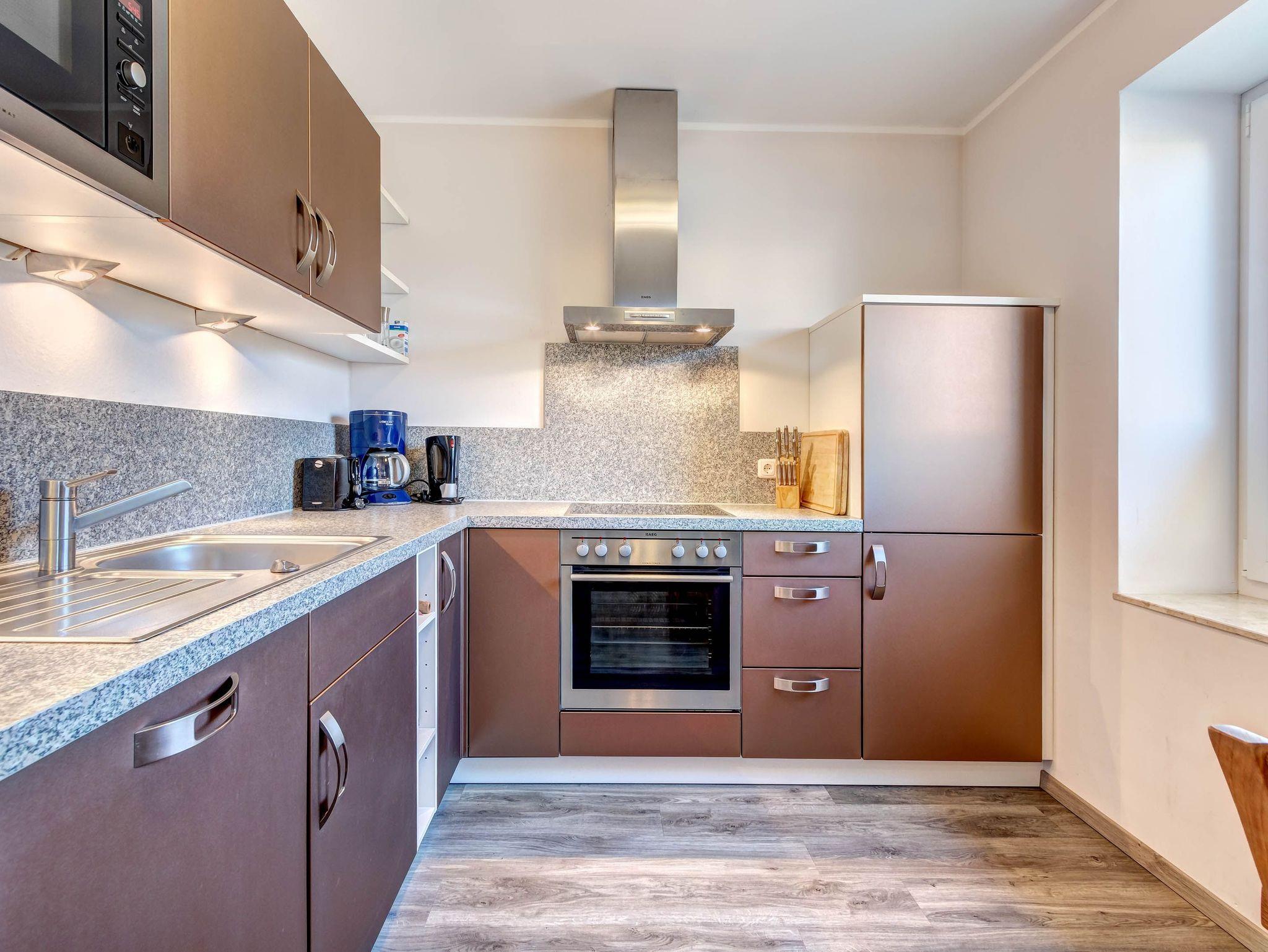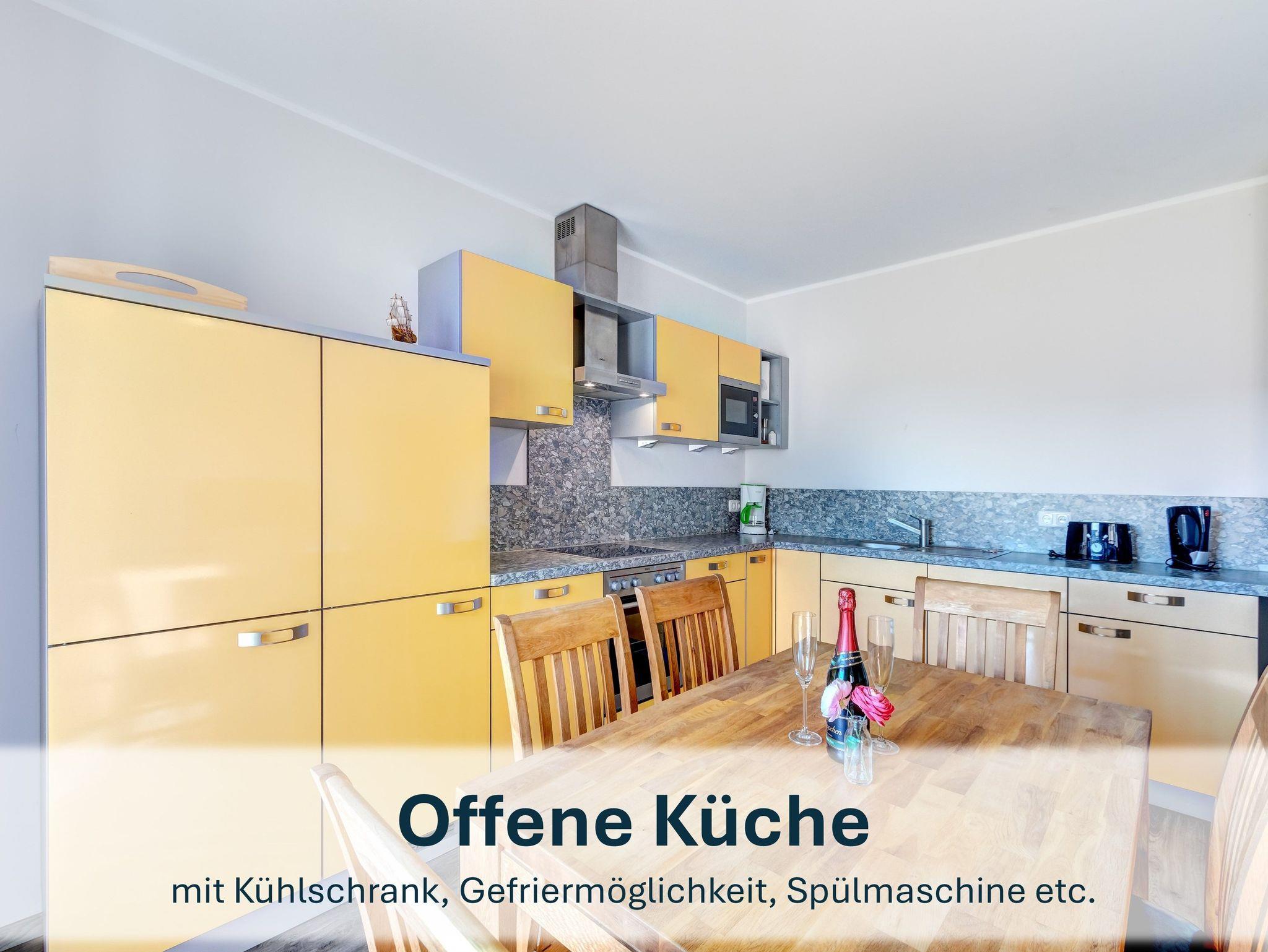In der offenen, voll ausgestatteten Küche mit Spülmaschine, Backofen, Mikrowelle, Kühlschrank mit Gefrierfach, Kaffeemaschine, Toaster und Wasserkocher können Sie gemeinsam kochen und den Urlaub kulinarisch genießen. Der angrenzende Essplatz schafft Raum für gesellige Stunden.