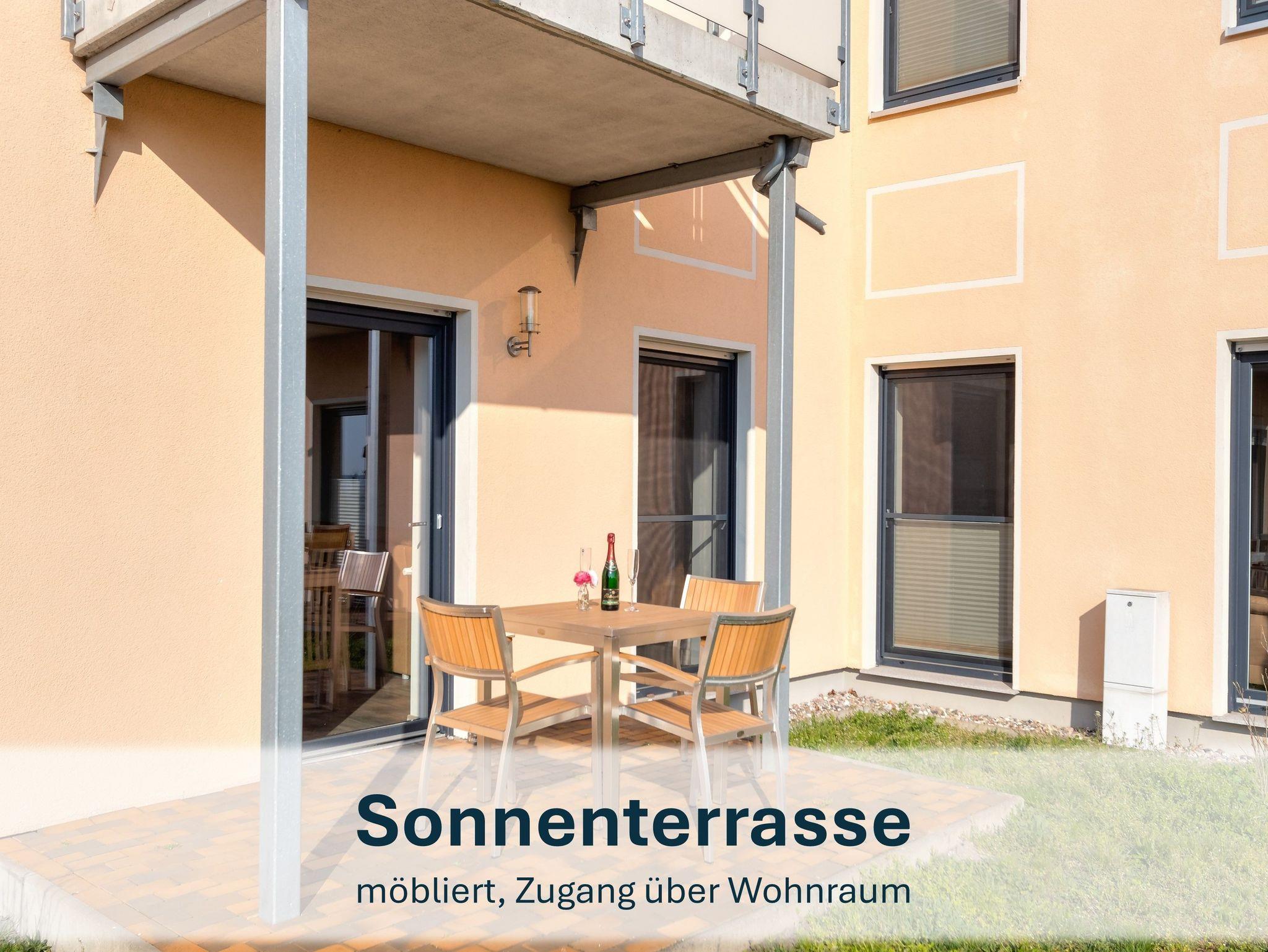 Das moderne Badezimmer ist mit einer ebenerdigen Dusche ausgestattet. Auf der möblierten Terrasse genießen Sie die frische Ostseeluft und entspannte Urlaubsmomente im Freien.