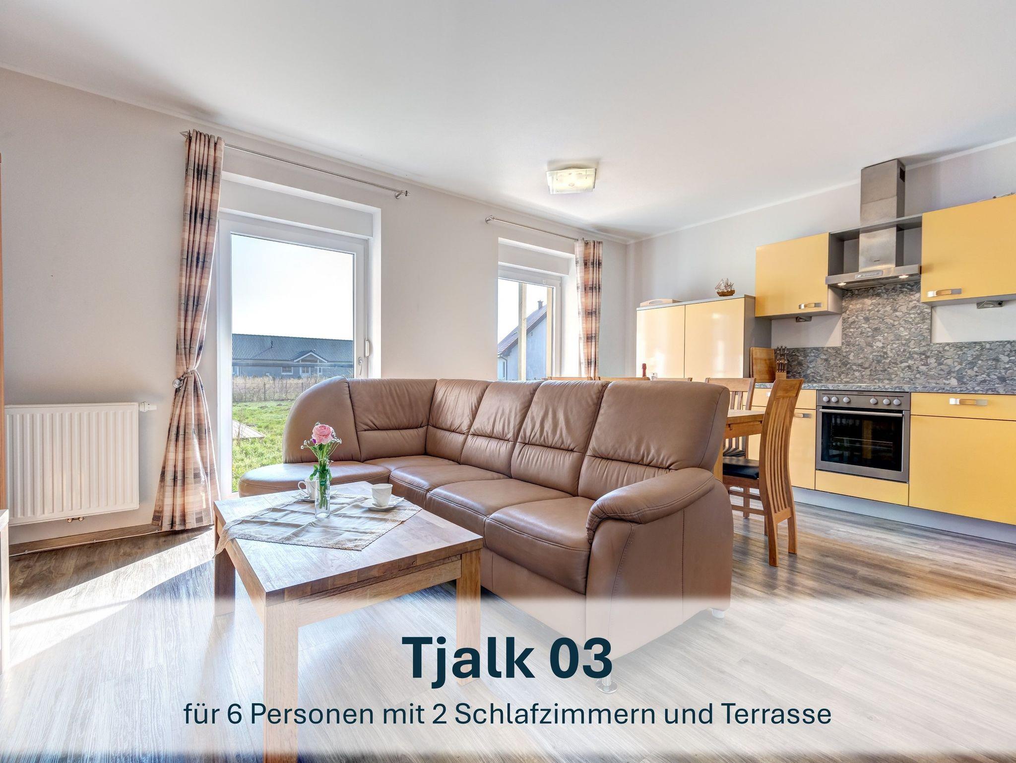 Die Erdgeschosswohnung „Tjalk 03“ bietet auf 72m² Platz für bis zu 5 Erwachsene und ein Kleinkind. Der großzügige Wohnbereich ist mit einem Schlafsofa, einem Flat-TV sowie einer offenen, voll ausgestatteten Küche eingerichtet. Zur Ausstattung gehören Spülmaschine, Kühlschrank mit Gefrierfach, Mikrowelle, Ceranfeld mit Backofen, Toaster, Kaffeemaschine und Wasserkocher.