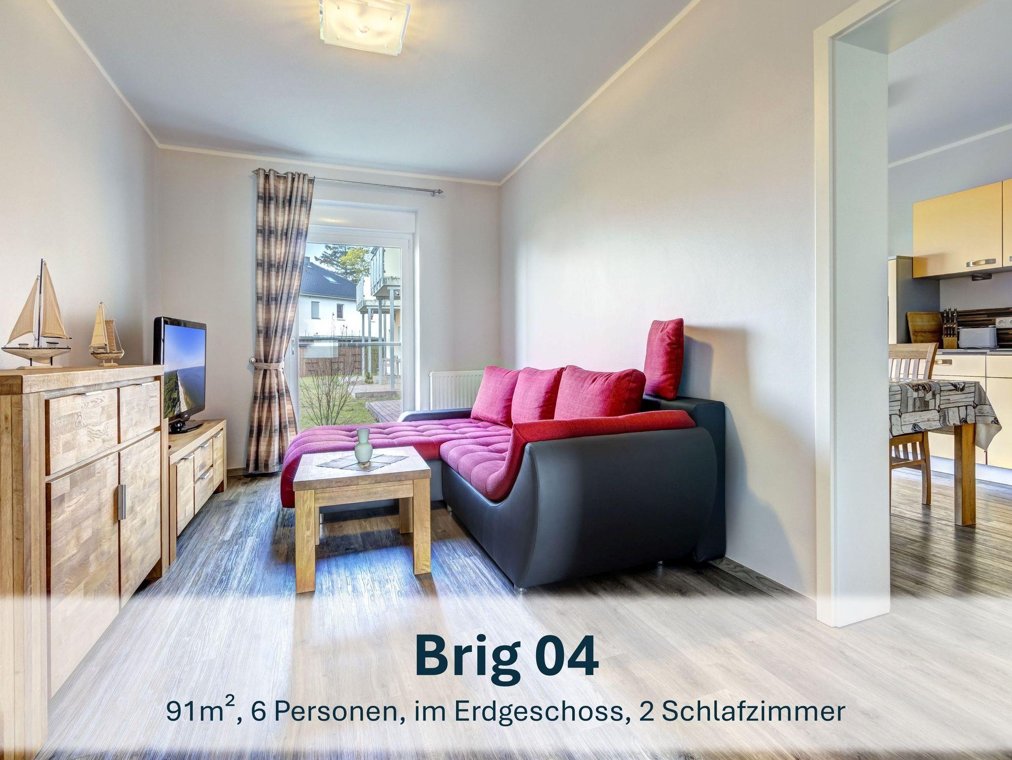 Die Ferienwohnung „Brig 04“ im Erdgeschoss überzeugt mit 91m² Wohnfläche und einem separaten, ebenerdigen Zugang ? ideal für Familien oder kleine Gruppen bis 5Personen und ein Kleinkind bis 3Jahre. Zwei Schlafzimmer sorgen für erholsame Nächte: eines mit Doppelbett, das andere mit zwei zusammenschiebbaren Einzelbetten.