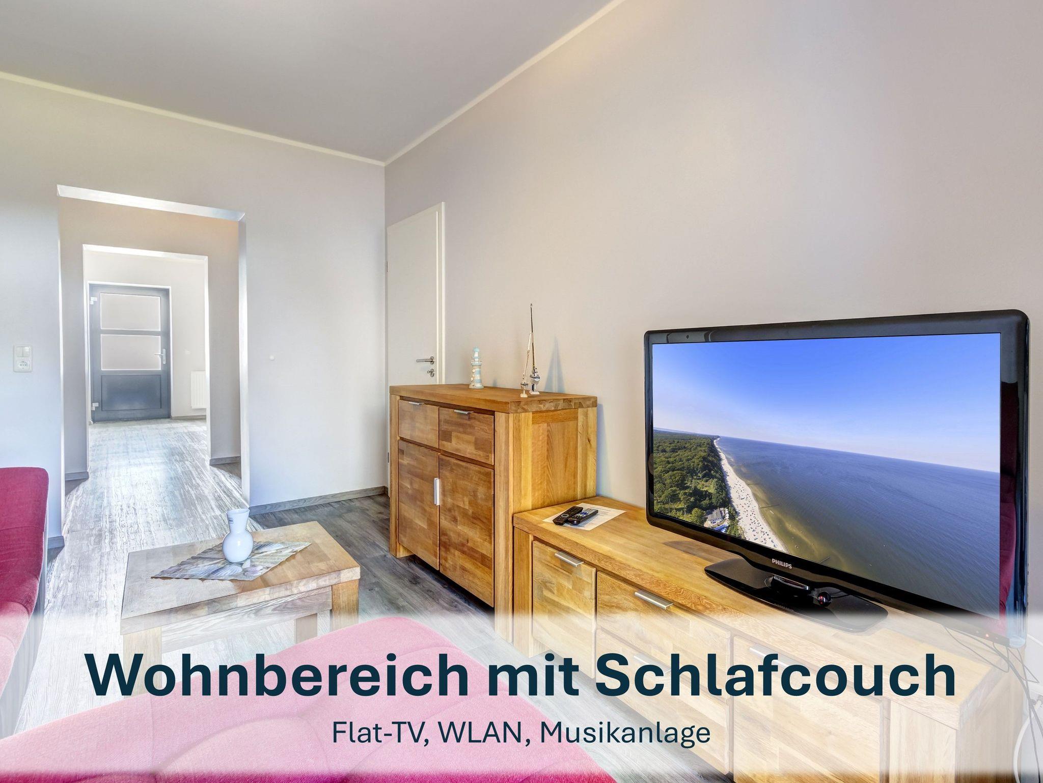 Im großzügigen Wohnbereich mit Schlafcouch, Esstisch und Flat-TV können Sie entspannte Stunden verbringen. Die offene Küche ist voll ausgestattet mit Spülmaschine, Herd, Backofen, Kühlschrank mit Gefrierfach, Mikrowelle, Kaffeemaschine, Wasserkocher und Toaster. Das moderne Bad bietet eine ebenerdige Dusche.