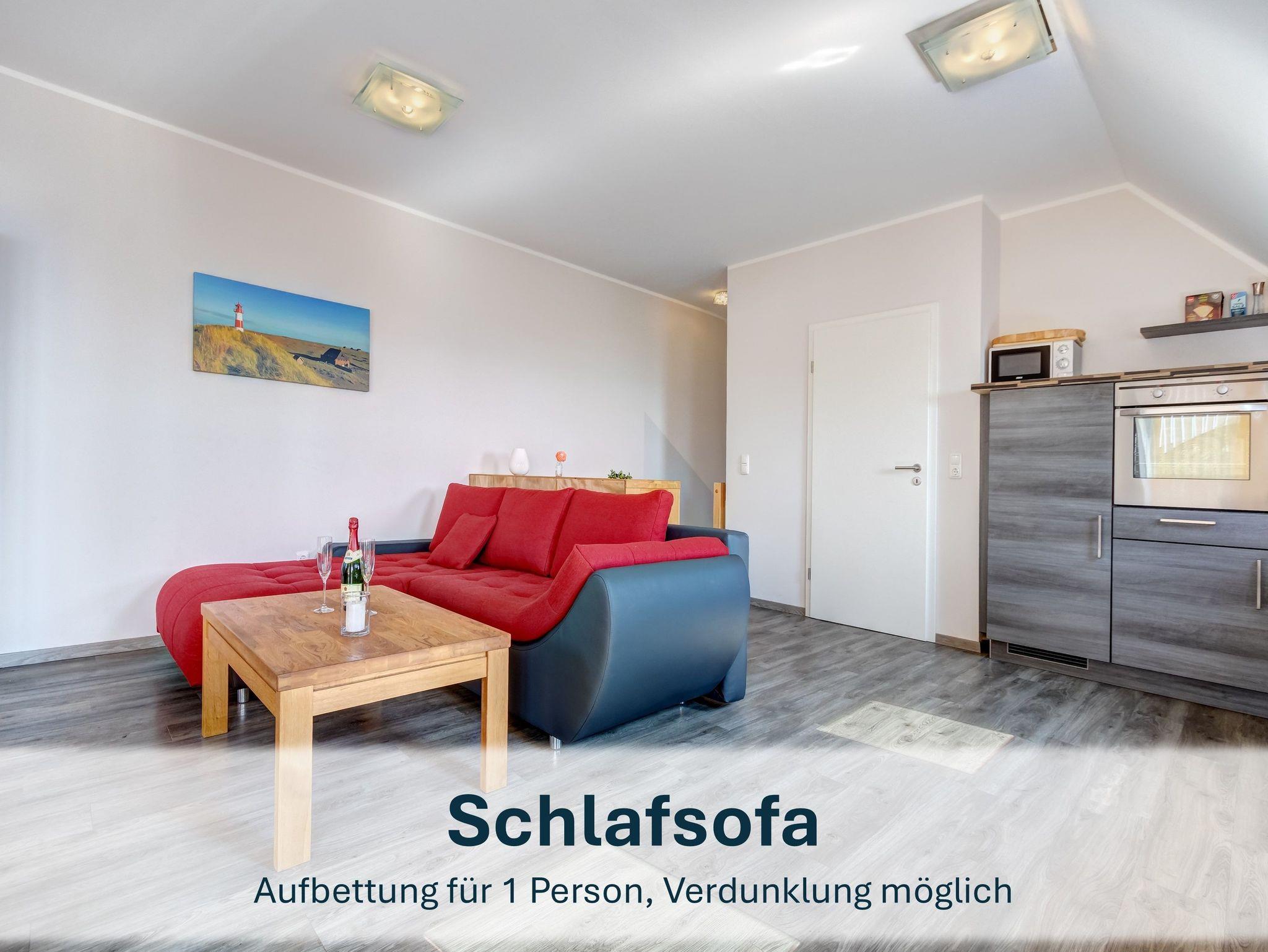 Im Obergeschoss befinden sich der Eingangsbereich, ein Schlafzimmer mit Doppelbett sowie das Bad mit Dusche und Fenster. Im Dachgeschoss erwartet Sie ein großzügiger Wohnbereich mit Schlafcouch, ein Essplatz in der Loggia mit Ausblick, die voll ausgestattete offene Küche sowie ein weiteres Schlafzimmer mit Doppelbett in der zweiten Loggia. Beide Loggien sind mit Innenjalousien und Außenrollos versehen.