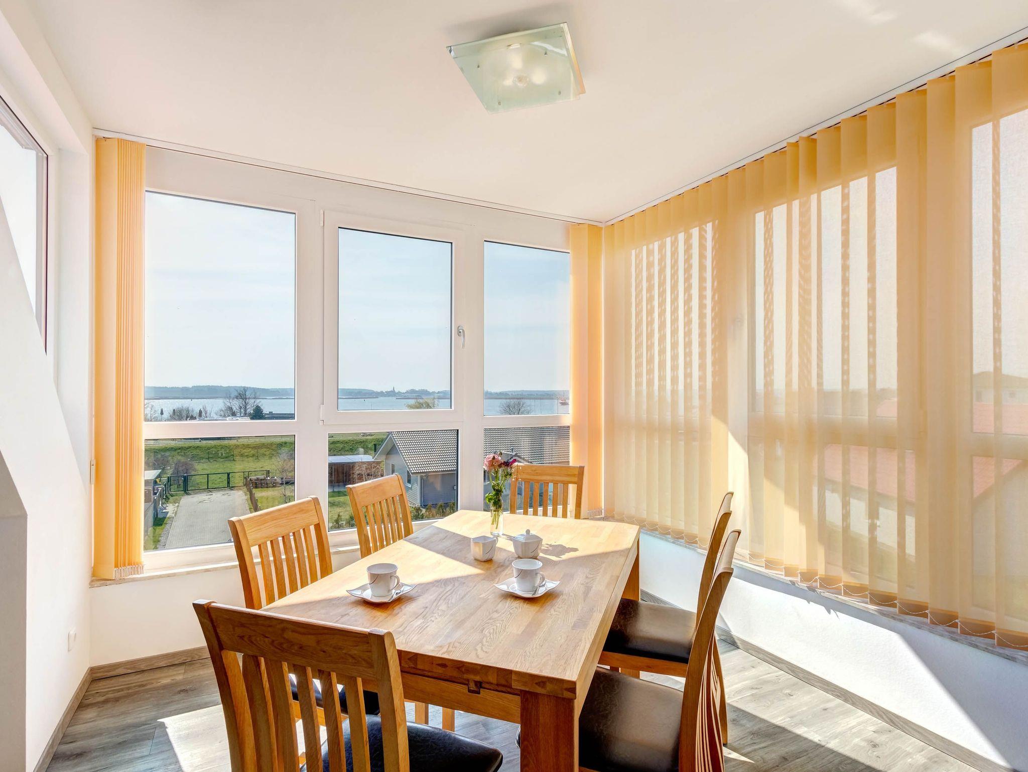 Die Maisonettewohnung Nr.15 erstreckt sich über das Ober- und Dachgeschoss und bietet auf 80m² Platz für bis zu 5 Personen und 1 Kleinkind. Highlight sind die zwei geschlossenen Loggien mit herrlichem Panoramablick auf den Seglerhafen und den Bodden.