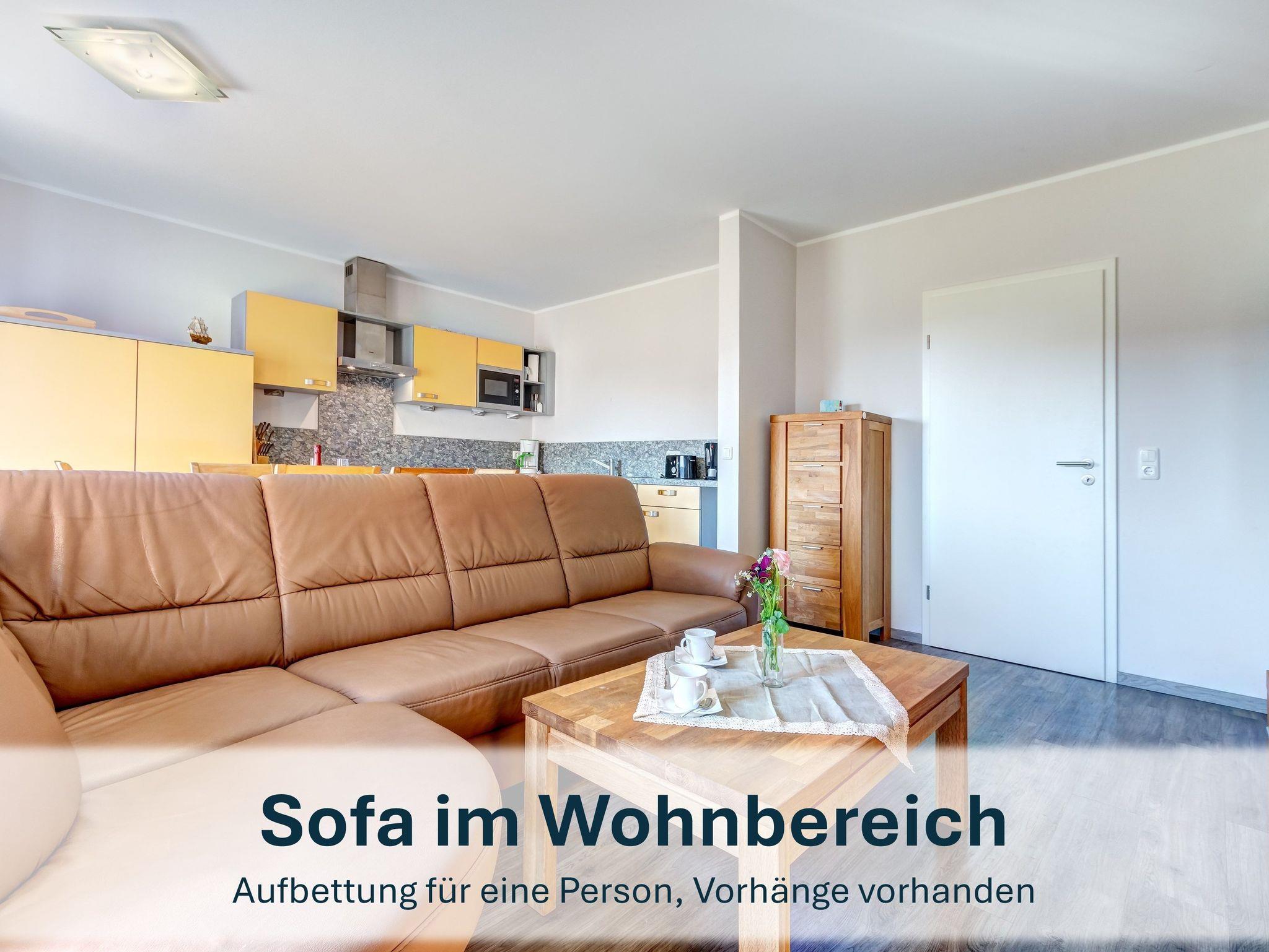 Für Paare oder Einzelreisende bietet die Wohnung „Jolle 16“ im Obergeschoss eine charmante Rückzugsmöglichkeit auf 43m². Der kombinierte Wohn- und Schlafbereich, eine kleine Küche und der möblierte Balkon schaffen eine gemütliche Atmosphäre für entspannte Tage.