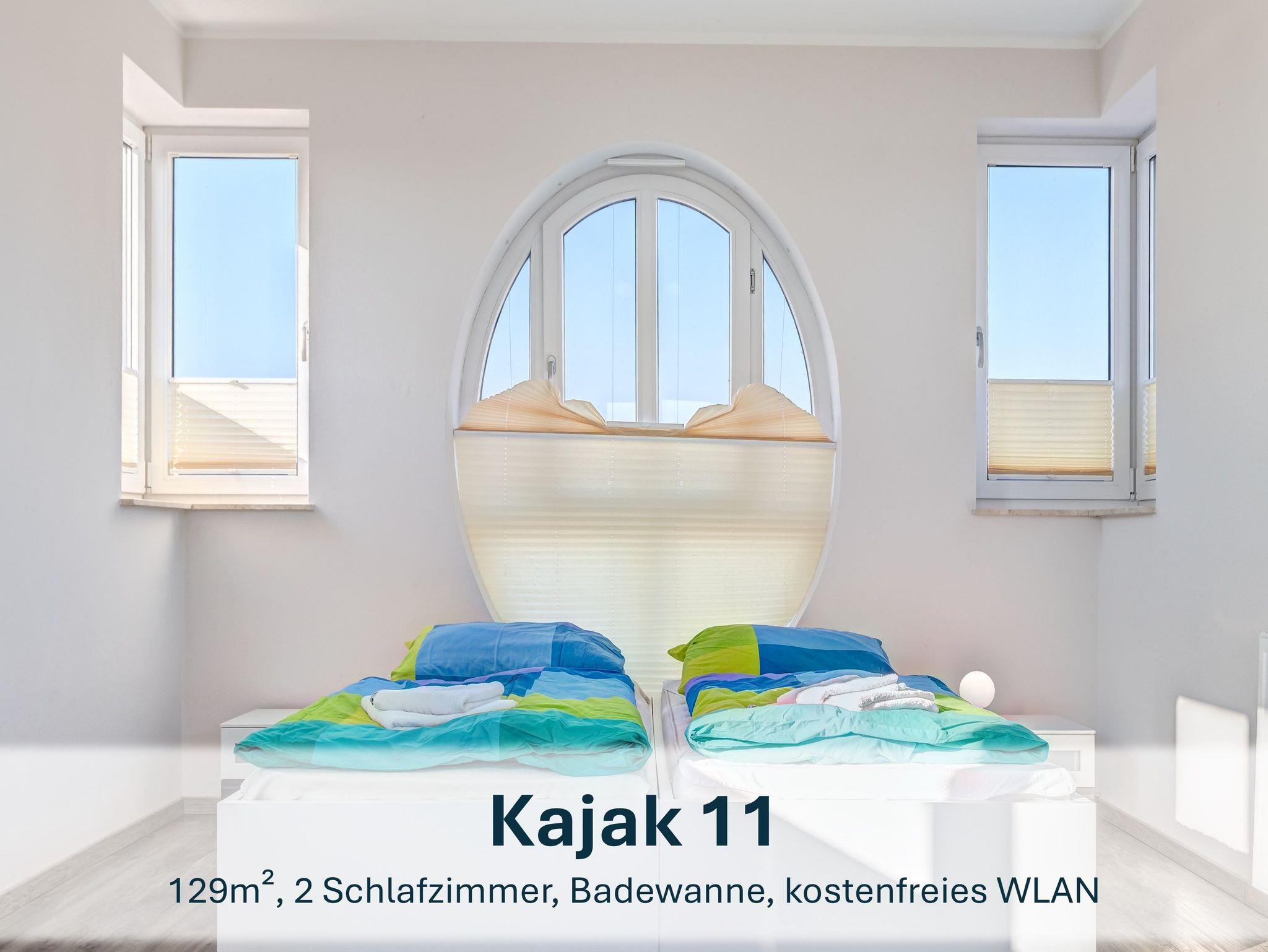 Ein besonderes Highlight ist die Maisonettewohnung „Kajak 11“ mit rund 129m² Wohnfläche über zwei Etagen. Zwei separate Schlafzimmer und ein charmantes Turmzimmer mit Schlafmöglichkeit machen diese Wohnung ideal für Familien mit älteren Kindern oder befreundete Paare. Das großzügige Raumgefühl, der sonnige Balkon und die hochwertige Ausstattung sorgen für echte Urlaubsqualität.