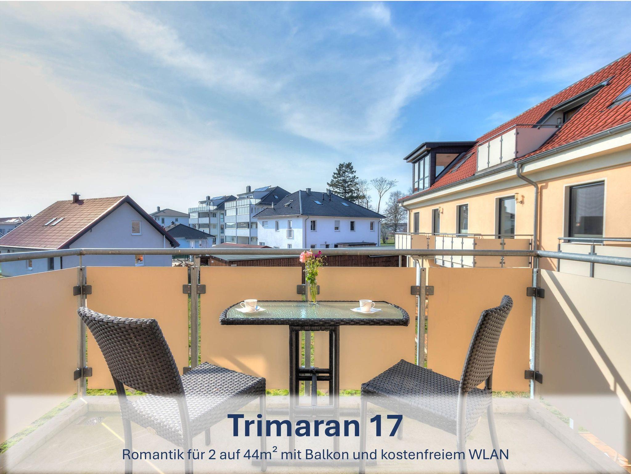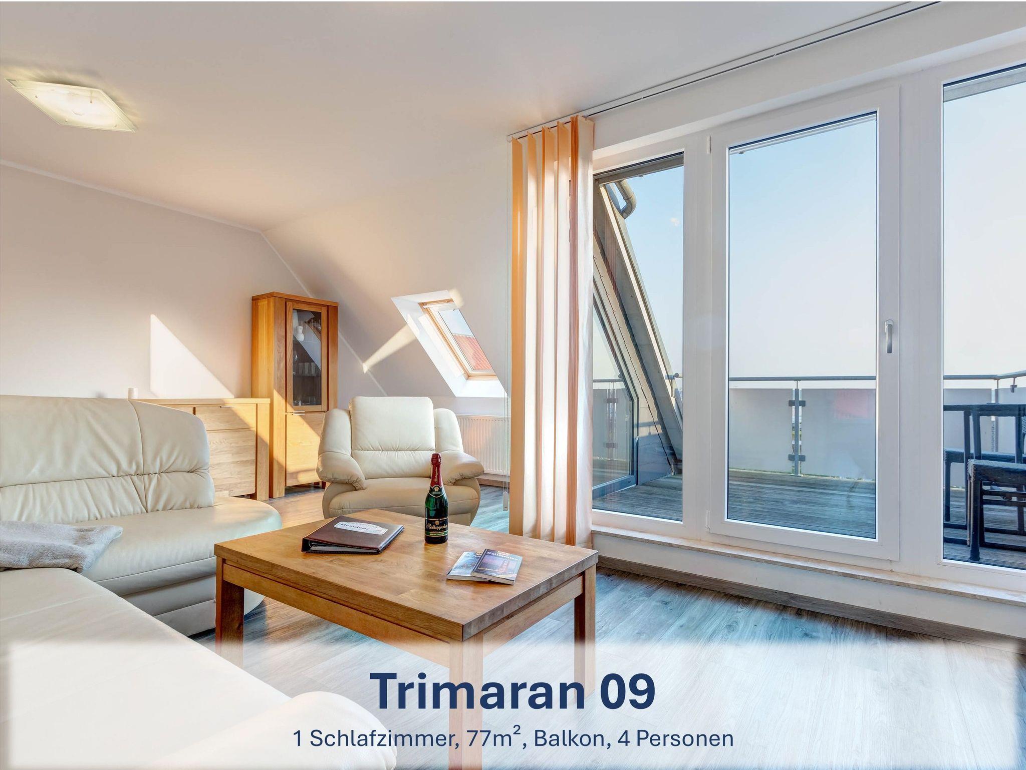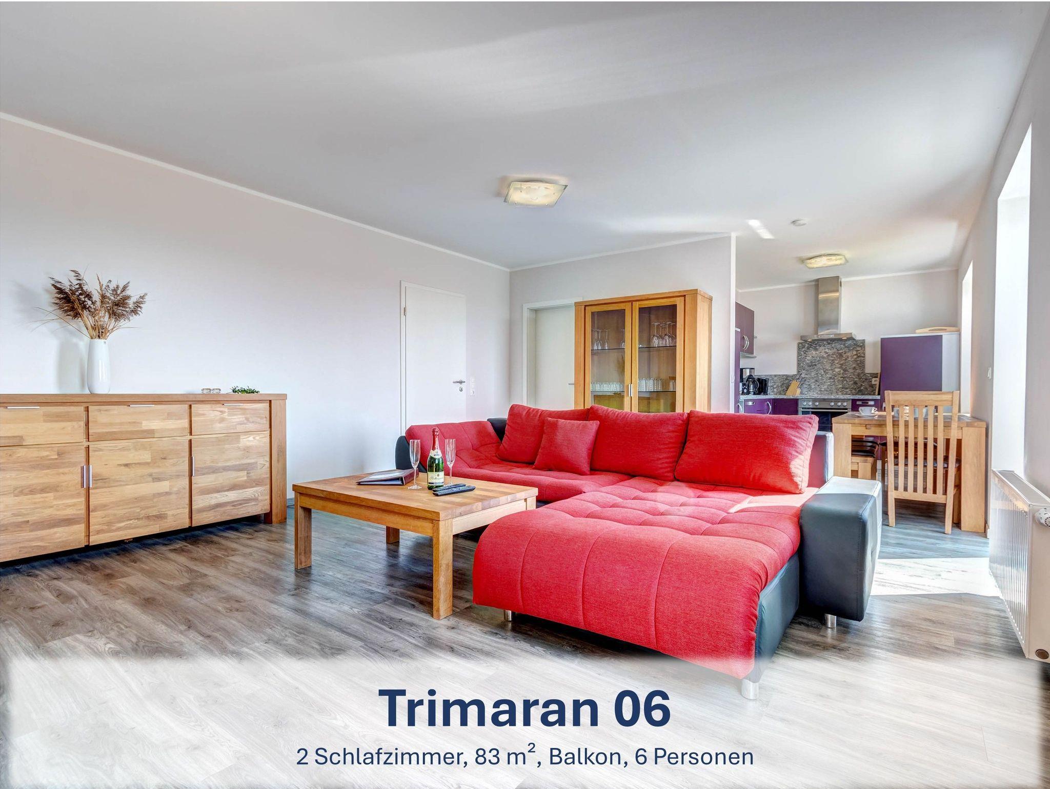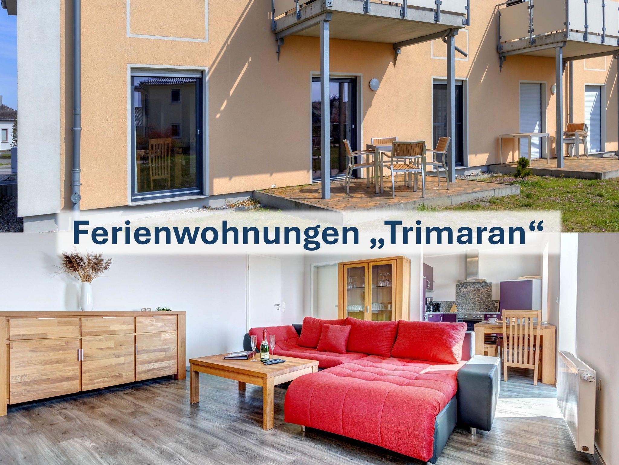 Die Wohneinheit „Trimaran“ setzt sich aus vier separaten Ferienwohnungen innerhalb der Ferienresidenz „Zum Seglerhafen“ zusammen. Jede Wohnung verfügt über ein bis zwei Schlafzimmer mit Doppel- oder Einzelbetten, ein Badezimmer mit Dusche (teilweise mit Fenster) sowie einen offenen Wohnbereich mit gemütlicher Sitzecke und voll ausgestatteter Küche ? inklusive Spülmaschine, Cerankochfeld, Backofen, Kühlschrank mit Gefrierfach, Mikrowelle, Wasserkocher, Toaster und Kaffeemaschine. Je nach Lage im Haus gehört entweder ein Balkon, eine Loggia oder eine Terrasse zur Wohnung.
