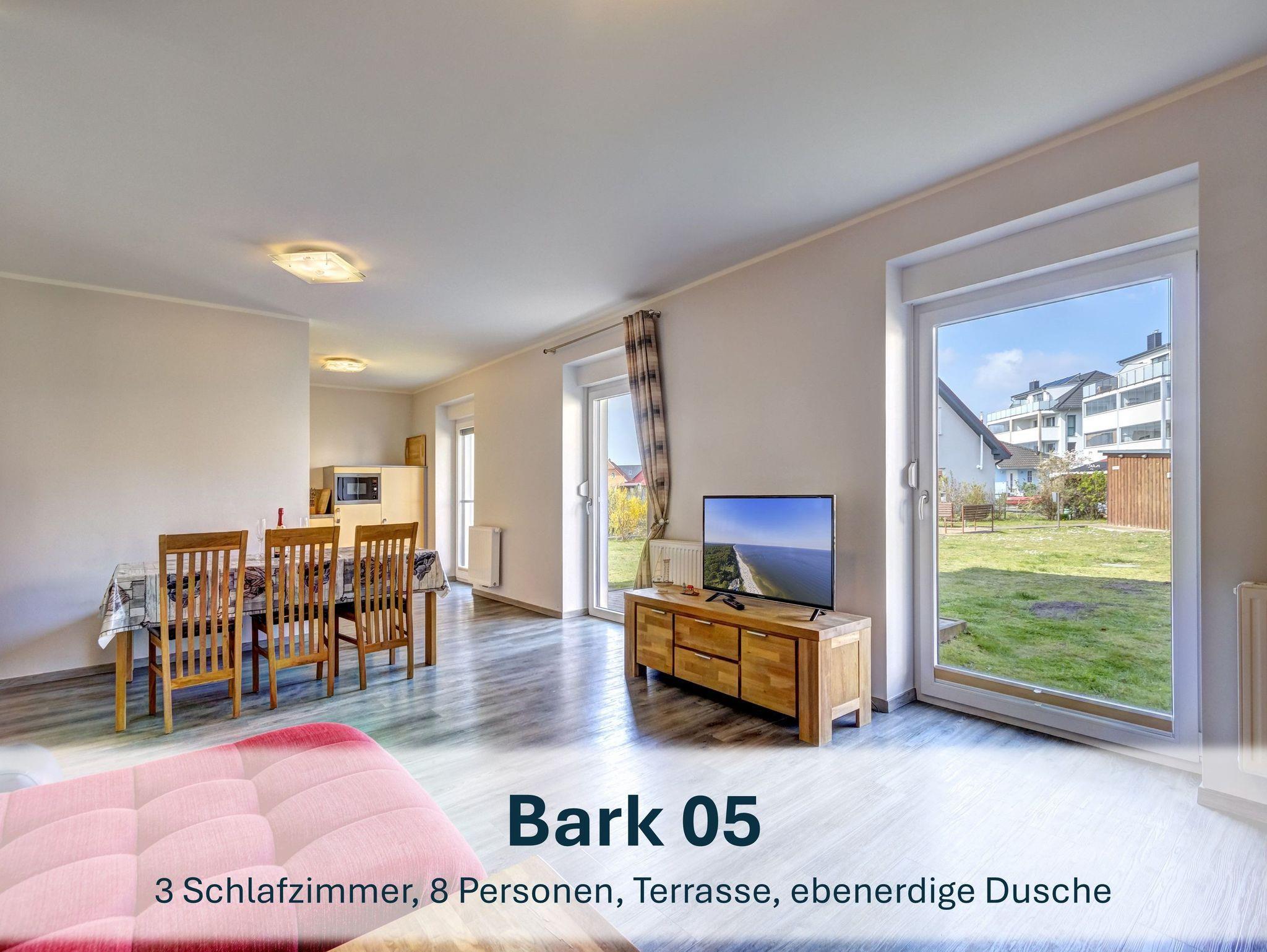 Die gemütliche Ferienwohnung Bark 05 bietet auf einer Ebene ein großzügiges Wohnzimmer mit offener Küche, drei Schlafzimmer, ein modernes Badezimmer sowie eine sonnige Terrasse. Der separate, ebenerdige Zugang macht die Wohnung besonders komfortabel ? auch für Gäste mit eingeschränkter Mobilität.
