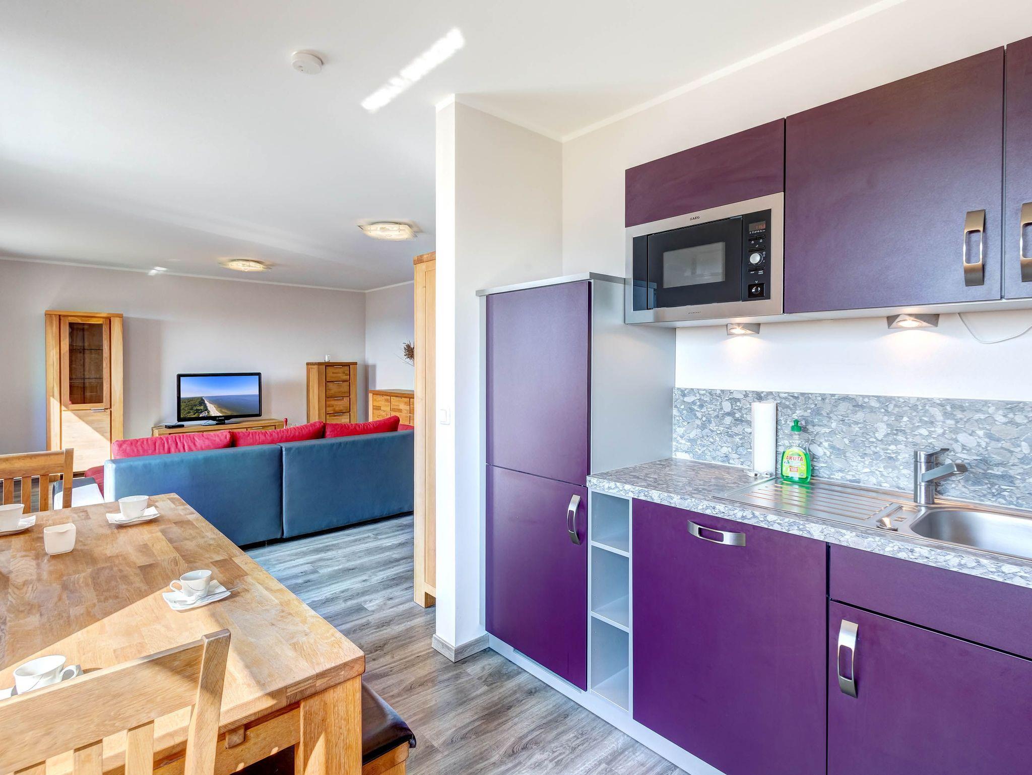 Die offene, voll ausgestattete Küche ist direkt in den Wohnbereich integriert. Von hier aus gelangen Sie auf den Balkon, der Ihnen einen wunderschönen Blick in den Innenhof und bis zum Peenestrom/Bodden bietet - ideal für ein entspanntes Frühstück mit Aussicht.