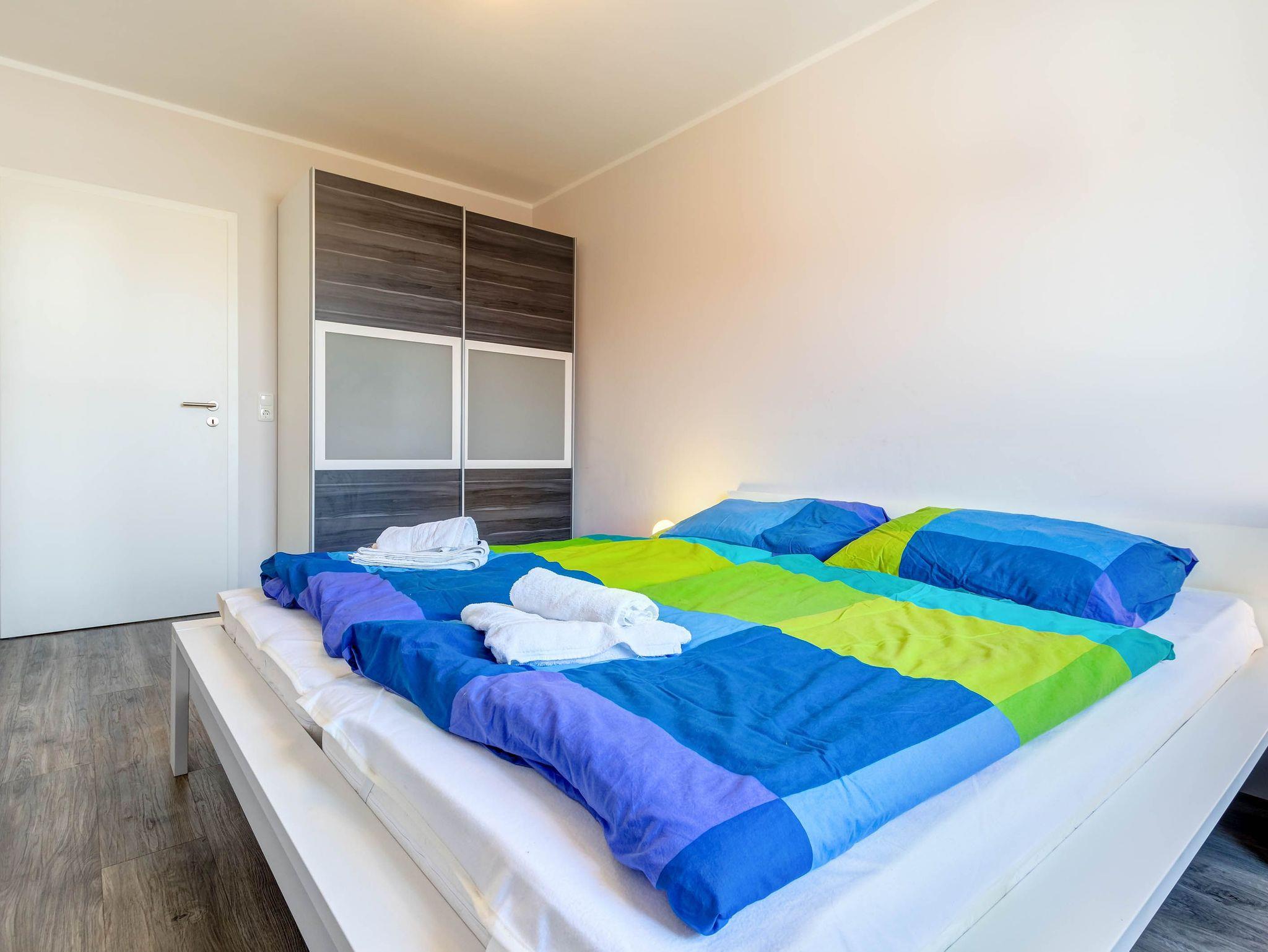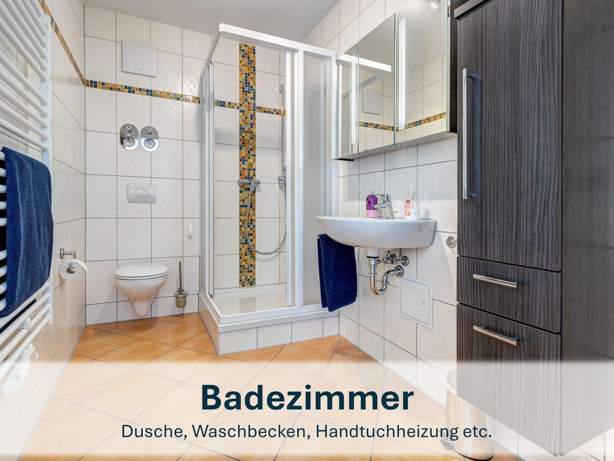 Das Badezimmer ist mit Dusche und WC ausgestattet. Beide Schlafzimmer verfügen über große Kleiderschränke, sodass auch bei längeren Aufenthalten genügend Stauraum vorhanden ist.
