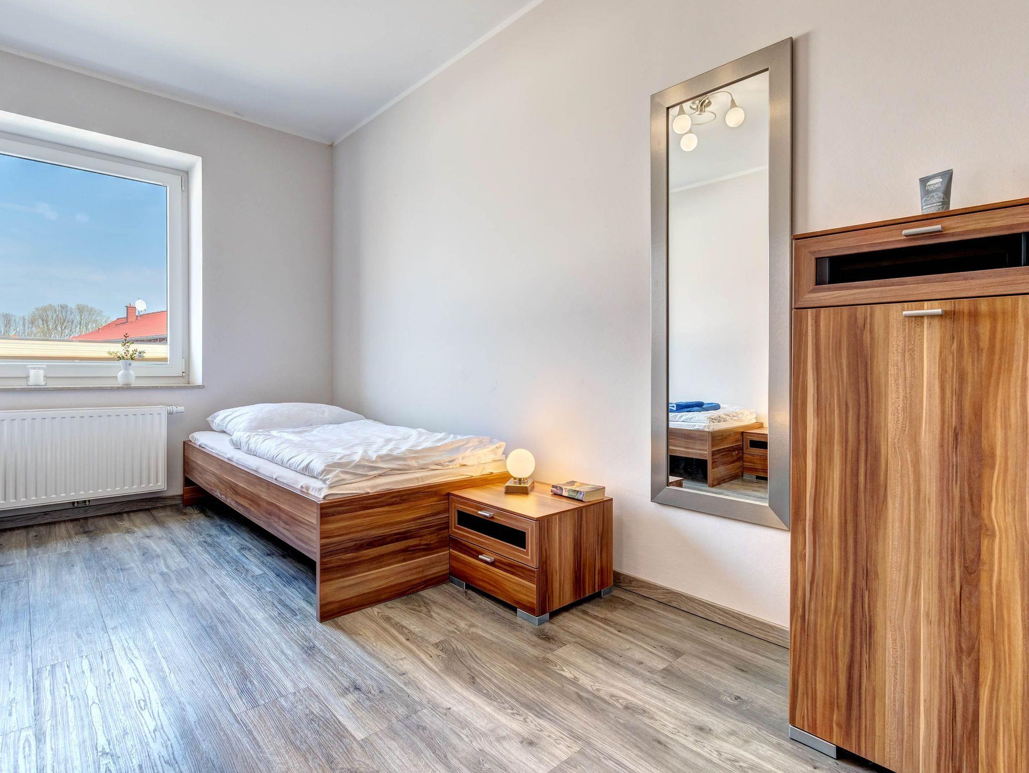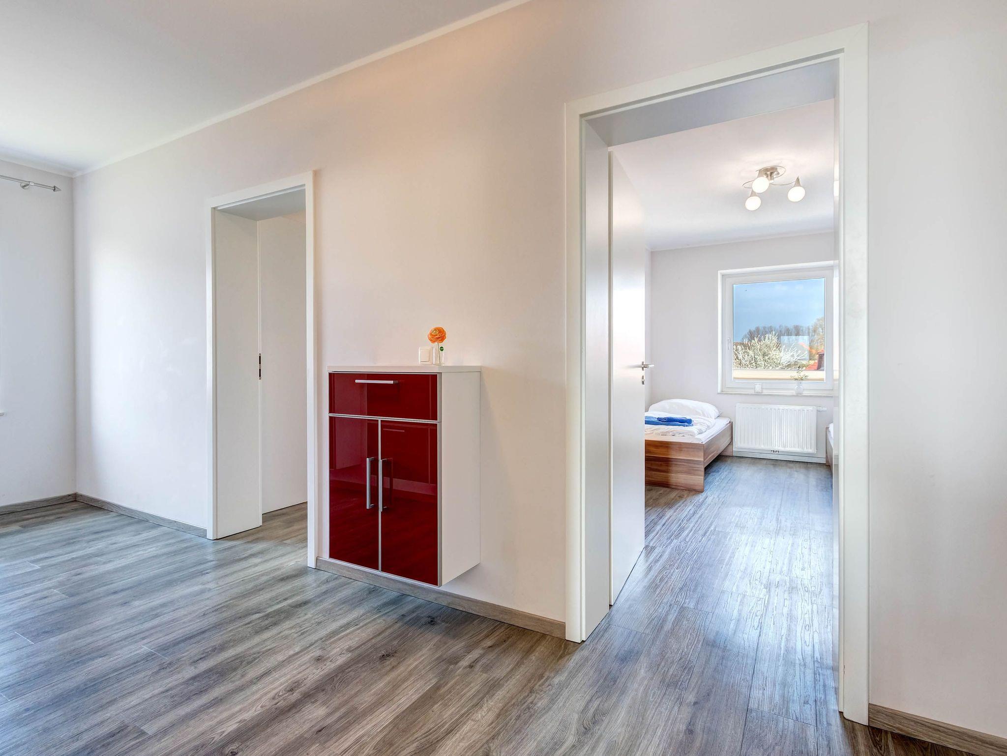 Die Ferienwohnung Nr.6 liegt im Obergeschoss des Hauses und bietet mit 83m² Wohnfläche viel Platz für bis zu 5 Personen und 1 Kleinkind (bis 3 Jahre). Zwei separate Schlafzimmer - eines mit Doppelbett, das andere mit zwei Einzelbetten - sowie ein geräumiger Wohnbereich mit Schlafcouch sorgen für Komfort und Flexibilität, auch für Familien mit Kindern.