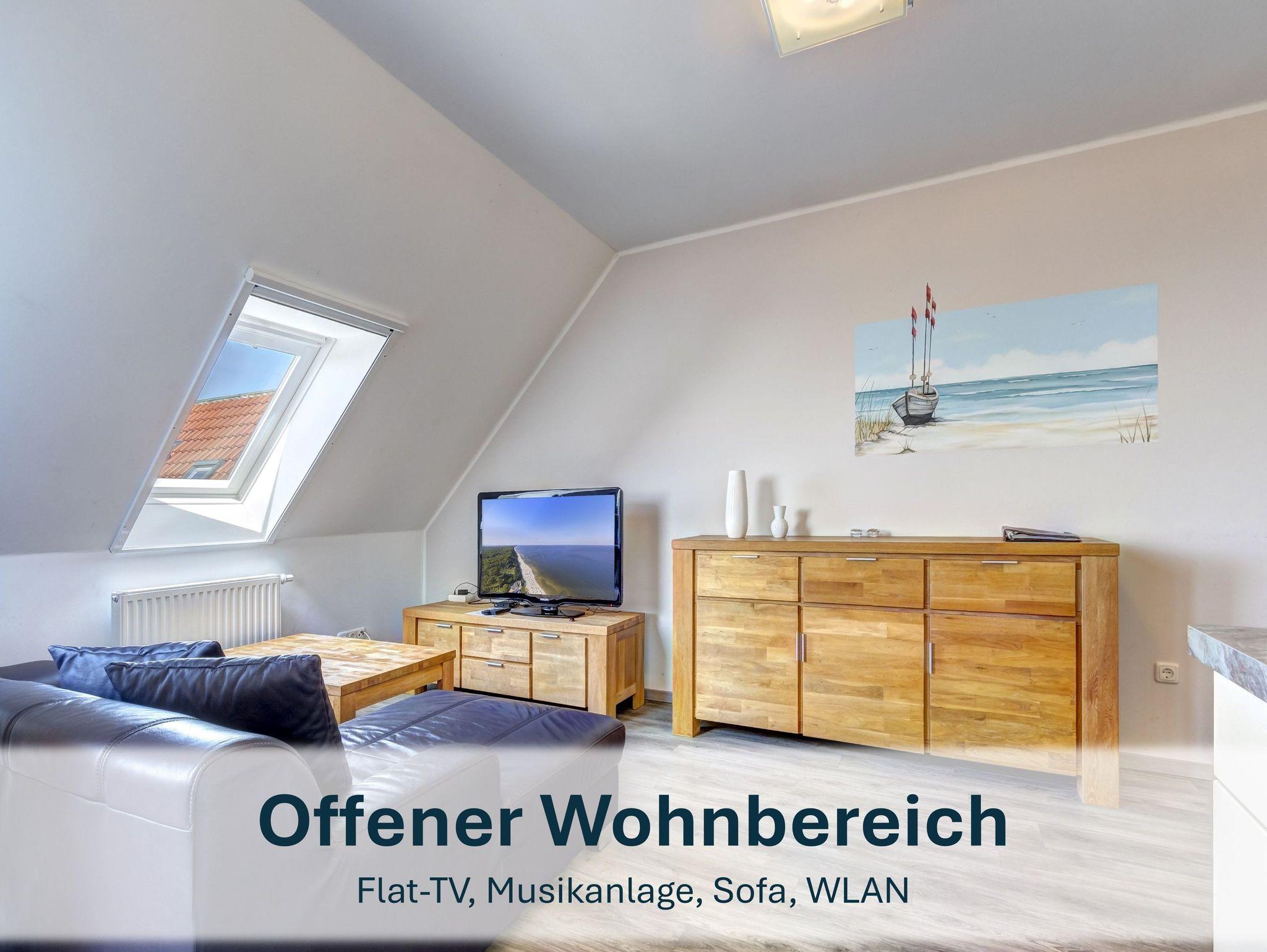 Über eine Treppe im Flur gelangen Sie in den oberen Wohnbereich mit gemütlicher Sitzecke, Essplatz und einer voll ausgestatteten offenen Küche. Vom Wohnbereich aus haben Sie Zugang zum Balkon mit Blick auf den Bodden ? perfekt für ruhige Stunden an der frischen Luft.