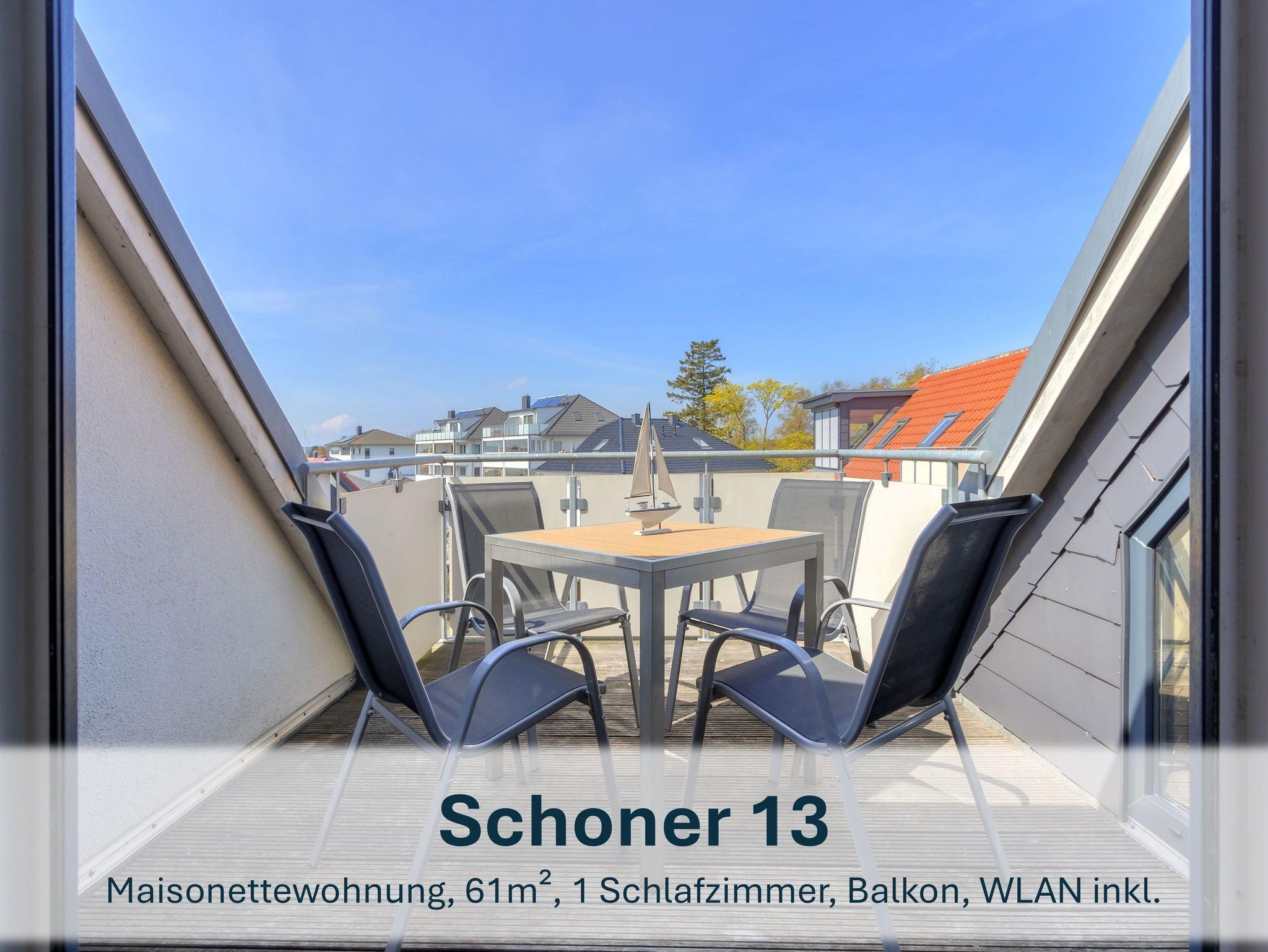 Die 61m² große Maisonettewohnung „Schoner 13“ erstreckt sich über das Ober- und Dachgeschoss des Hauses und eignet sich ideal für bis zu 3 Personen und ein Kleinkind bis 3 Jahre. Im unteren Bereich befinden sich das Schlafzimmer mit Doppelbett und Kleiderschrank sowie das helle Badezimmer mit Fenster und Dusche.