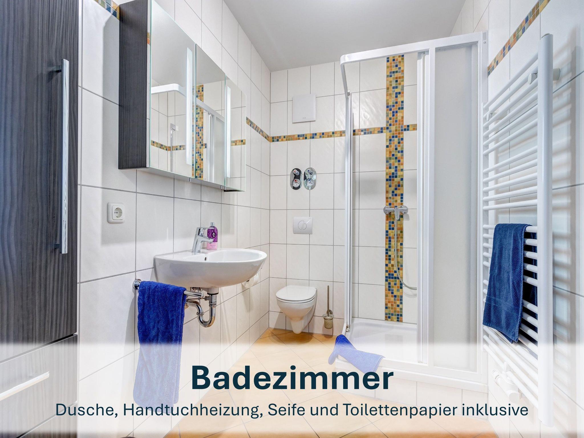 Das modern gestaltete Badezimmer verfügt über eine Dusche, WC und Waschbecken.