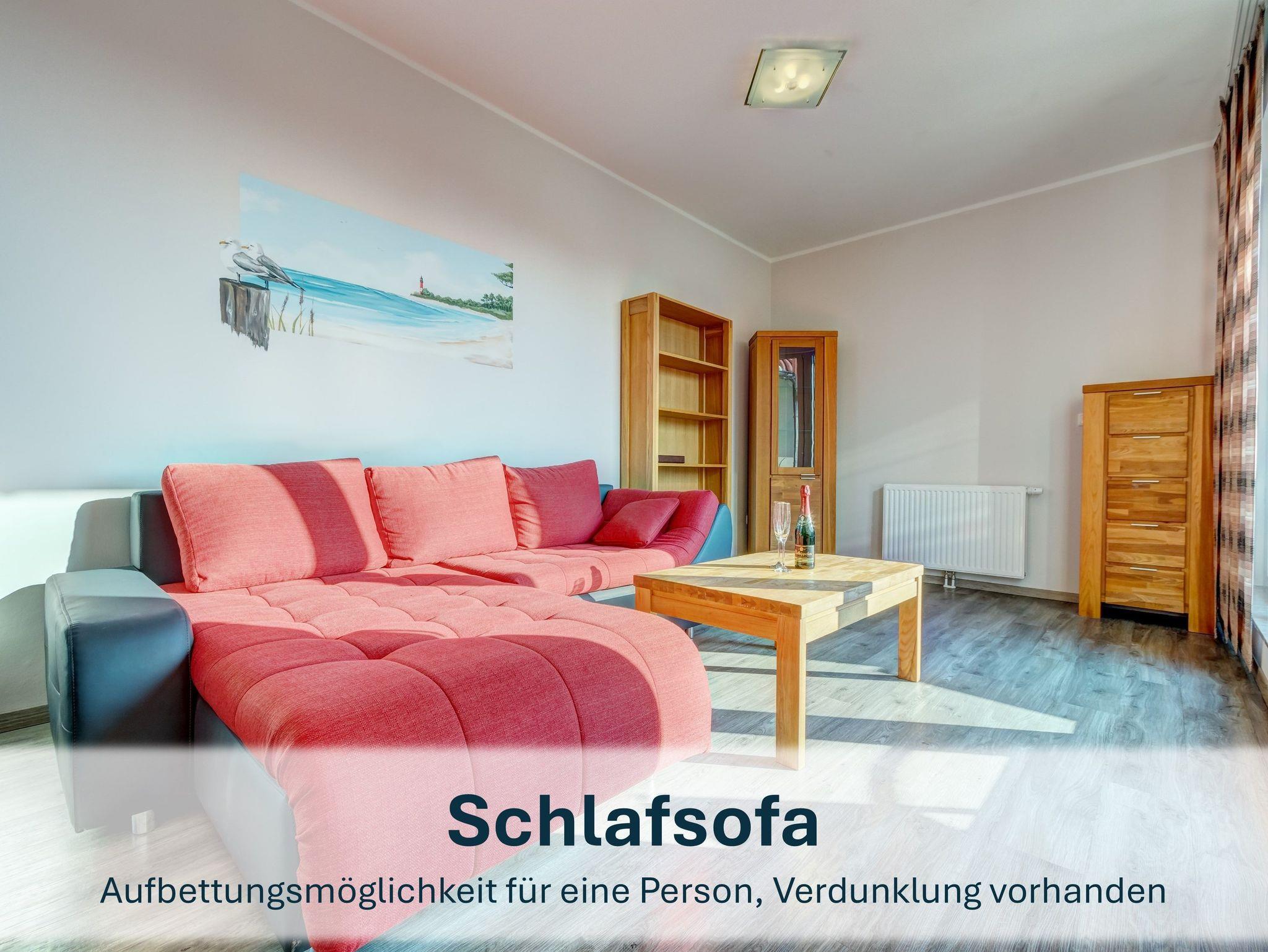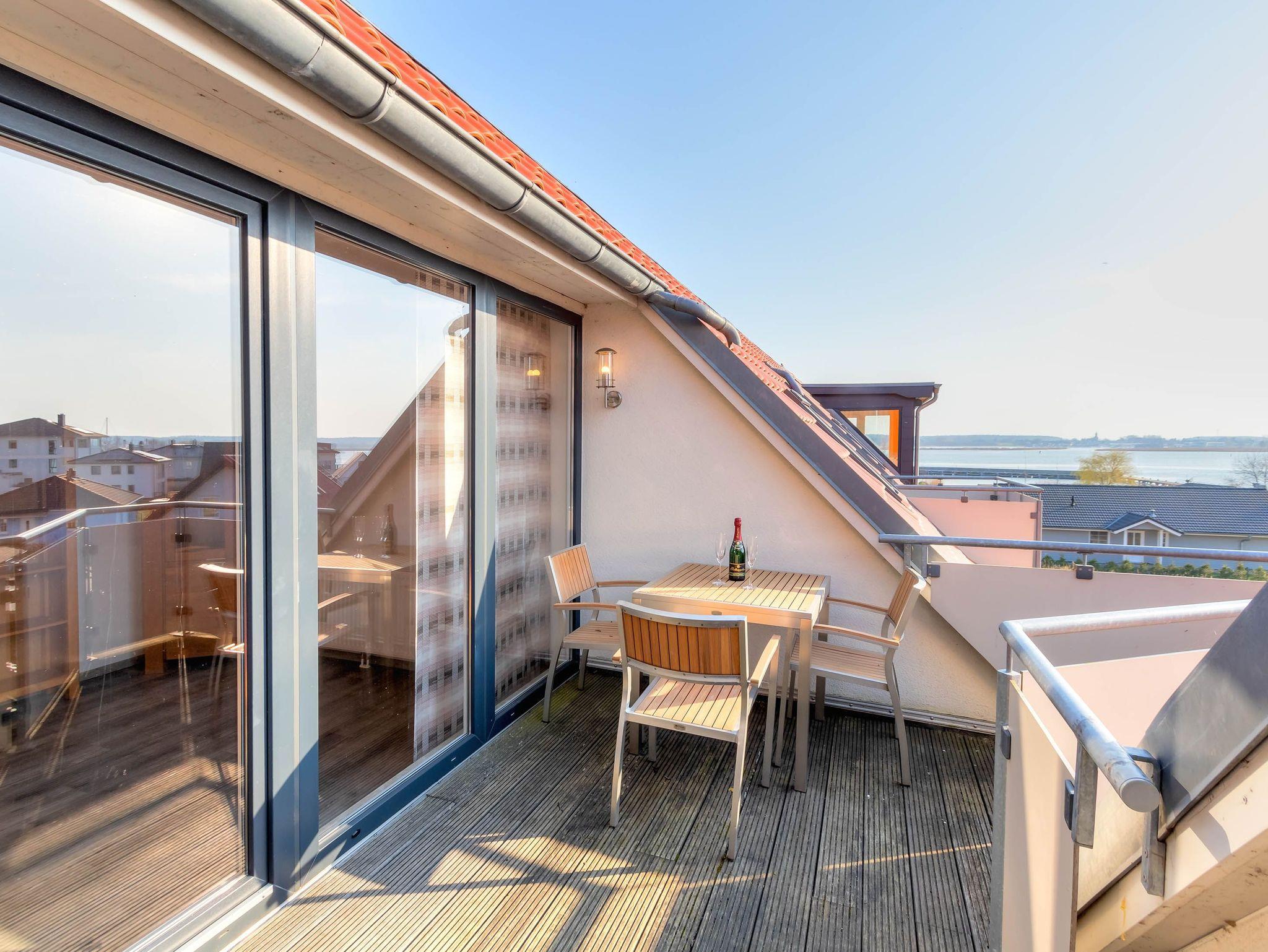Entdecken Sie die stilvolle Maisonettewohnung Kajak 11 in Peenemünde mit großzügigem Wohnbereich und möbliertem Sonnenbalkon.