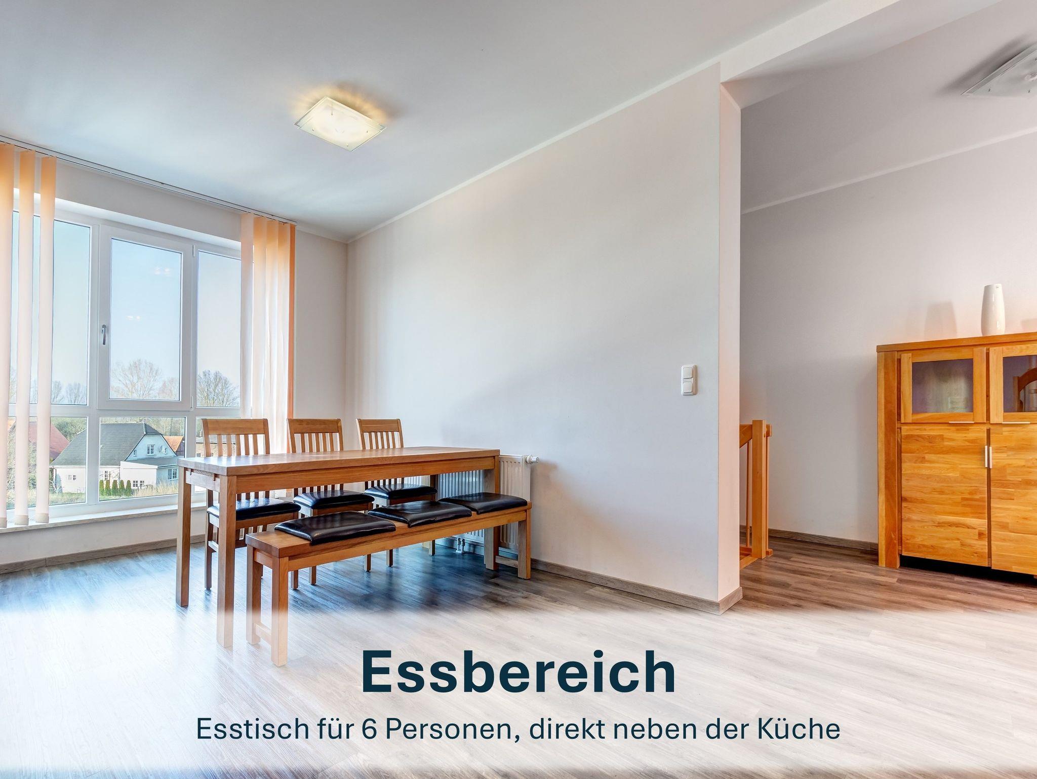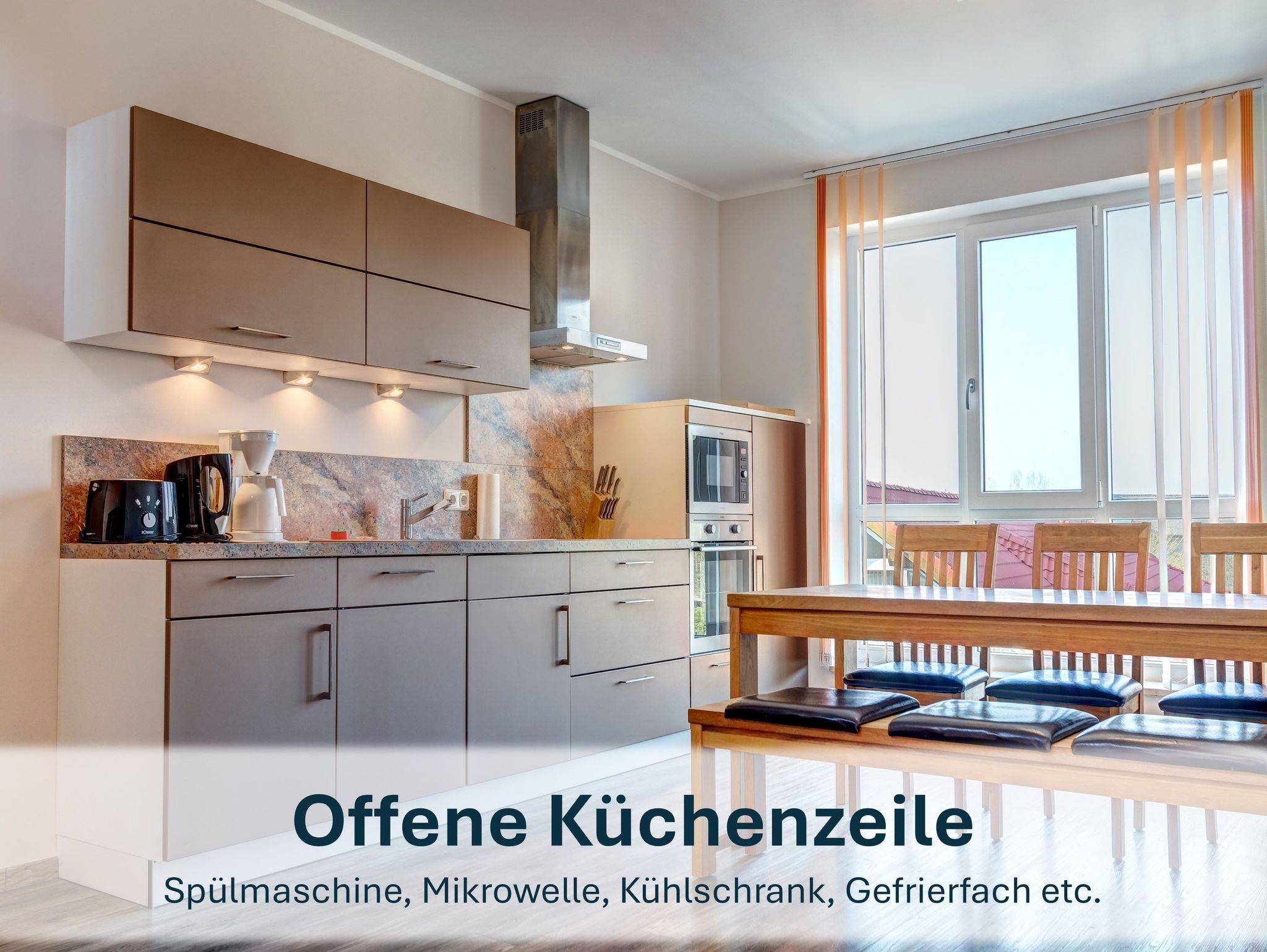 Die offene, voll ausgestattete Küche bietet u.a. Spülmaschine, Ceranherd, Backofen, Kühlschrank mit Gefrierfach, Mikrowelle, Toaster, Kaffeemaschine und Wasserkocher. Am großen Esstisch finden bis zu sechs Personen Platz.