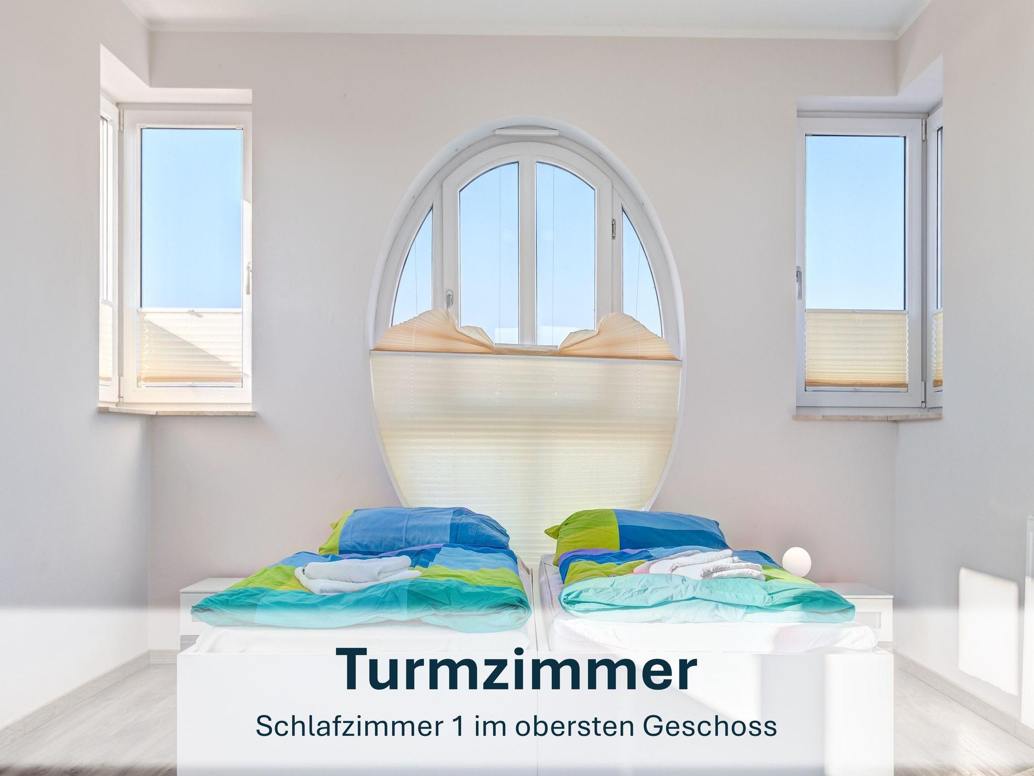 Im Obergeschoss befindet sich ein Schlafzimmer mit zwei Einzelbetten, die zusammengeschoben werden können. Über eine Wendeltreppe erreichen Sie das zweite Schlafzimmer im Turmzimmer ? ebenfalls mit zwei Einzelbetten. Beide Zimmer verfügen über Kleiderschränke.