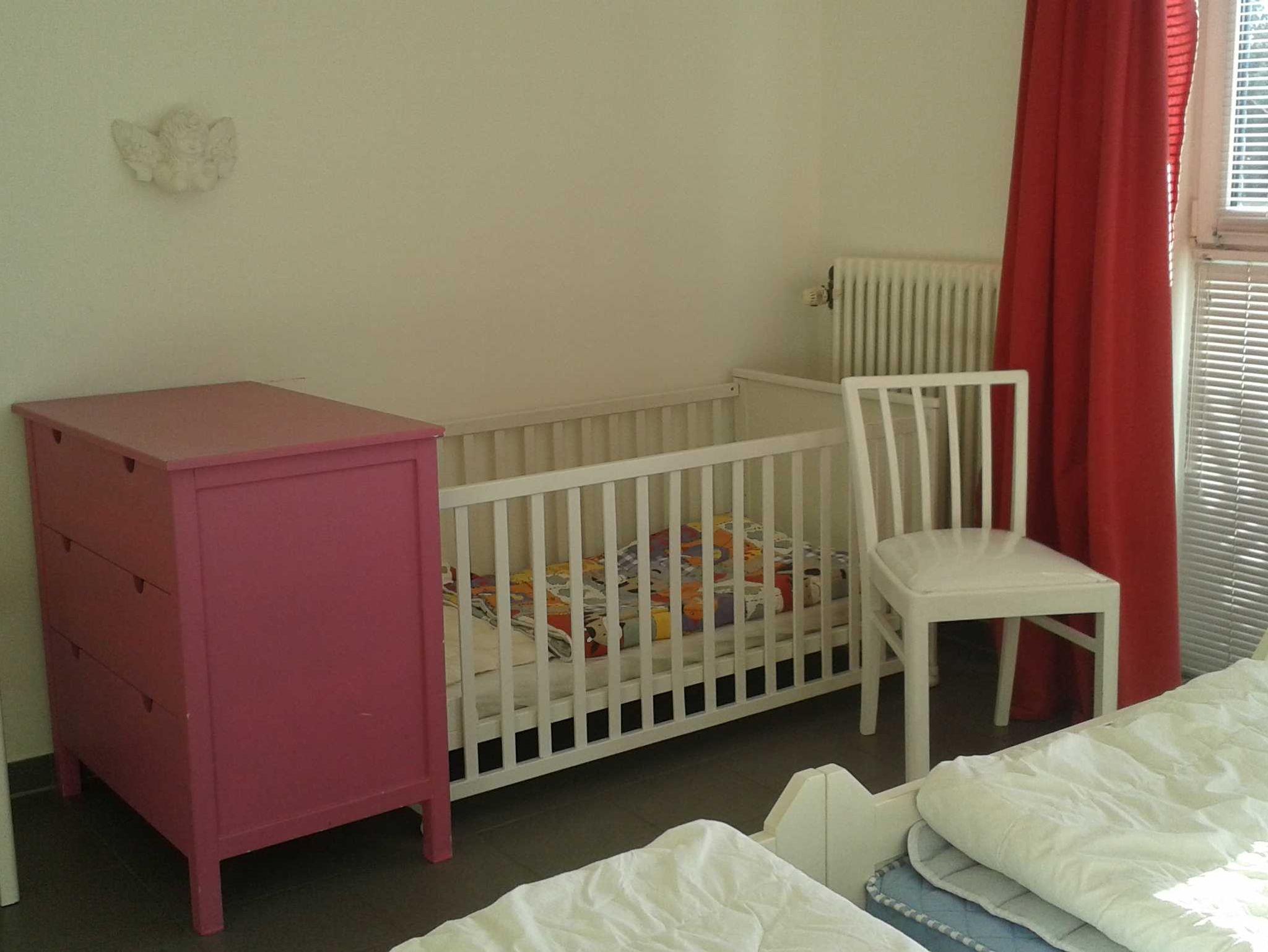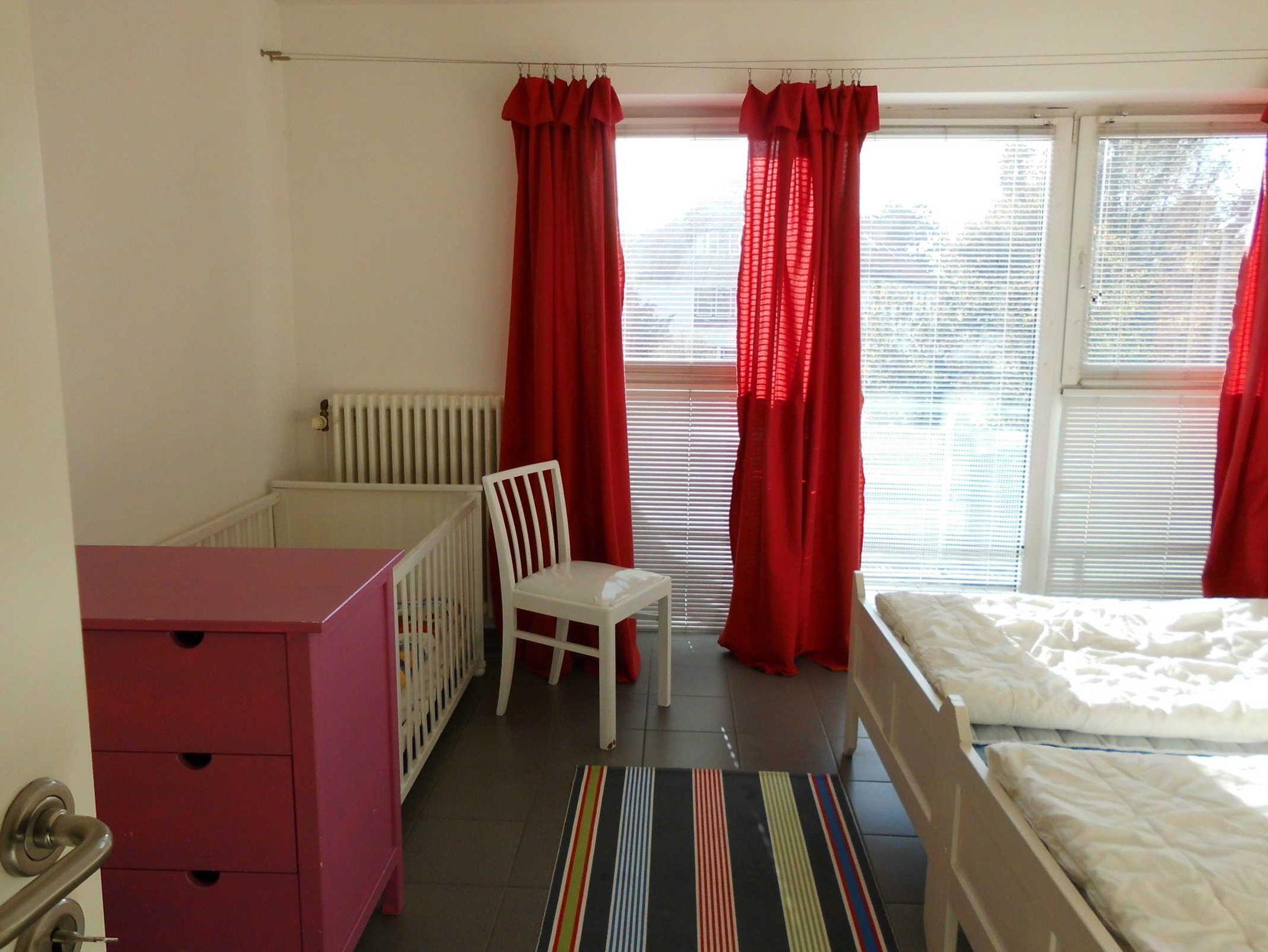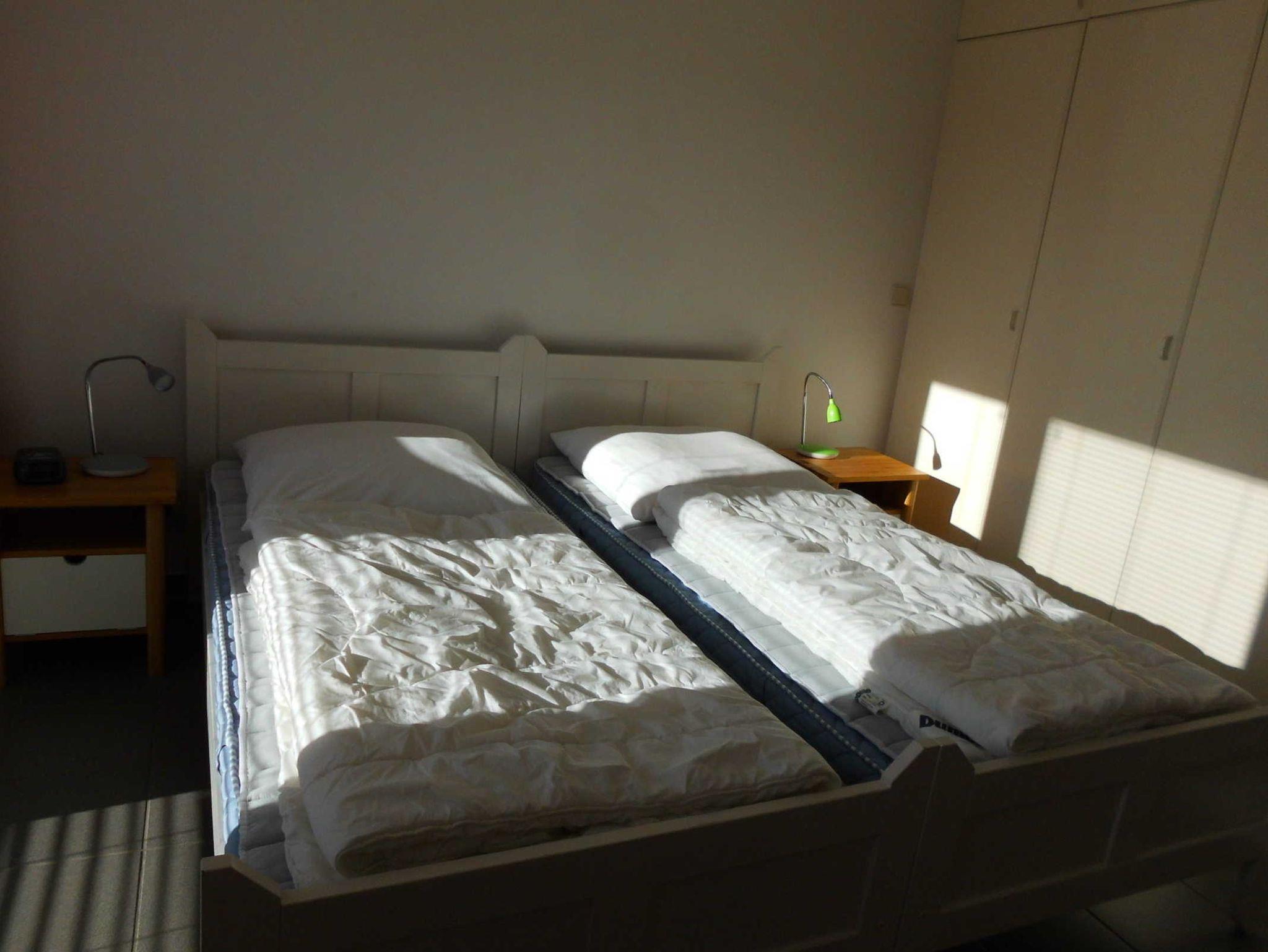 Die gesamte Wohnung ist weiß gestrichen und grau gefliest. Im Flur finden die Gäste einen Einbauschrank für Garderobe und Schuhe. Das Schlafzimmer verfügt über große, weiße Einbauschränke, zwei zusammenstehende Einzelbetten mit Nachtschränkchen, ein Kinderbett, eine Kommode sowie einen kleinen Balkon (mit zwei Stühlen) zur Straße. Das Wohnzimmer ist zum Flur offen und ist folgendermaßen eingerichtet: blaue Schlafcouch mit Federkern