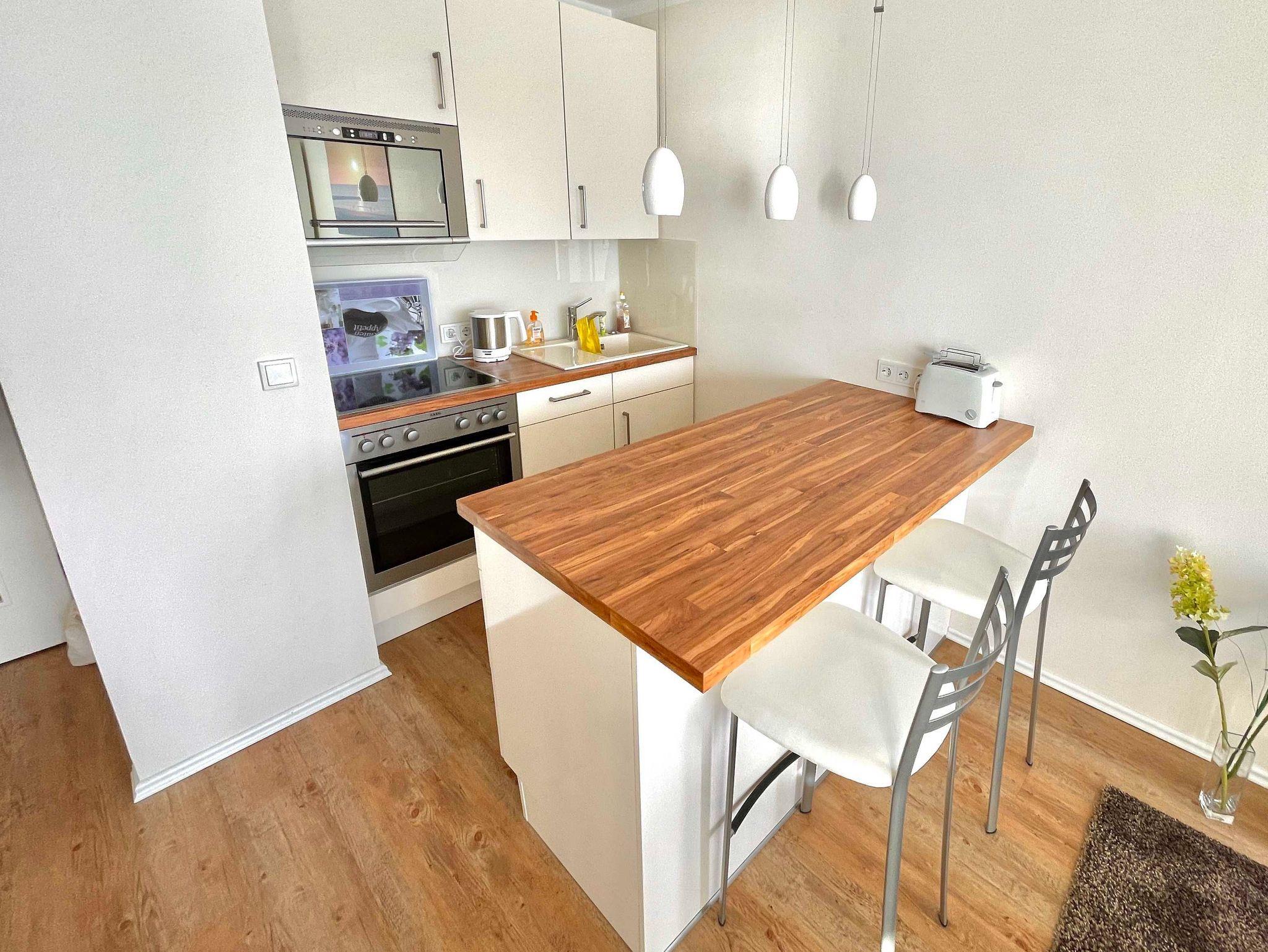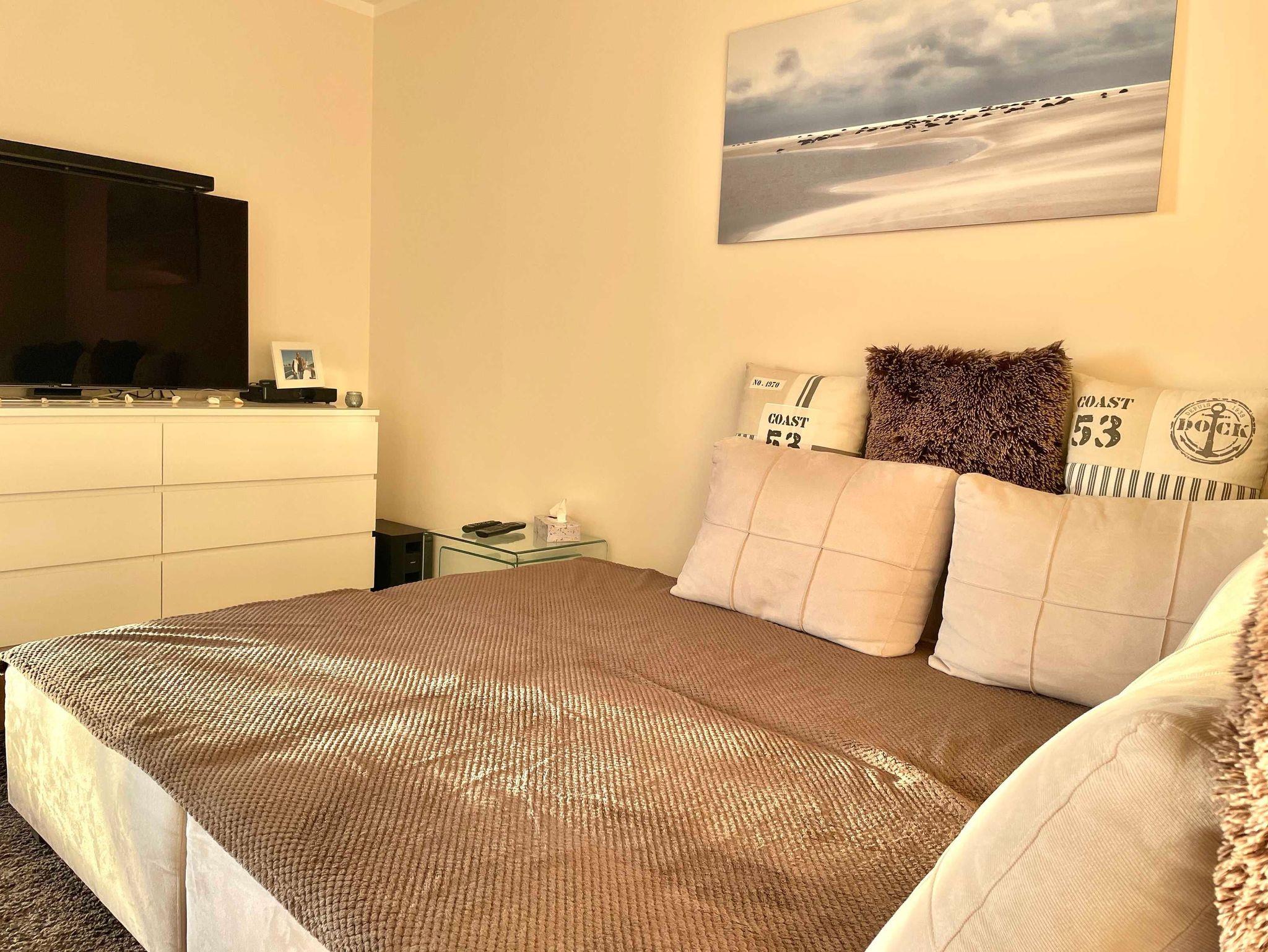 Im kleinen gemütlichen Schlafzimmer blicken Sie vom Bett aus auf die Ostsee. Das Bett (1,60 x 2,00 m) ist in eine gemütliche Nische eingepasst, wie eine Koje auf einer Segeljacht. Vom Bett aus blicken Sie auf die Ostsee. Hier finden Sie außerdem auch einen Kleiderschrank mit viel Stauraum. Im Wohnraum befindet sich ein großes Sofa, welches sich auch zum Schlafen eignet (1,80 x 2,00 m). Vom Sofa aus hat man einen tollen Blick auf den großen 55 Zoll Fernseher, oder auf die Ostsee. Im Wohnraum befindet sich außerdem eine schöne helle Essgruppe und eine voll ausgestattete Küche mit Ceranfeld und 4 Kochstellen, Kühlschrank, Geschirrspüler, Backofen und einer Mikrowelle.