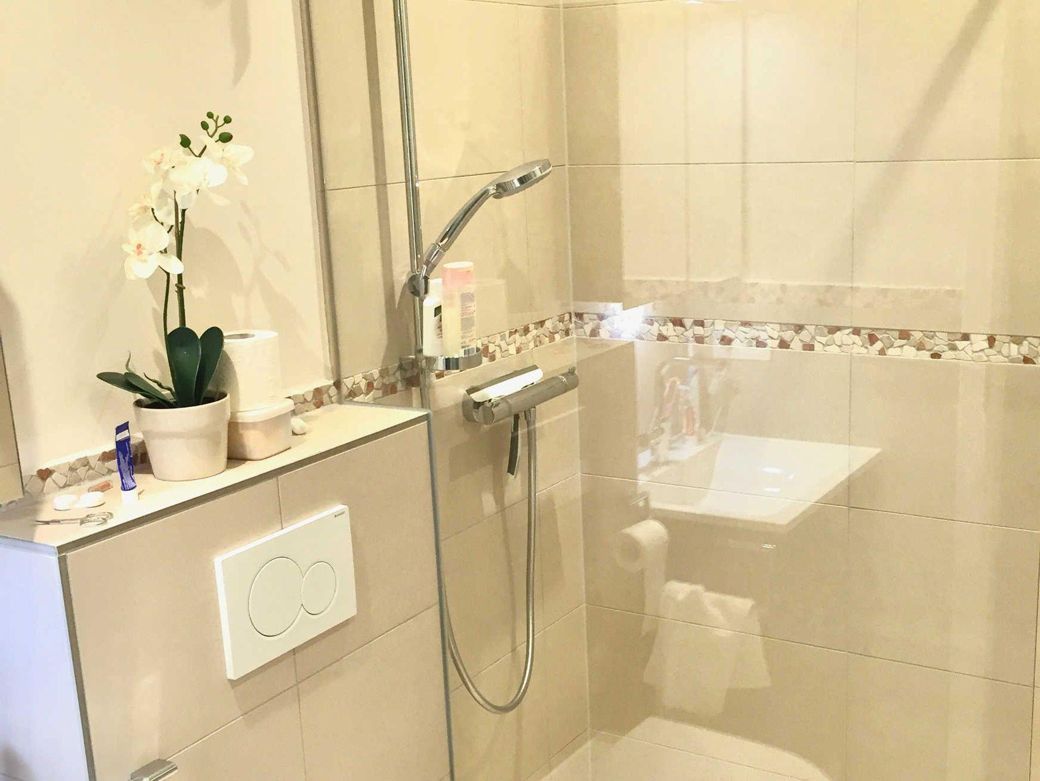 Ein modernes helles Duschbad mit Walk in Dusche machen das Ferienapartment komplett.