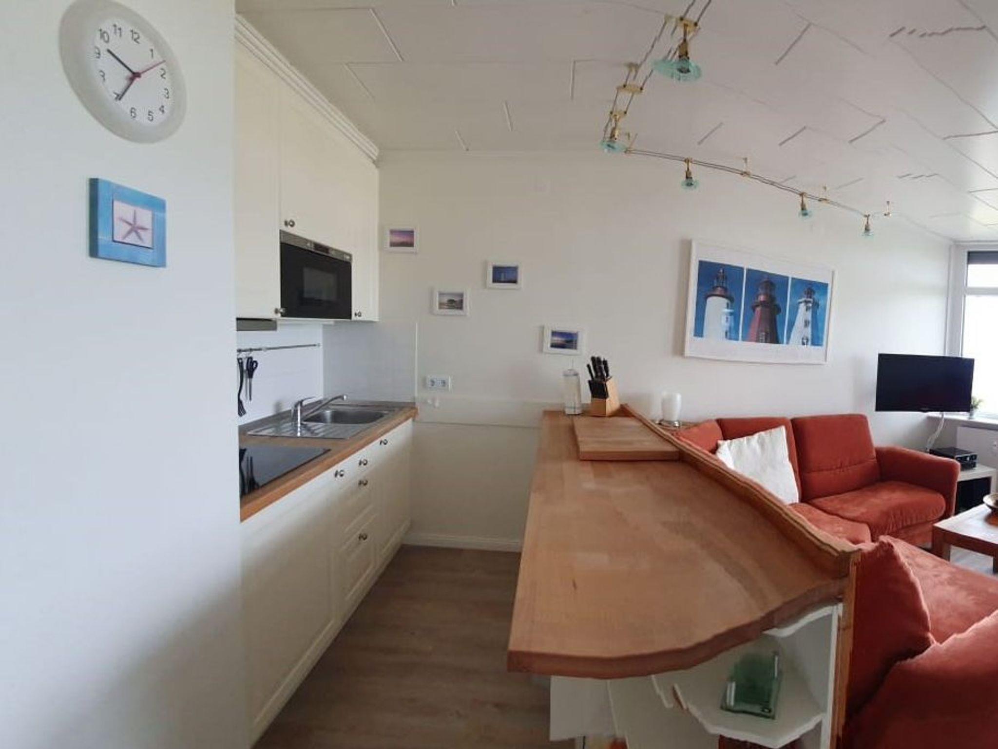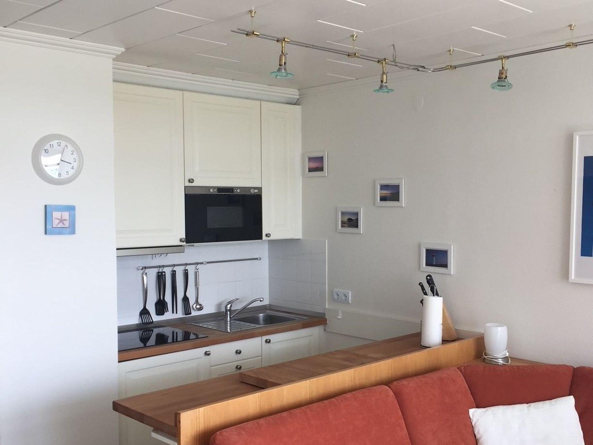 4-Platten-Ceranfeld, Kühlschrank, Spüle, Geschirr und Arbeitsfläche mit Dunstabzug garantieren Kochspaß im Urlaub.