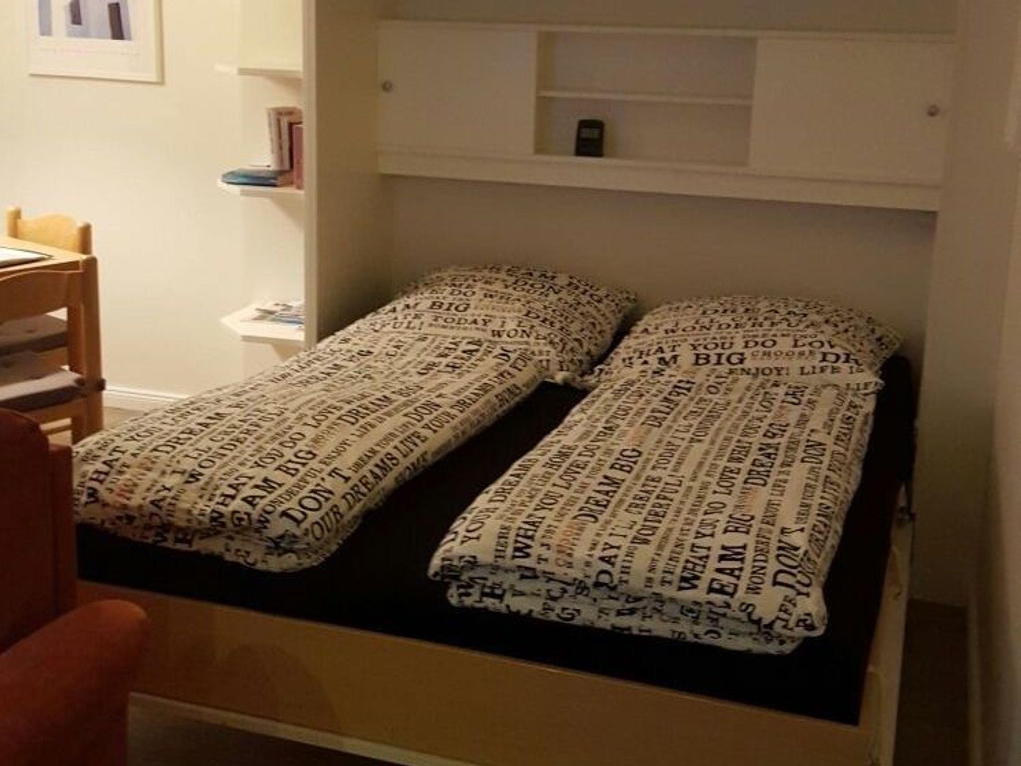 Der Wohnzimmerschrank lässt sich mit schnellem Handgriff in ein komfortables Doppelbett verwandeln, so dass man auch morgens direkt nach dem Aufstehen den Meerblick genießen kann.