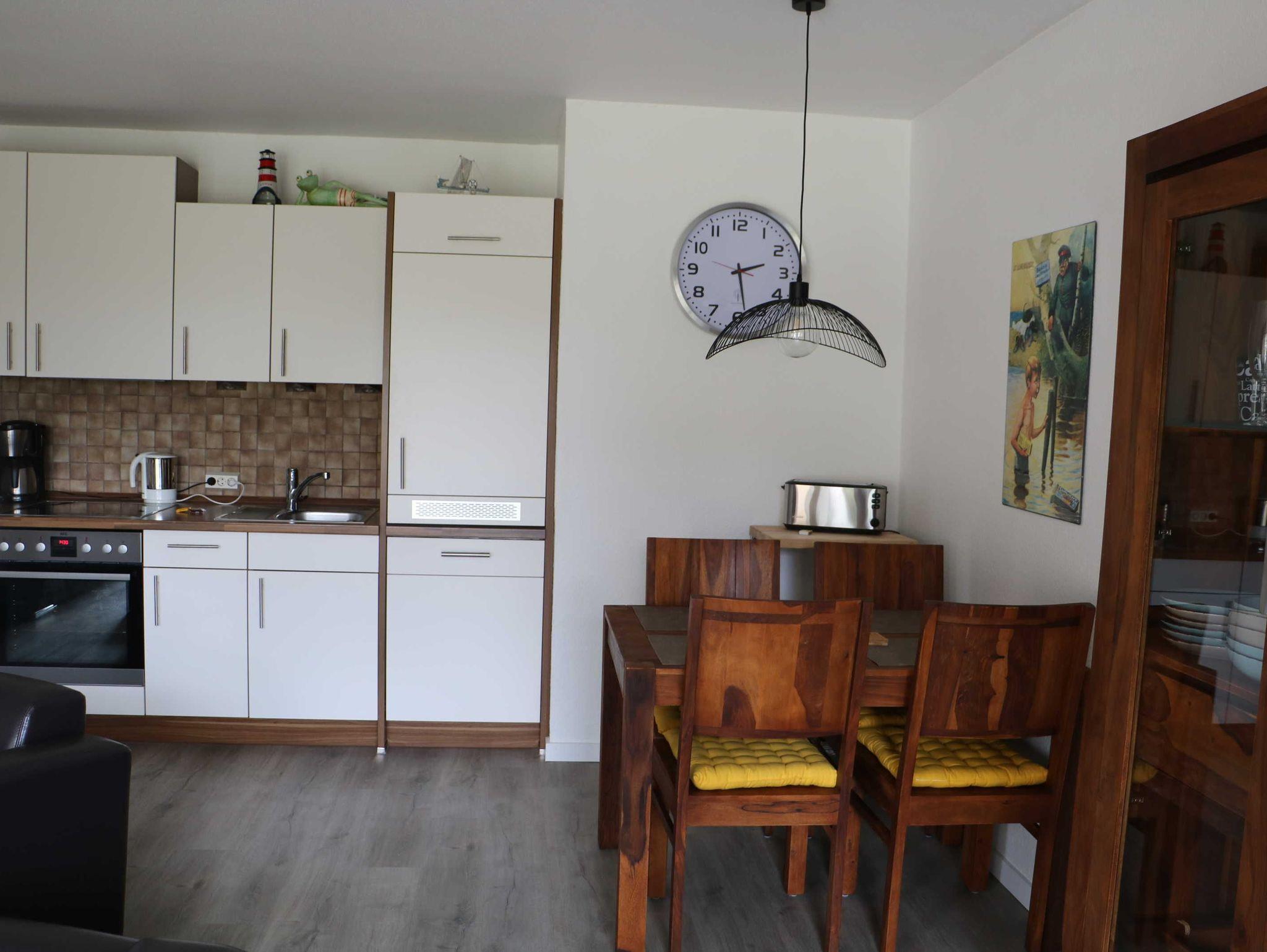 Die gemütliche 2-Zimmer-Wohnung ist zweckmäßig eingerichtet ? das gilt für das Mobiliar, Haushaltszubehör und für die elektrischen Geräte. Die Einbauküche verfügt über einen Geschirrspüler. Im großen Schrank im Flur, sowie in der Kommode im Schlafzimmer, gibt es genug Platz für das Urlaubsgepäck. Hinweis an Senioren: da das Schlafzimmer recht schmal ist, kann man in das 1,60 m breite Bett nur von vorn einsteigen! Als Alternative steht das Schlafsofa im Wohnzimmer zur Verfügung. Von der Terrasse mit Strandkorb hat man den Kinderspielplatz im Garten gut im Blick.