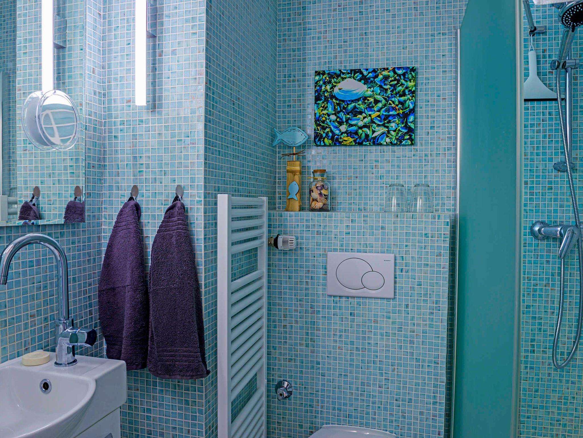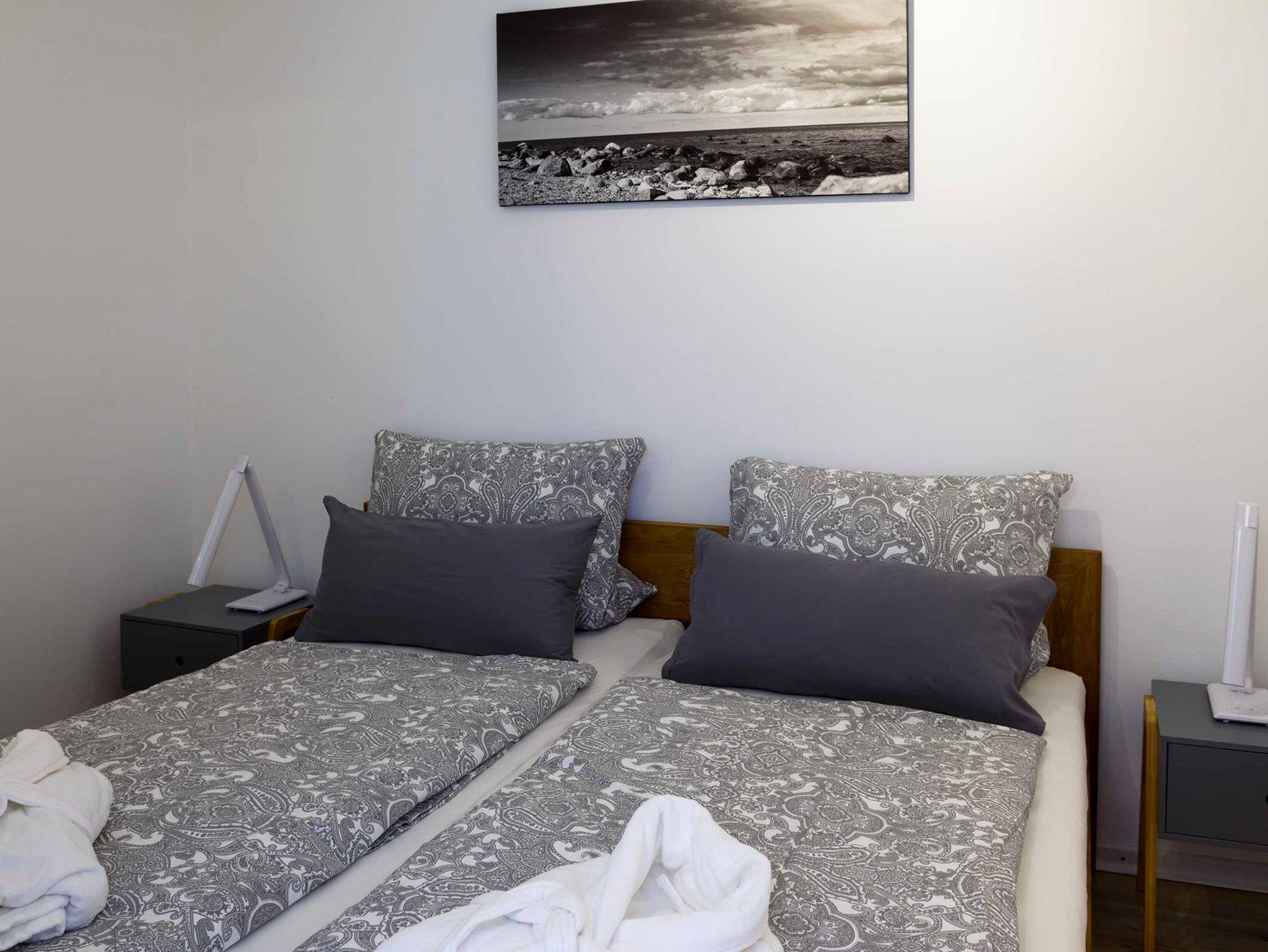 Das Apartment verfügt über ein Schlafzimmer mit einem großen Doppelbett mit geteilten Matratzen sowie über ein modernes Duschbad/WC (mit Fön und Kosmetikspiegel).Ein großes Wäschepaket (Handtücher und Bettwäsche) ist im Preis enthalten.