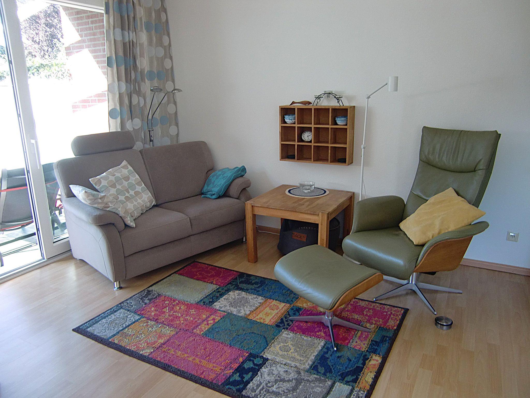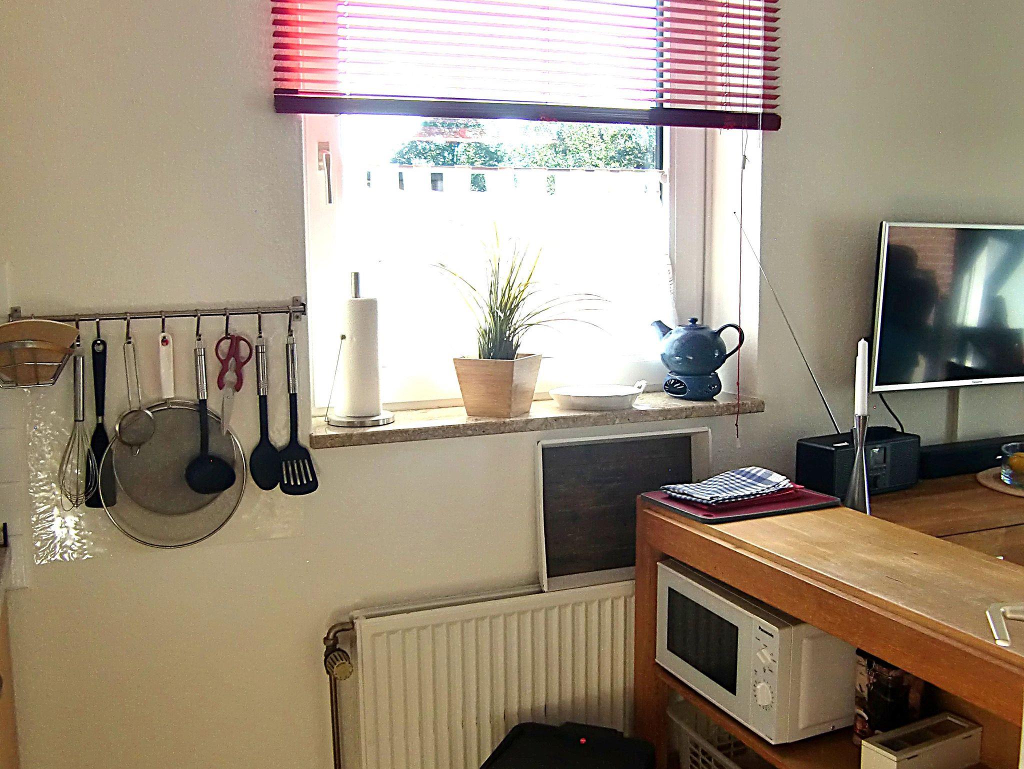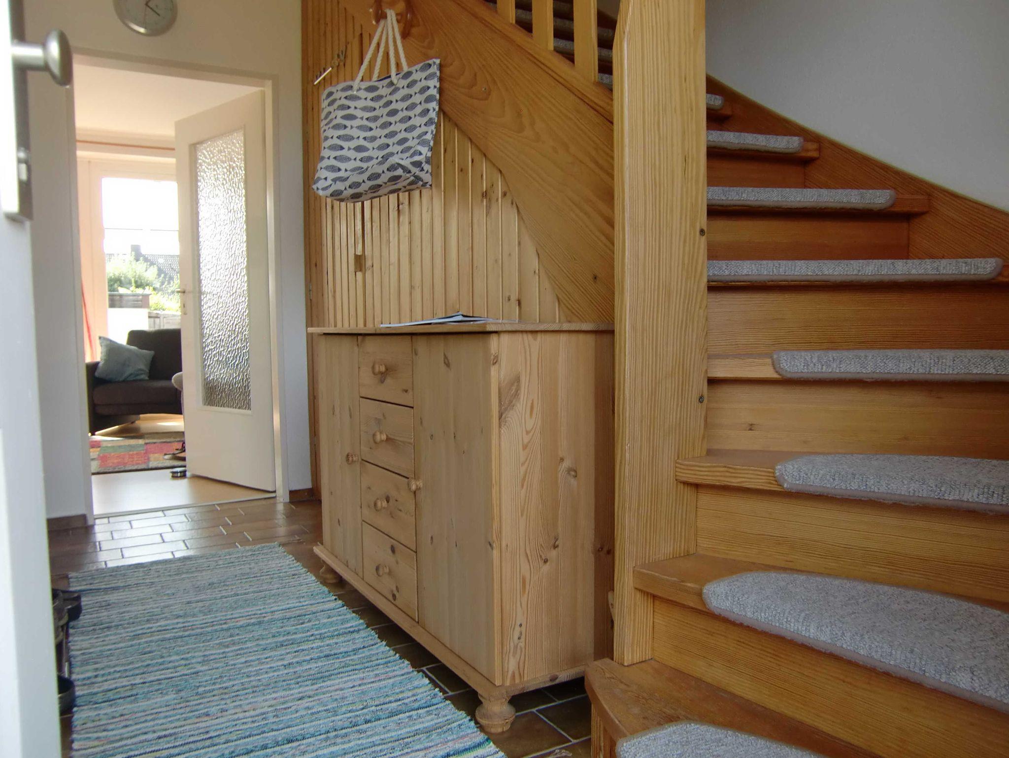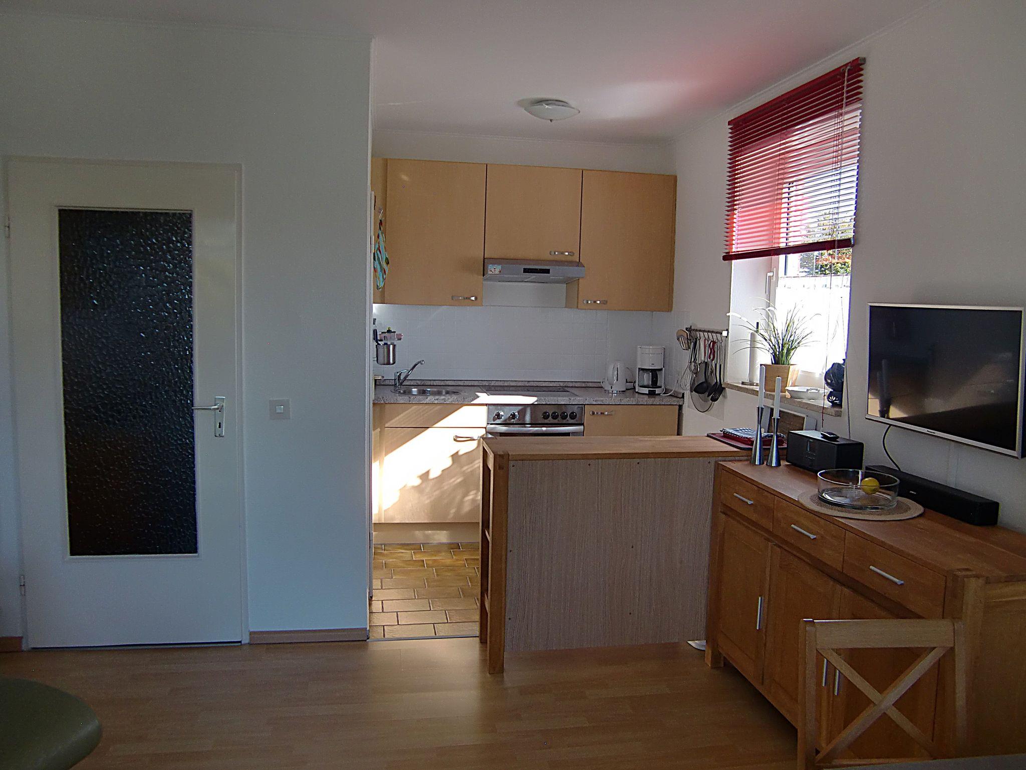Kleines Endreihenhaus (56 m²) über zwei Etagen. Im Erdgeschoss befinden sich das Wohnzimmer mit gemütlicher Sitzecke, Smart-TV, WLAN, Radio, Essecke mit offener Küchenzeile (mit Herd und Backofen) und ein Duschbad/WC.