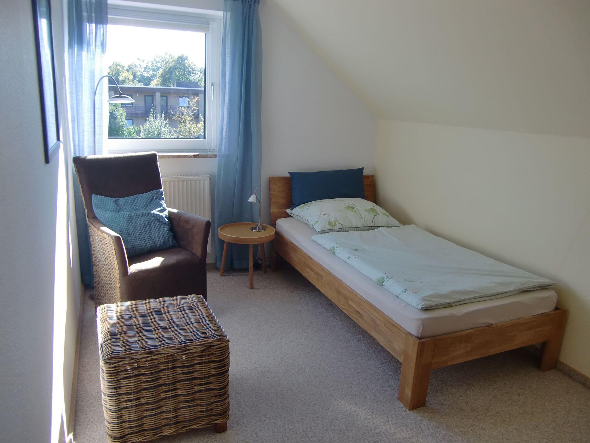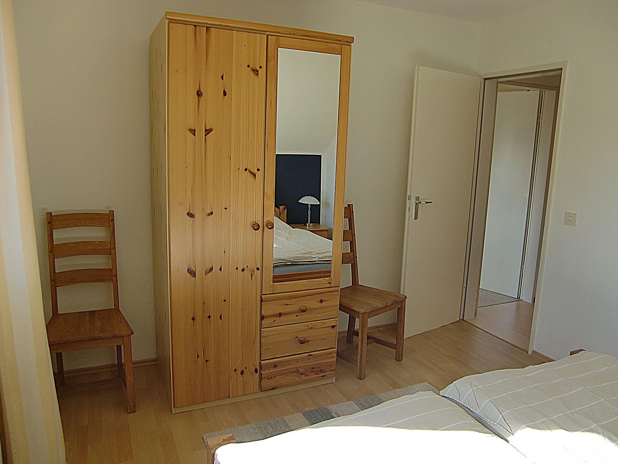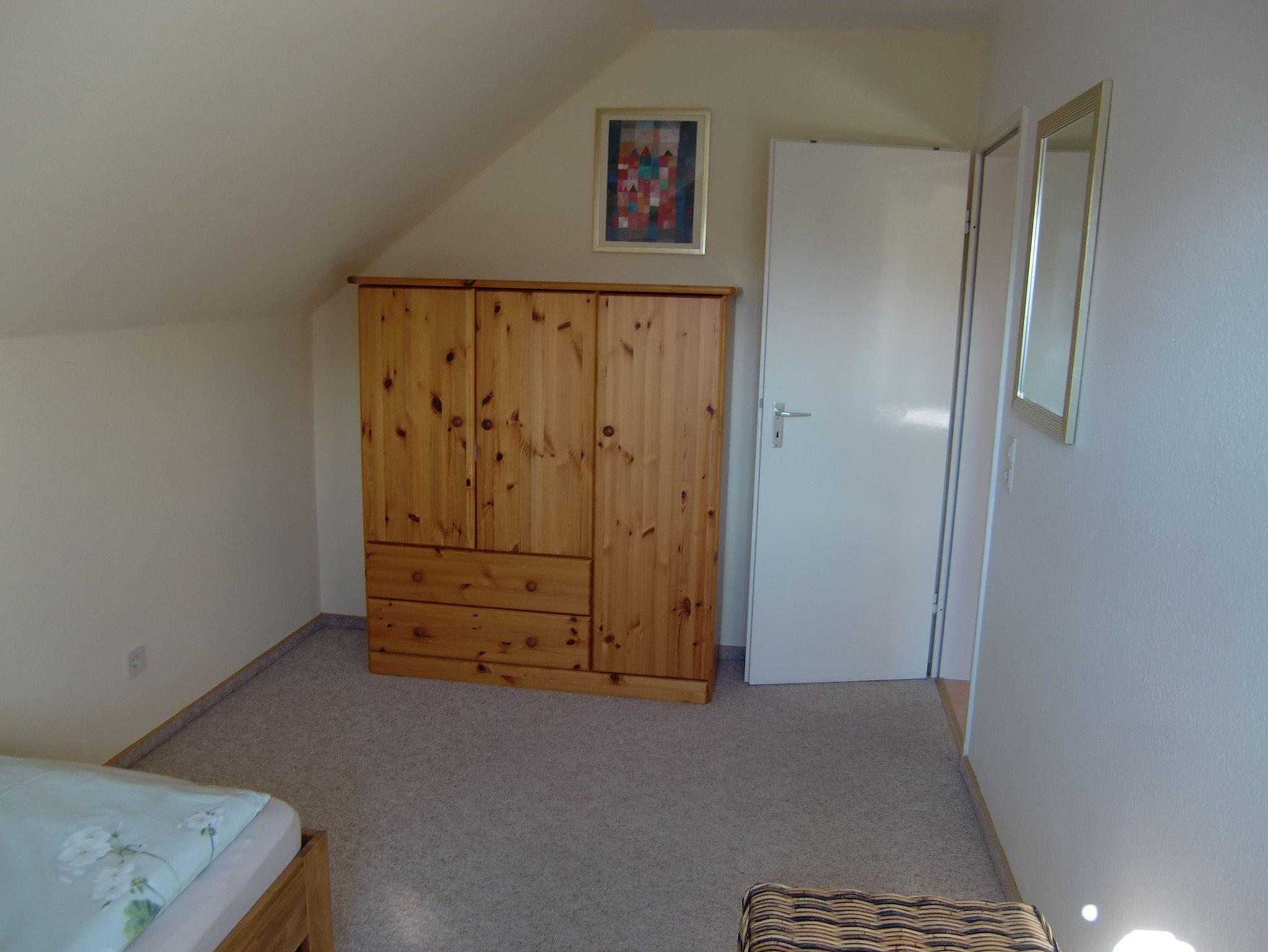 Über eine Holztreppe gelangen unsere Gäste in den Schlafbereich. Ein Schlafzimmer mit Ehebett und Kleiderschrank und ein Schlafzimmer mit einem Einzelbett sind dort vorhanden. Die Betten sind bei Anreise bezogen und die Handtücher liegen bereit.