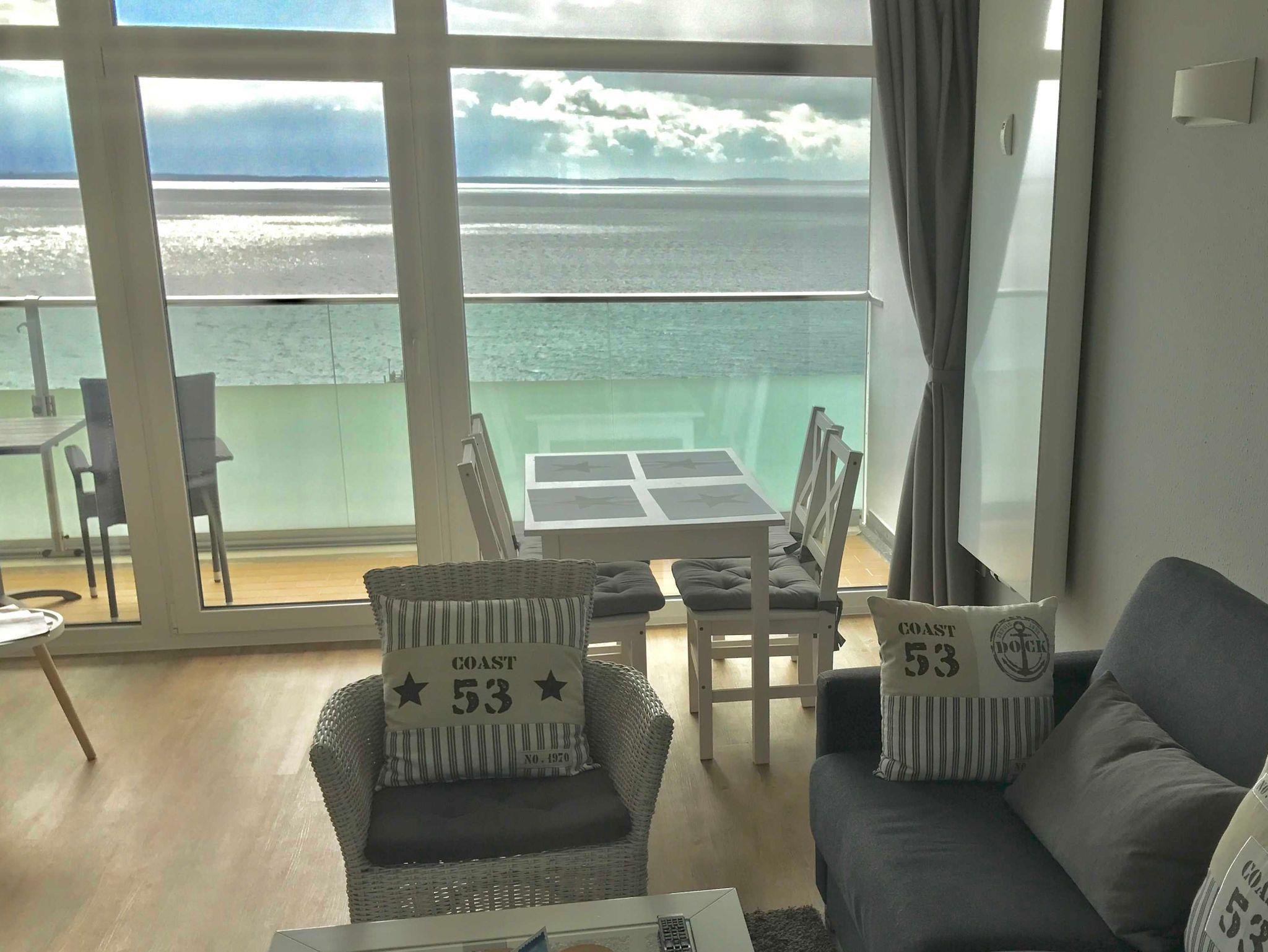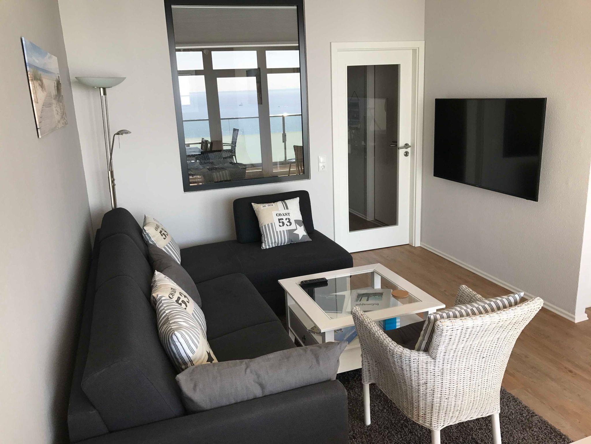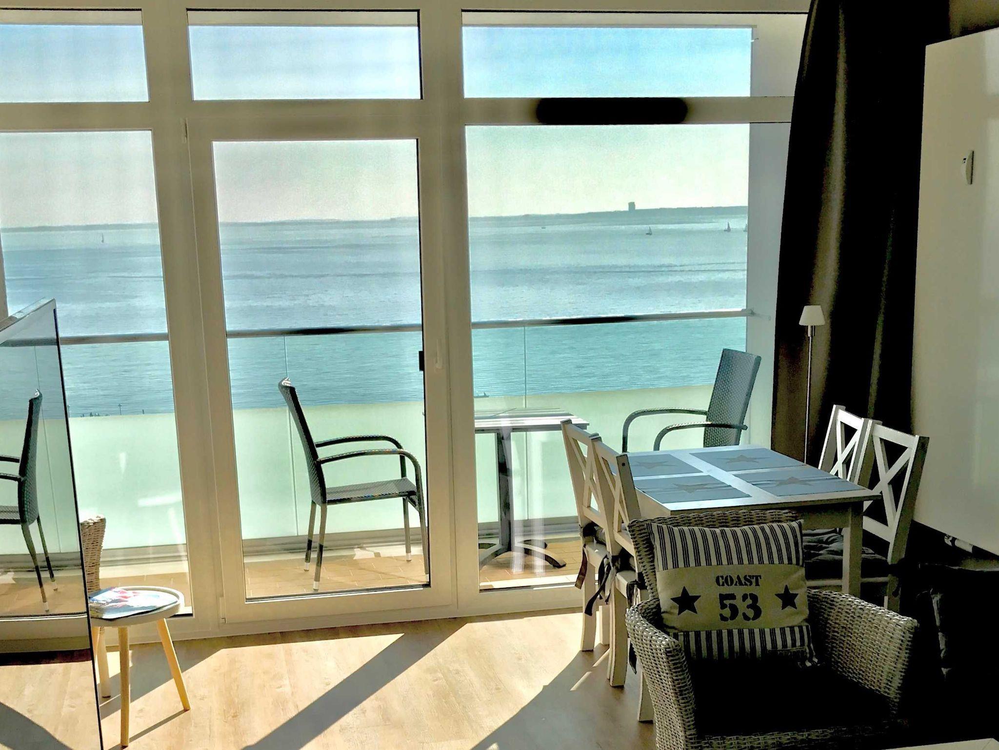 Das geschmackvoll eingerichtete, helle 2-Zimmer-Nichtraucherappartment bietet viel Sonne und einen fantastischen, frontalen Meerblick aus den bodentiefen Fenstern! Das Appartement ist mit hochwertigen Designplanken ausgelegt. Im kleinen Schlafzimmer blicken unsere Gäste vom Bett aus auf die Ostsee. Das Boxspringbett (1,80x 2 m) ist in eine gemütlichen Nische eingepasst, so dass es nicht von der Bettseite, sondern vom Fußende betreten werden muss. So braucht beim Aufstehen nicht über jemanden hinweg geklettert werden. Hier finden sich auch ein Kleiderschrank mit viel Stauraum. Im Wohnraum befindet sich ein großes Sofa, welches mit einem Handgriff in ein Französisches Bett (1,40 x 2 m) umgewandelt werden kann. Vom Sofa aus hat man einen tollen Blick auf den großen 55-Fernseher oder auf die Ostsee. Im Wohnraum befinden sich außerdem eine schöne weiße Essgruppe, 2 gemütliche Sessel am Fenster zum Lesen oder Träumen und eine kleine voll ausgestattete Küchenzeile mit 2 Herdplatten, Kühlschrank und hochwertiger Miele-Mikrowelle. Ein schönes neues Duschbad macht das Appartement komplett. Vom großen Süd-Balkon haben die Gäste einen atemberaubenden Blick über die Lübecker Bucht und den Strand. Falls unsere Gäste eigene Bettwäsche und Handtücher mitbringen möchten: bitte an passende Laken für die durchgehenden Matratzen denken (das Boxspringbett hat einen durchgehenden Topper). Gern können Sie gegen einen kleinen Aufpreis auch unser Wäschepaket nutzen, damit sie sich direkt in die frisch bezogenen Betten legen und unsere Handtürcher nutzen können. Das Wäschepaket beinhaltet 1x Bettwäsche und Laken, 1 Badetuch, 2 kleine Handtücher pro Person und 1 Duschvorleger. Geschirrtücher und Bademantel bringen Sie bitte mit.