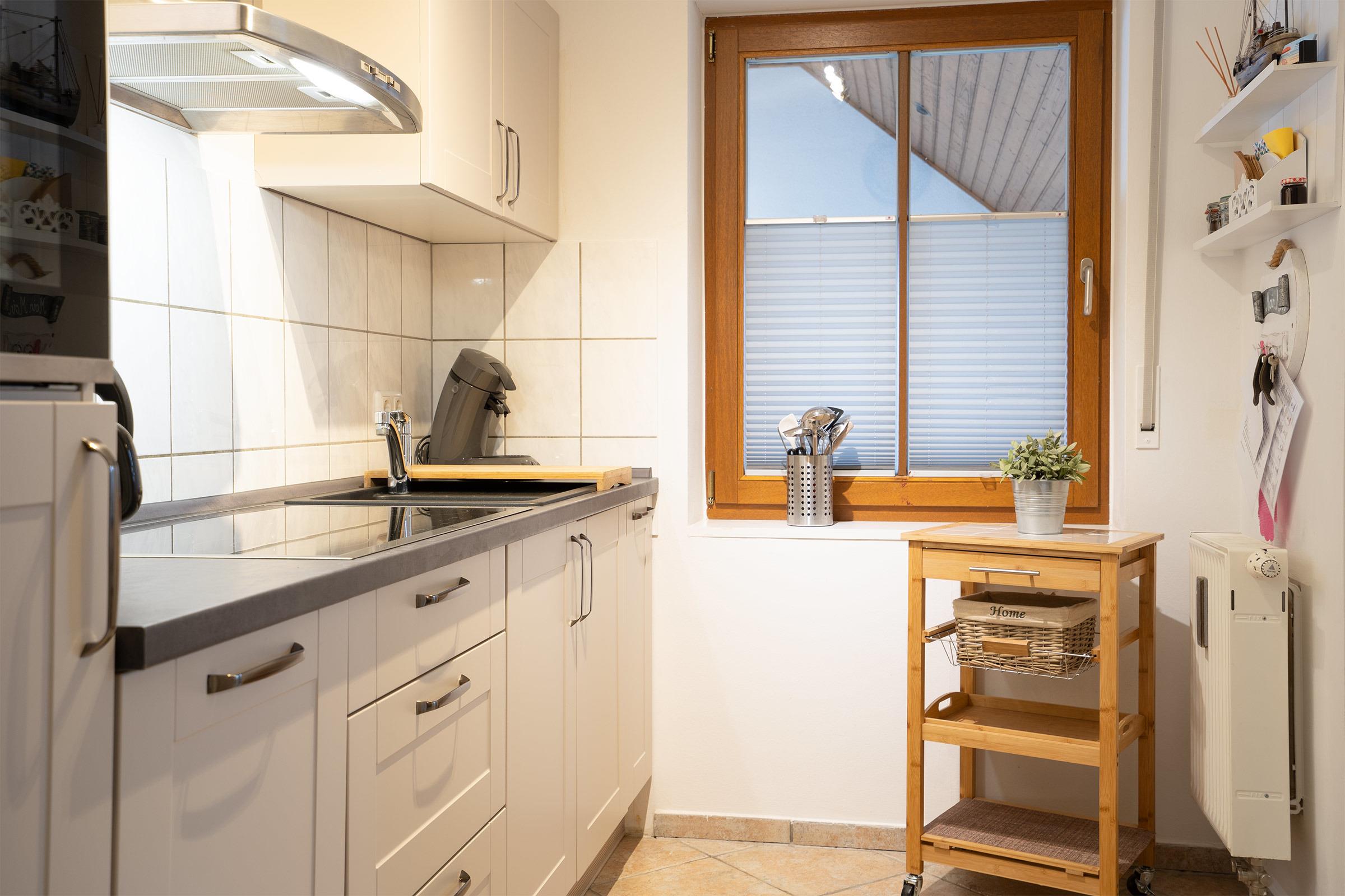 Der Wohnbereich ist gemütlich und großzügig gestaltet: eine komfortable Ledercouch, ein entspannter Fernsehsessel, Flachbild-TV, Radio sowie ein einladender Essplatz. Angrenzend finden Sie die offene, voll ausgestattete Küche mit Geschirrspüler, Kühlschrank, Cerankochfeld und Backofen.
