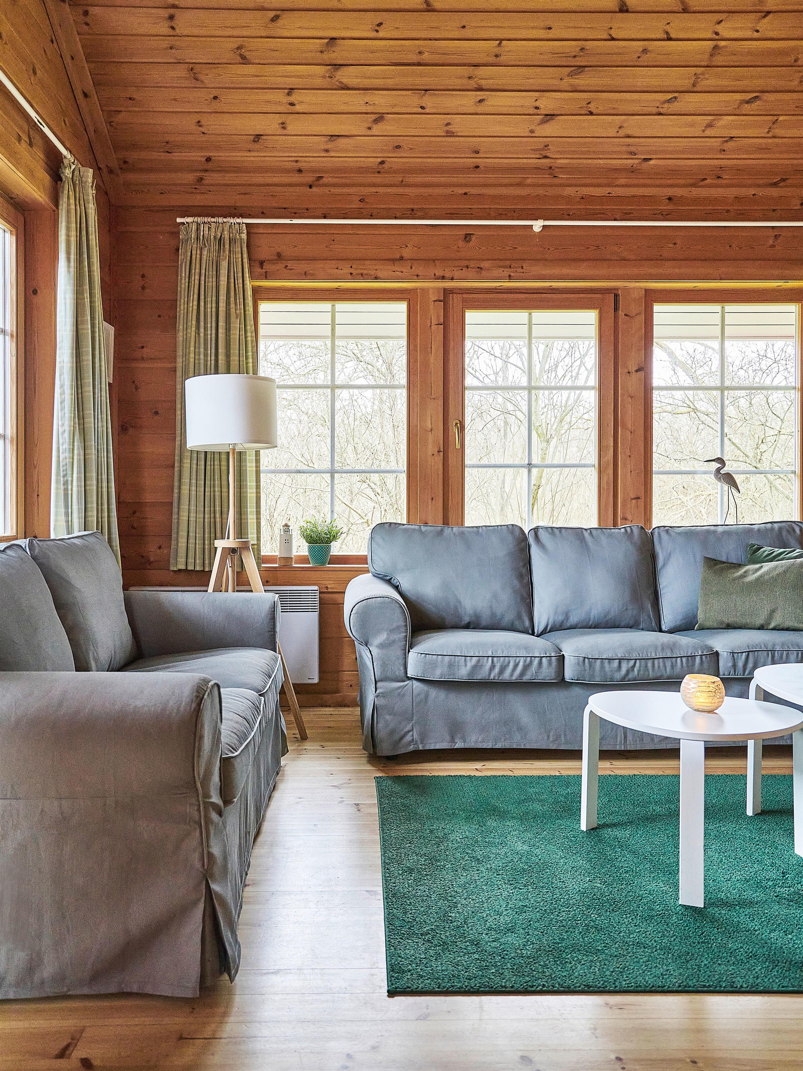 Die Schärenhäuser sind mit drei abgeschlossenen Schlafzimmern für sechs Personen ausgelegt. Die Eichenmöbel sowie die Farben Mint und Grün unterstreichen den frischen Landhausstil der Blockhäuser. Die Chill-Empore lädt exklusiv zum Relaxen ein und ist unter anderem mit einem extra Fernseher und Sitzsäcken ausgestattet.