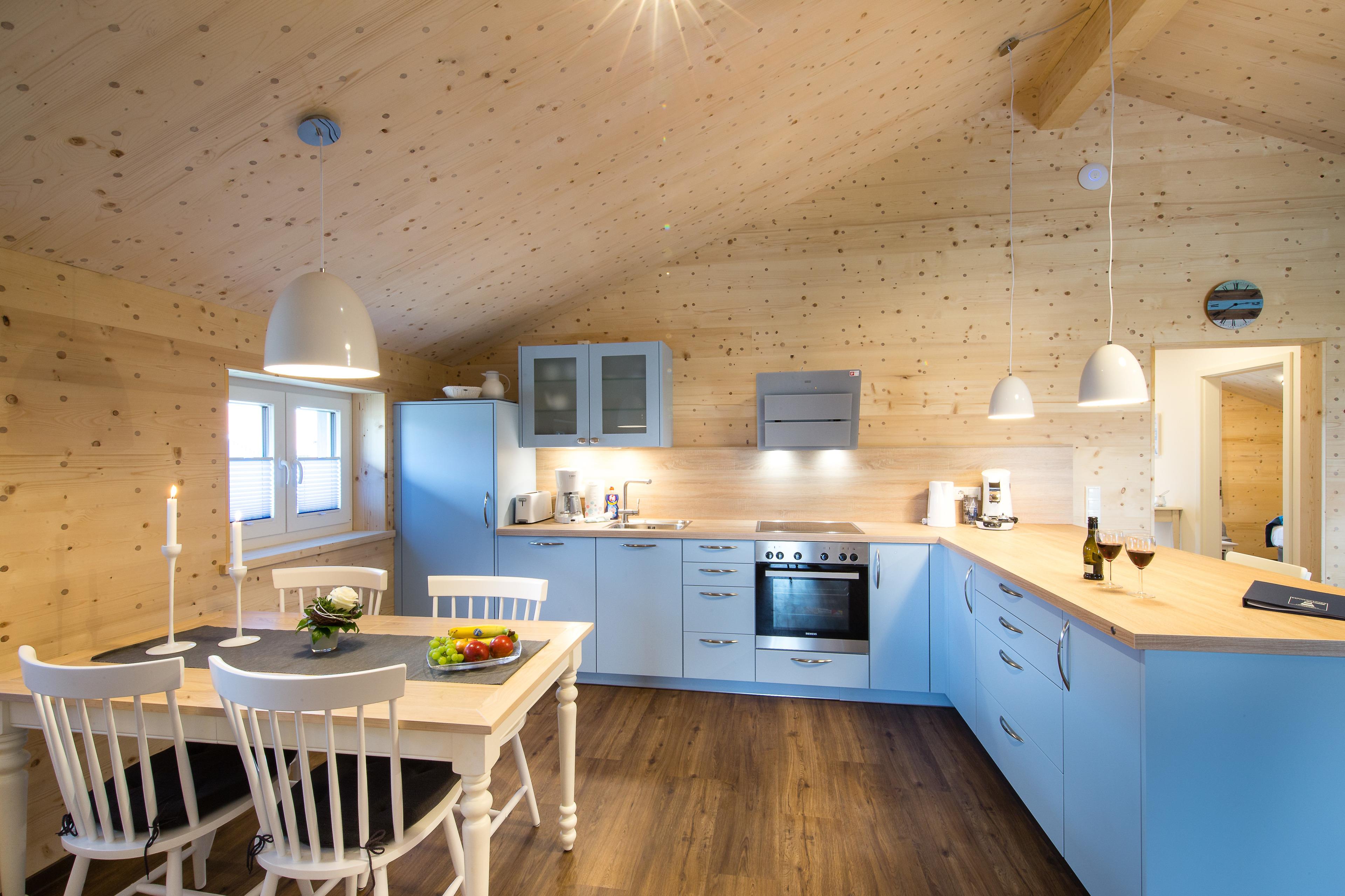 Die Skipperhäuser (Typ A plus) verfügen über zwei separate Schlafzimmer mit Boxspring-Doppelbetten. Der großzügige Wohnraum geht in den offenen Küchen- und Essbereich über. Der Kaminofen bildet das Zentrum des Wohnraumes und lädt zu gemütlichen Abenden ein. Vom Badezimmer mit ebenerdiger Dusche gibt es einen direkten Zugang zur Sauna. Die Terrasse mit Zugängen vom Wohn- und einem der Schlafzimmer rundet den Aufenthalt ab.