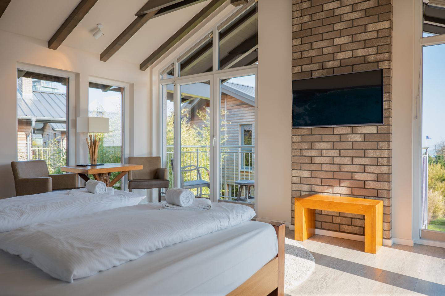 Unsere Typ B1 Ferienhäuser laden Sie aufgrund ihres offenen Wohn-Essbereich zum Beisammensein und gemeinsamen Urlaub ein. Verbringen Sie sonnige Stunden auf Balkon und Terrasse oder lassen Sie sich bei Wind und Regen vor dem warmen Kamin aufwärmen.
