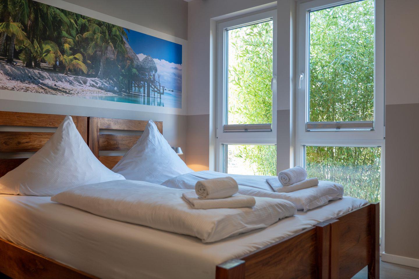 Mit 85 m2 über zwei Ebenen sind die Ferienhäuser des Typs B1 besonders für Familien und Paare zu empfehlen. Genießen Sie auf Ihrer privaten, mit Bambus eingerahmten Terrasse geruhsame Stunden mit Sonnenschein bis zum Abend. Oder gönnen Sie sich in Ihrem Wohlfühlbad mit Sauna und einladender Badewanne eine entspannte Auszeit. Die modern ausgestattete offene Küche geht in den Wohnbereich mit ausgewählten polynesischen Möbeln über und bietet somit angenehm Platz für die ganze Familie. Von dem gemütlichen Sofa blicken Sie am Tag in die grüne Gartenlandschaft, am Abend auf das knisternde Feuer im Kamin. Ein absolutes Highlight der B1-Ferienhäuser ist das exquisite Lifestyle-Schlafzimmer im 1. Stock mit Balkon und fantastischer Aussicht auf die Ostsee. Das zweite Schlafzimmer mit einem Duschbad sowie ein separates WC befinden sich im Erdgeschoss.
