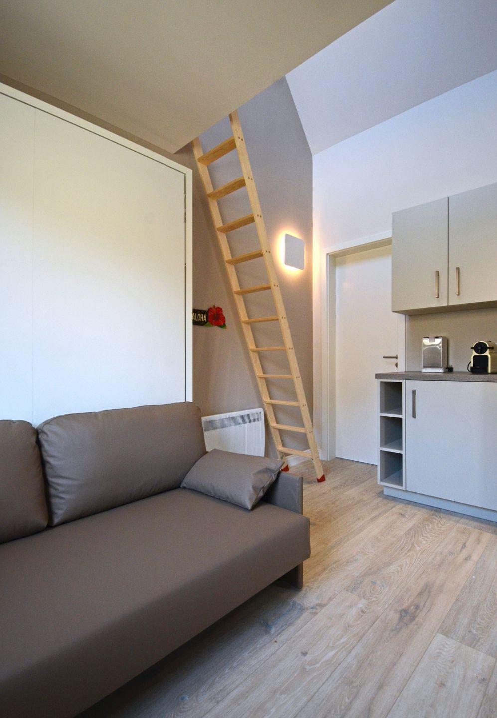 Die Mini Lodge ist eine Art Doppelzimmer mit Duschbad, Nespresso-Maschine, Wasserkocher und Kühlschrank. Das Bett ist über eine Leiter im Spitzboden zu erreichen und es steht ein Schrankbett im unteren Bereich als Ausweichmöglichkeit bereit. Eine Kochmöglichkeit ist leider nicht vorhanden. Etwas Geschirr und Besteck um sich ein kleines Frühstück zu zaubern ist vorhanden.