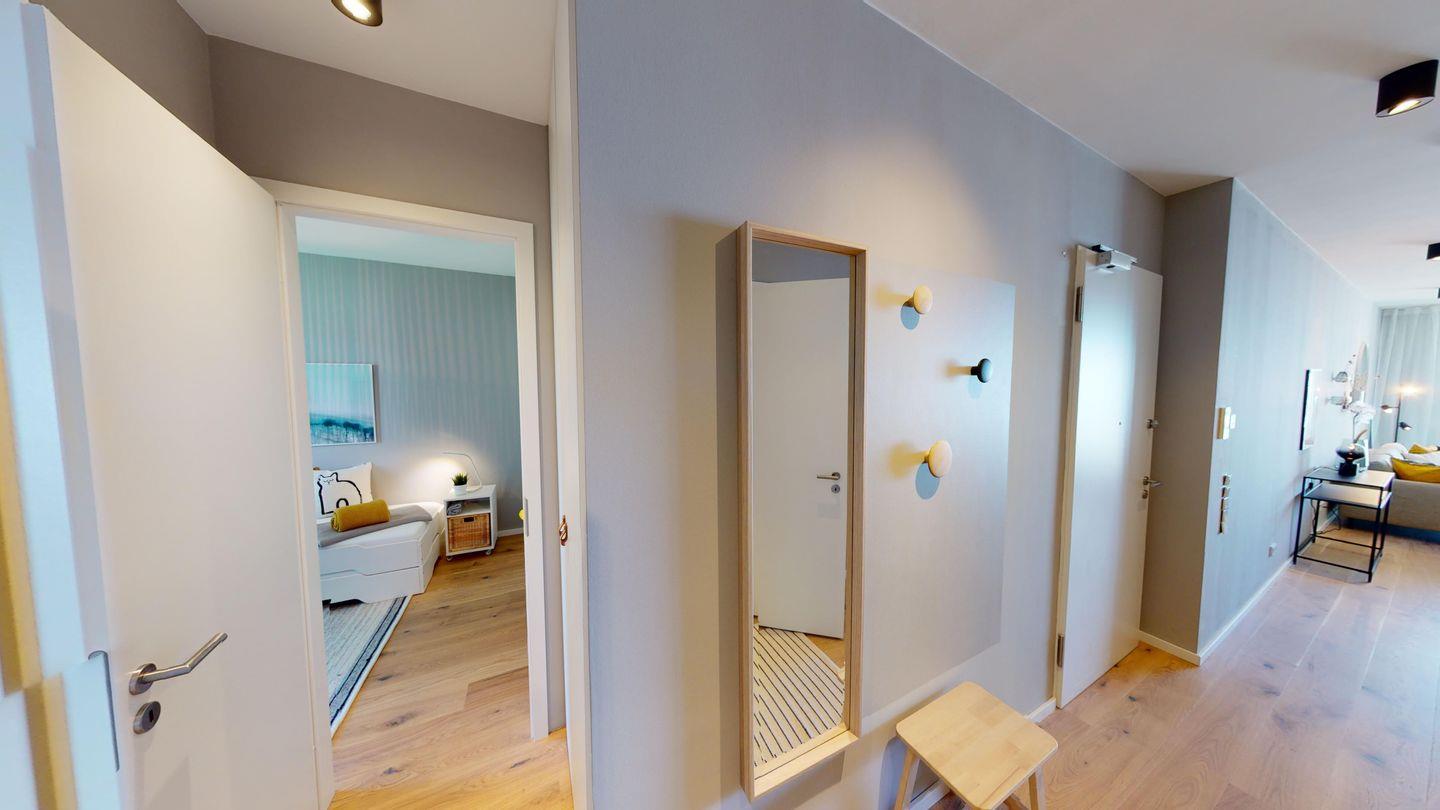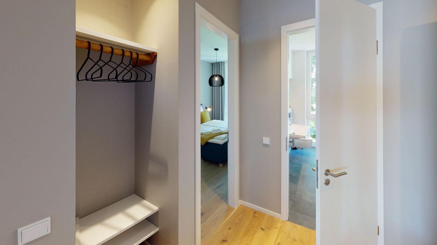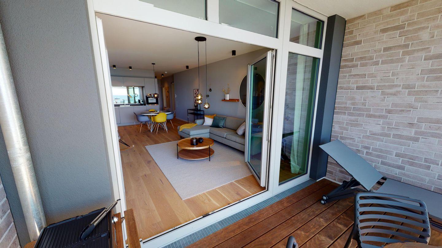 Der großzügige, offene Wohn- und Essbereich ist gemütlich eingerichtet und offen zur voll ausgestatteten Küche, die keine Wünsche offen lässt. Die beiden Schlafzimmer sind ruhig nach hinten gelegen. Im Master-Bedroom befindet sich ein hochwertiges Doppelbett, im zweiten Schlafzimmer stehen zwei Einzelbetten, die variabel gestellt werden können. Beide Schlafräume verfügen über einen Smart-TV, einen Kleiderschrank und Verdunkelungsvorhänge.