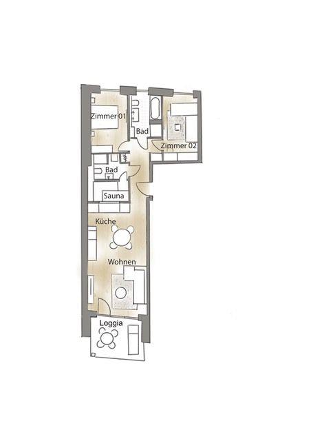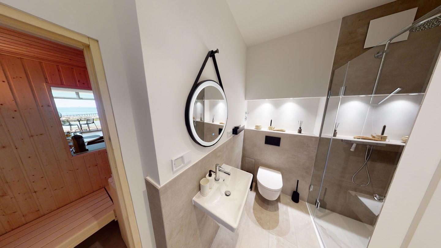 Besonders komfortabel sind die beiden Badezimmer, eines mit Dusche und Badewanne sowie ein zweites Badezimmer mit Dusche und integrierter Sauna – inklusive Blick aufs Meer! Die überdachte Loggia mit herrlichem Meerblick in Südlage ist mit einem Tisch, Elektrogrill, vier Stühlen und zwei Sonnenliegen ausgestattet.