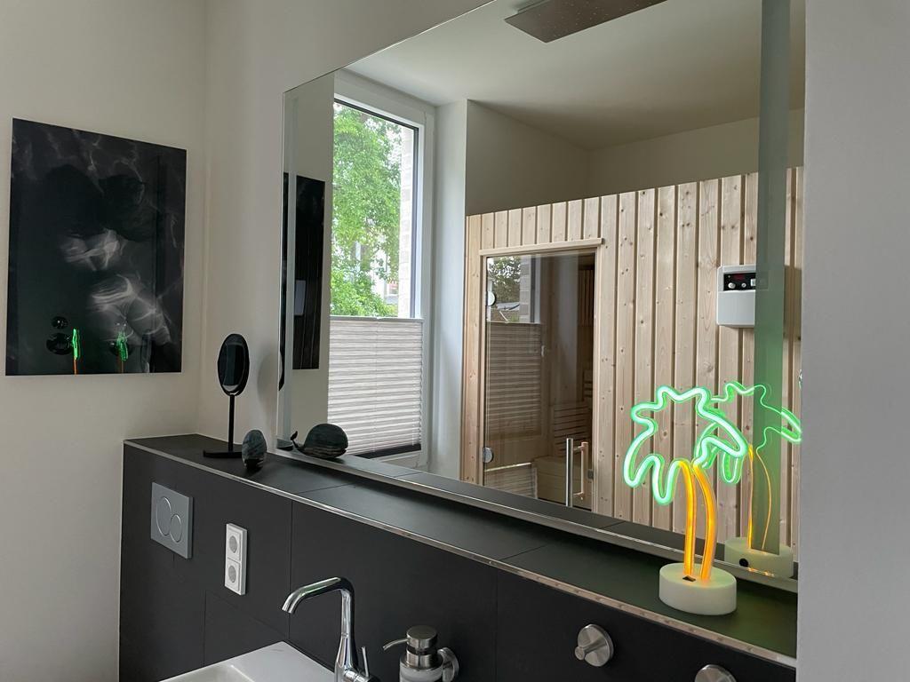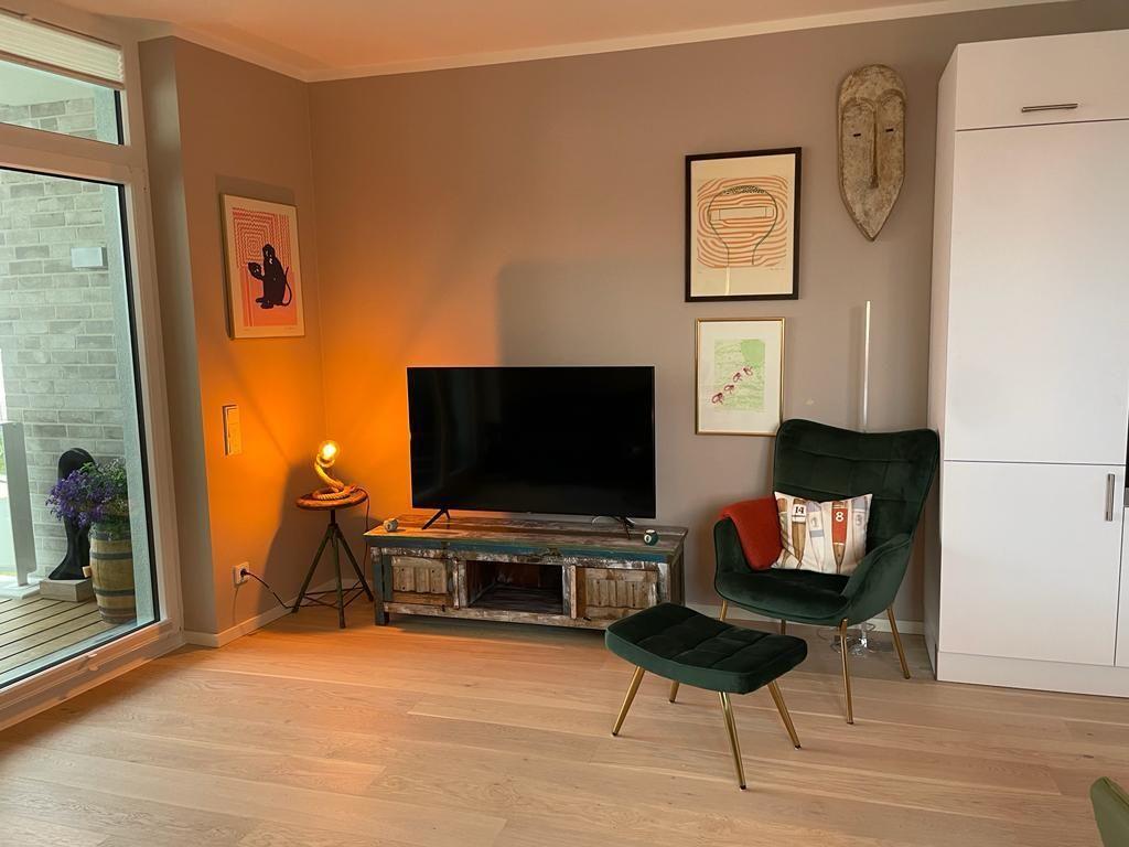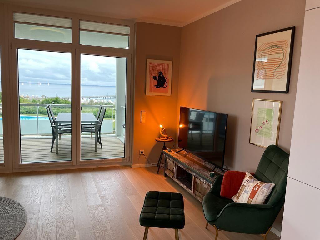 Die luxuriöse Wohnung liegt im 2. OG links und verfügt über eine Loggia mit einem Strandkorb sowie Elektrogrill in Südlage. Das Herzstück der Wohnung ist der offene Wohn-/Essbereich, in dem sich auch die voll ausgestattete Küche mit einem großen Esstisch befindet. Zu den Highlights der Wohnung zählen die eigene Sauna sowie der direkte Meerblick von Balkon und Wohnzimmer.