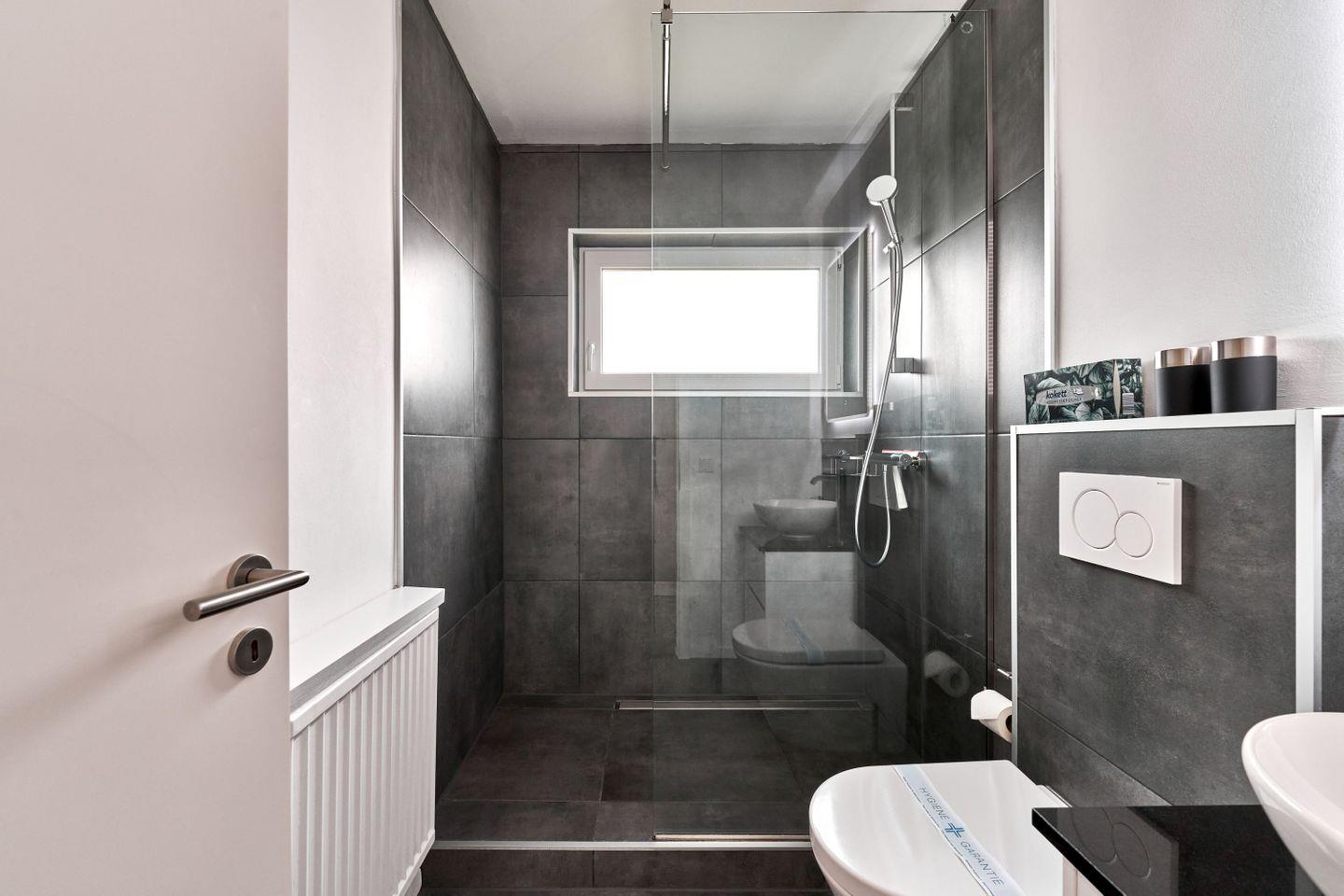 Das Badezimmer ist mit einer bodentiefen Dusche und einem Tageslichtfenster ausgestattet.