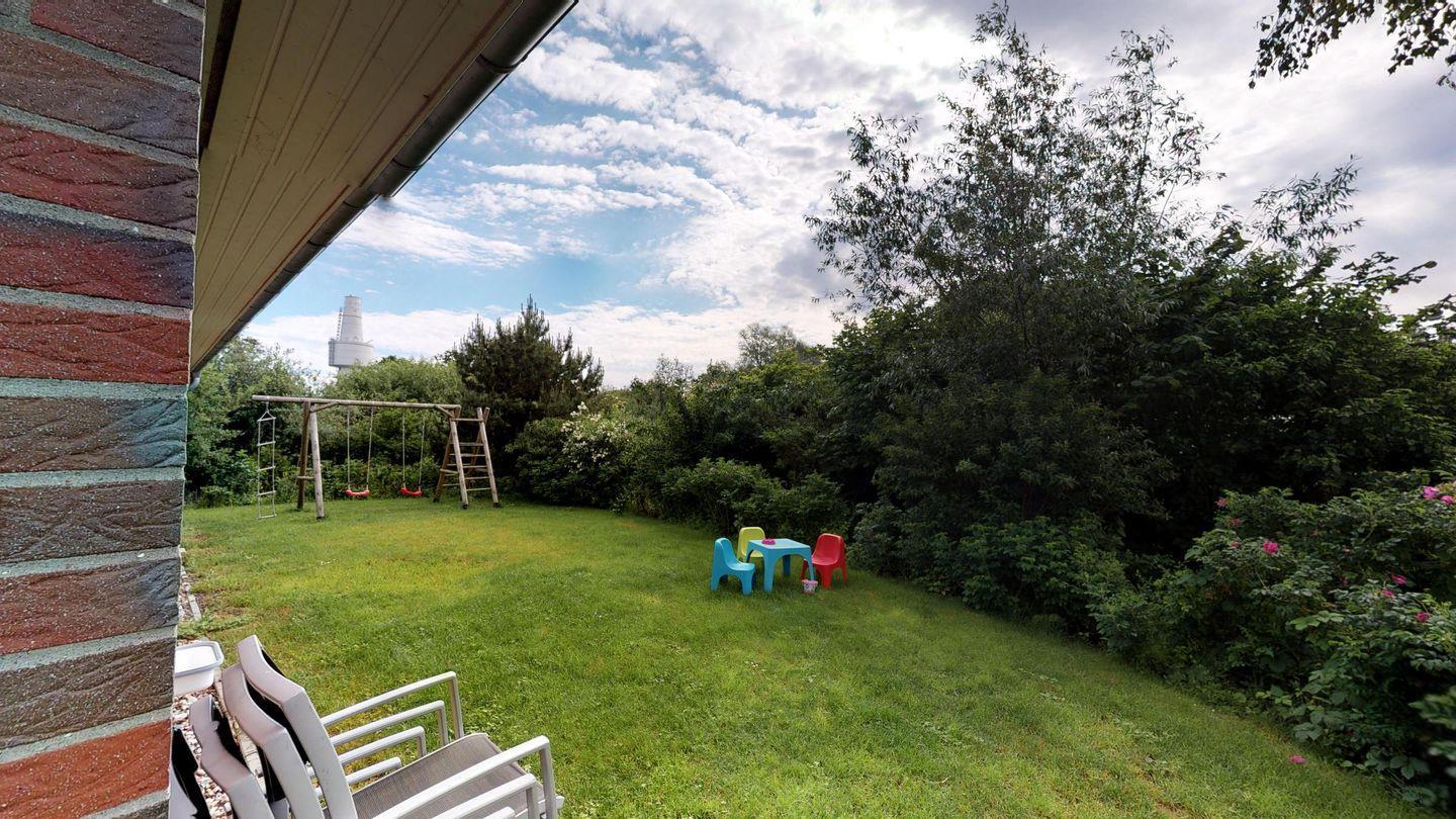 Zum Haus gehört eine möblierte Terrasse mit Strandkorb und Kamingrill sowie ein Garten mit Liegewiese und Kinderspielgerüst - ideal für sonnige Stunden.