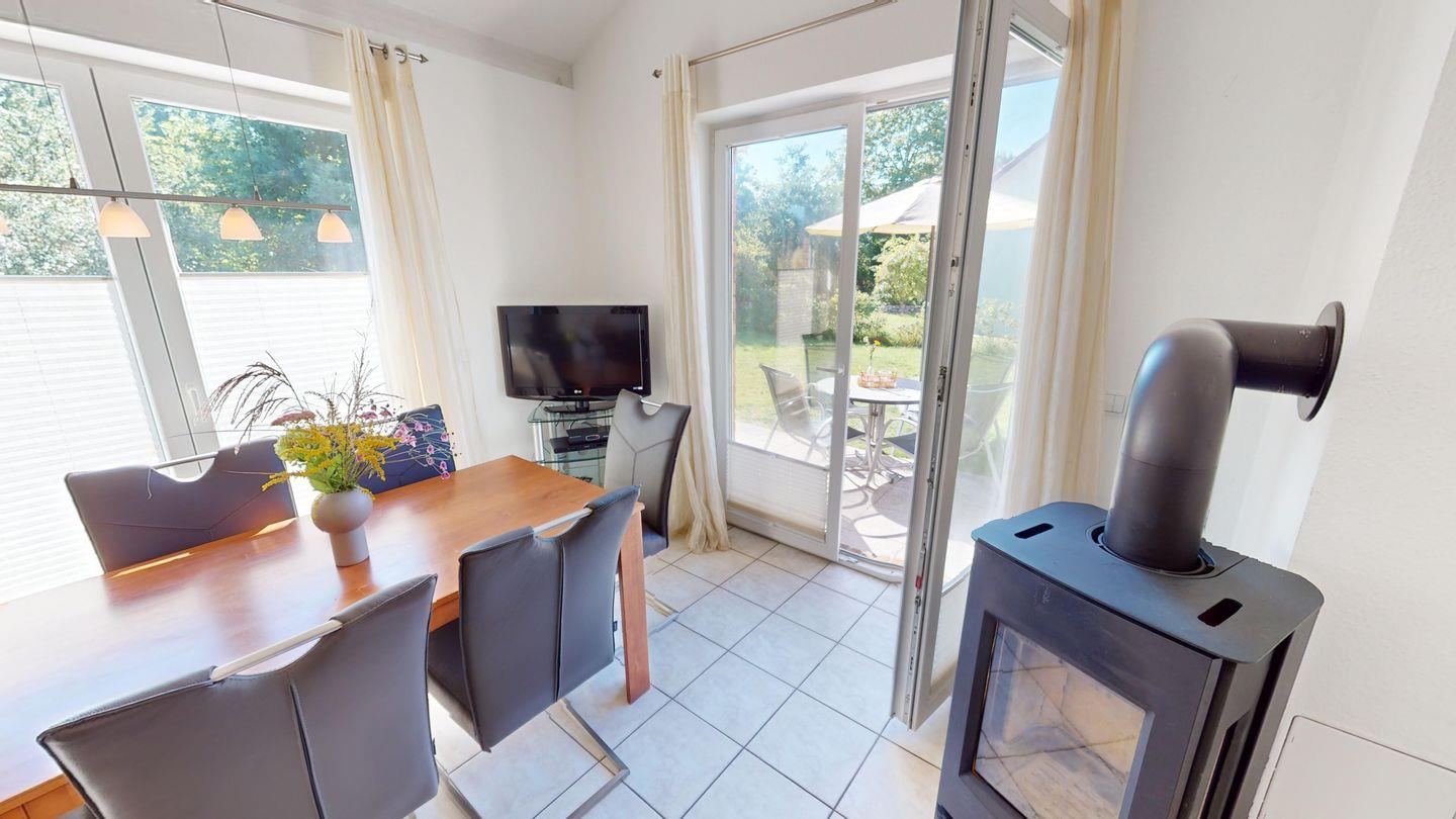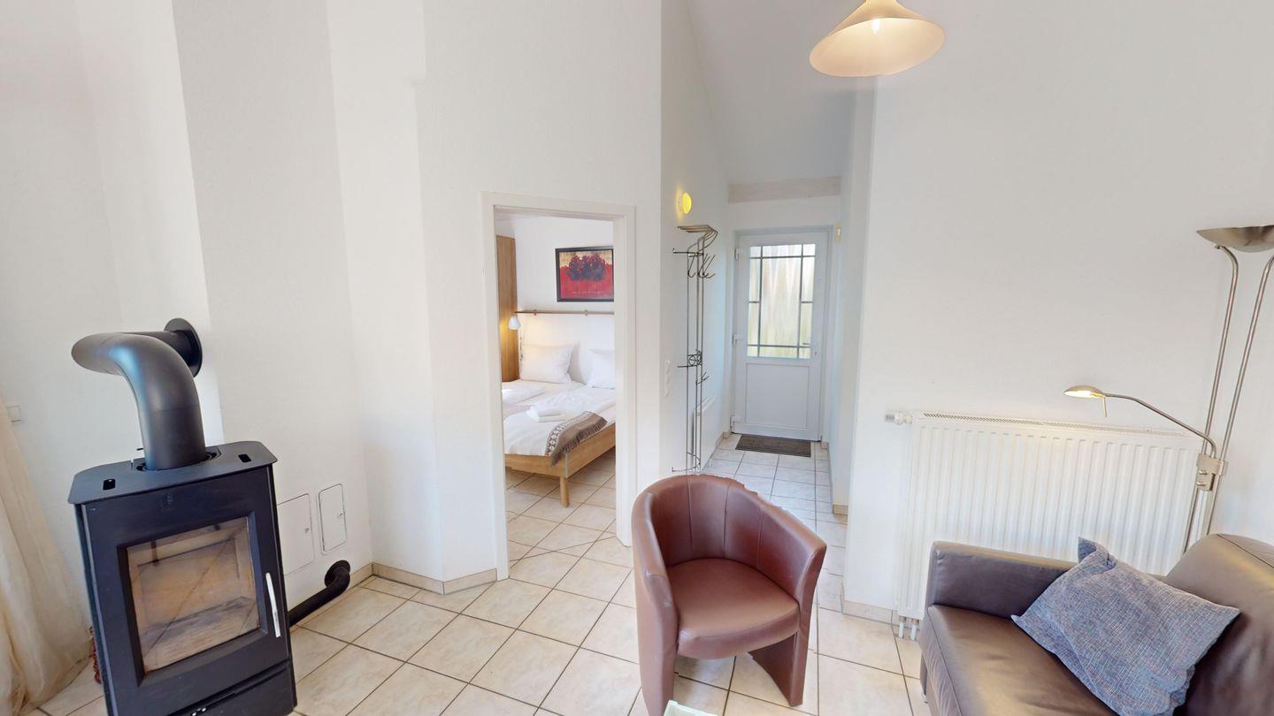 Das Ferienhaus verfügt über ein gemütliches Wohnzimmer, zwei behagliche Schlafzimmer und ein Badezimmer. Es bietet Platz für bis zu vier Personen (Betten: ein Doppelbett und zwei Einzelbetten). Im Wohnzimmer lässt sich das Sofa zu einem zusätzlichen Schlafplatz herrichten. Das Haus liegt in einer ruhigen Privatstraße und verfügt über einen eigenen PKW-Stellplatz. Ein besonderes Plus ist – neben dem Kamin – die eigene Sauna.
