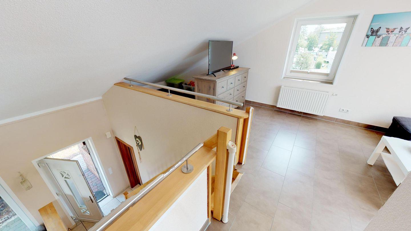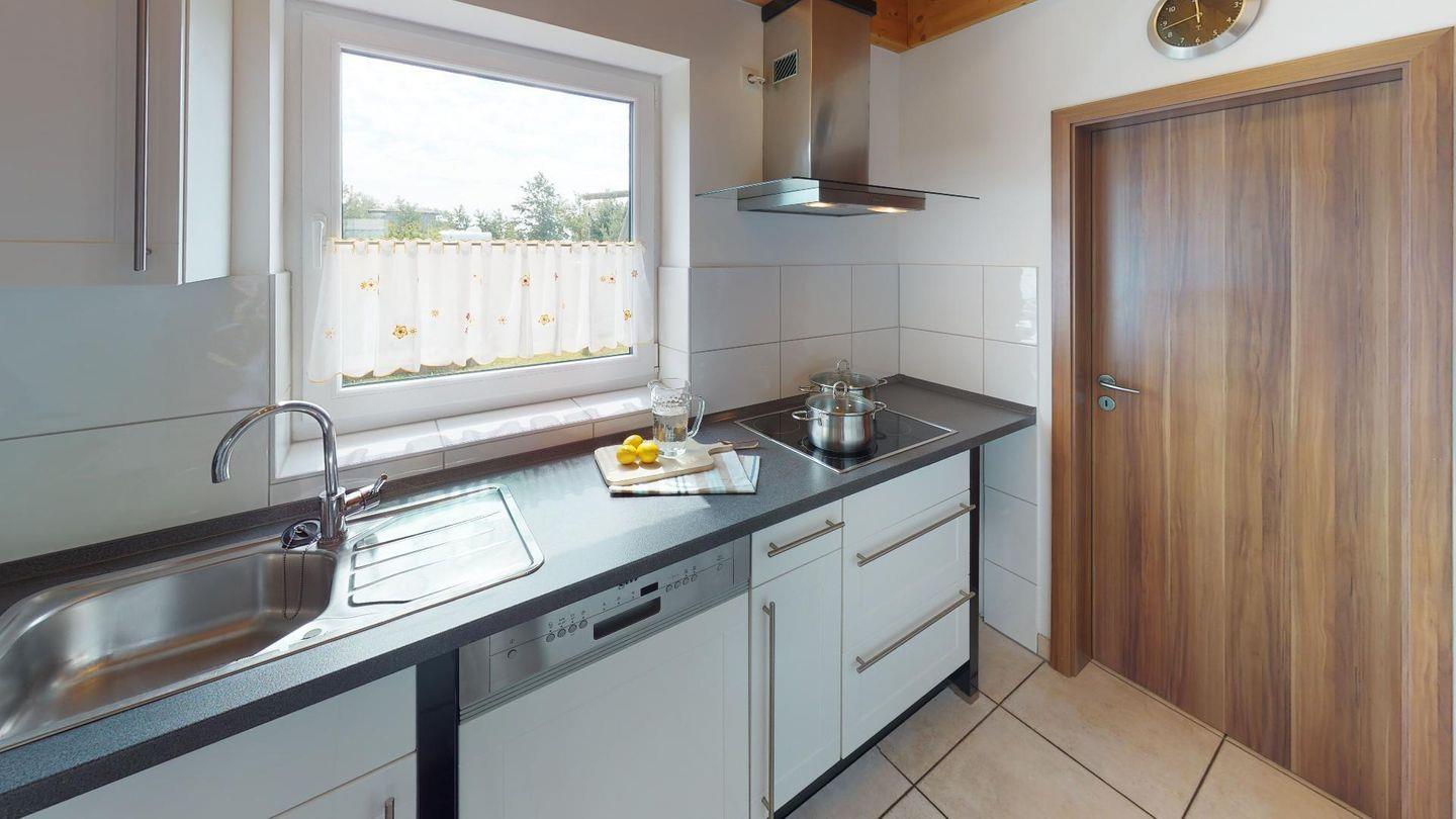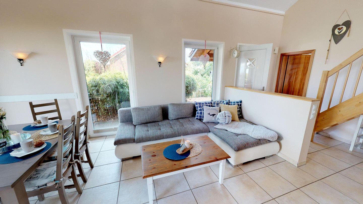 Der Wohnbereich mit Kaminofen, Essbereich und gemütlicher Sofaecke lädt zum Verweilen ein. An das Wohnzimmer grenzen zwei Schlafzimmer mit jeweils zwei Einzelbetten sowie die moderne, gut ausgestattete Küche. Im Erdgeschoss befindet sich auch ein Duschbad mit Badewanne sowie eine eigene Sauna. Im oberen Stockwerk finden Sie ein zusätzliches Schlafzimmer mit einem Doppelbett sowie ein Sofa mit Schlaffunktion für zwei Personen. Es gibt im Obergeschoss ein weiteres Duschbad.