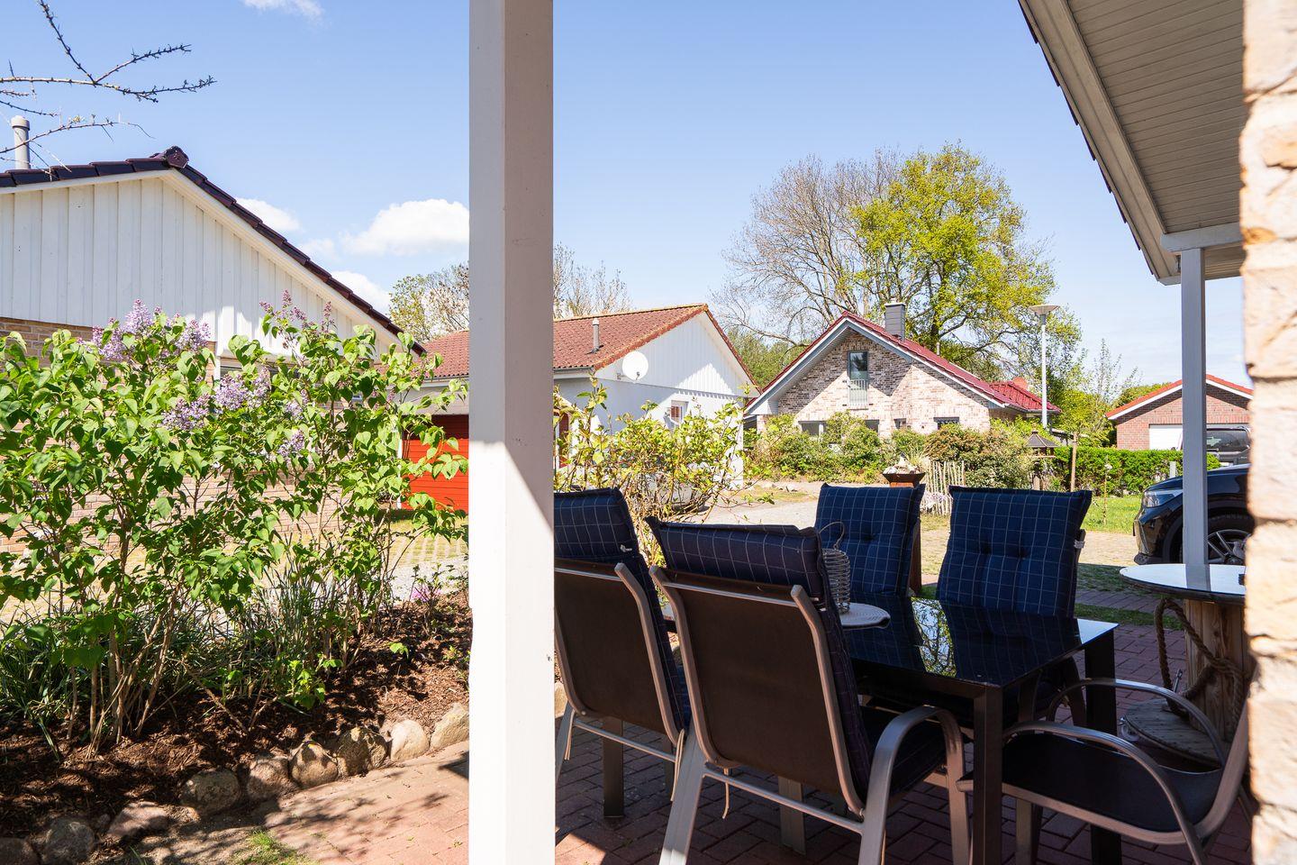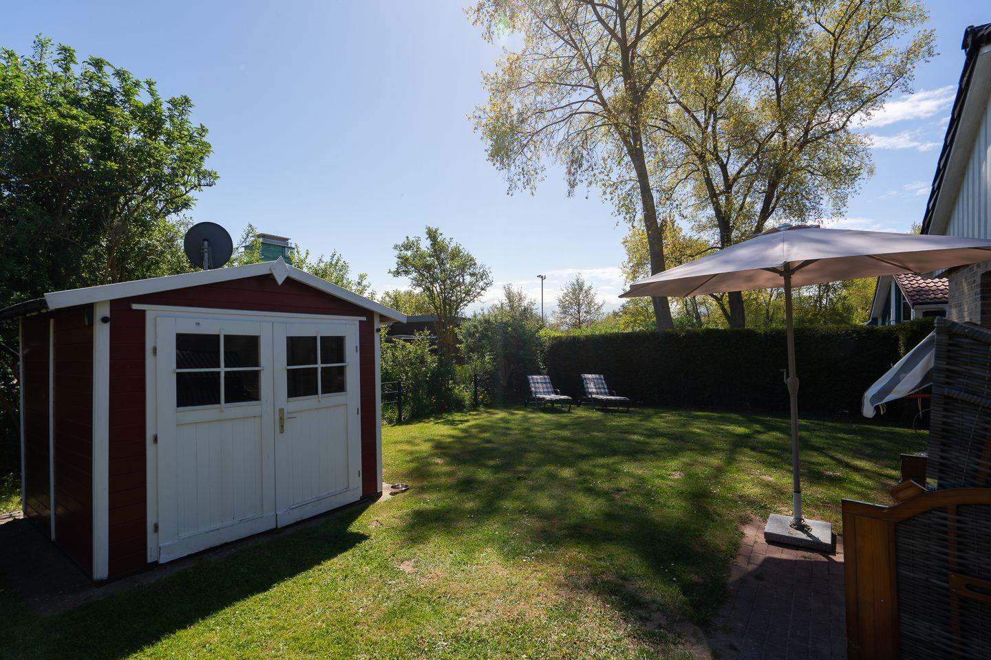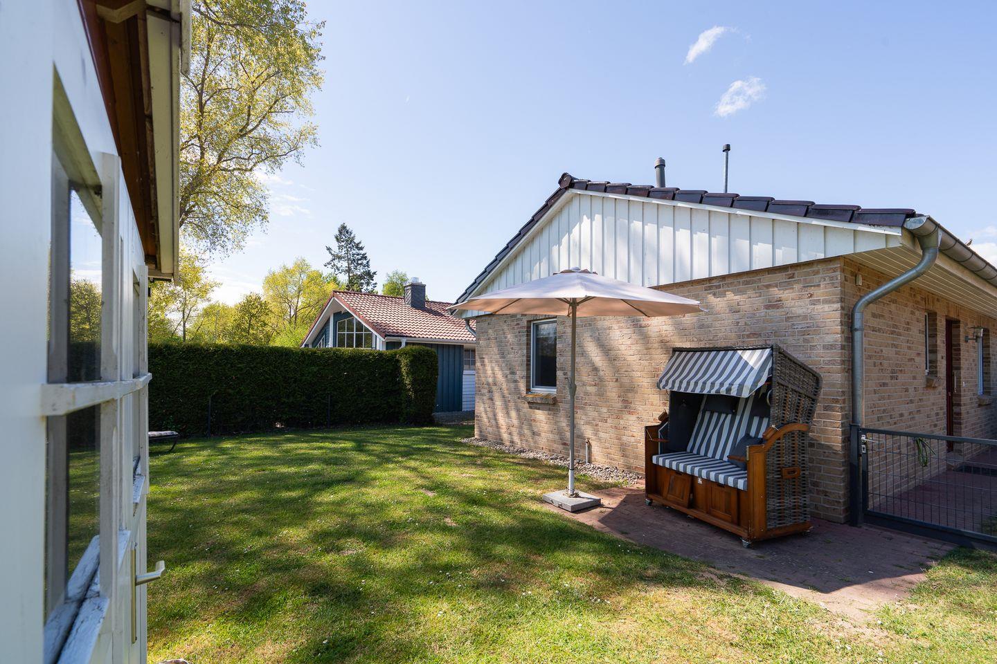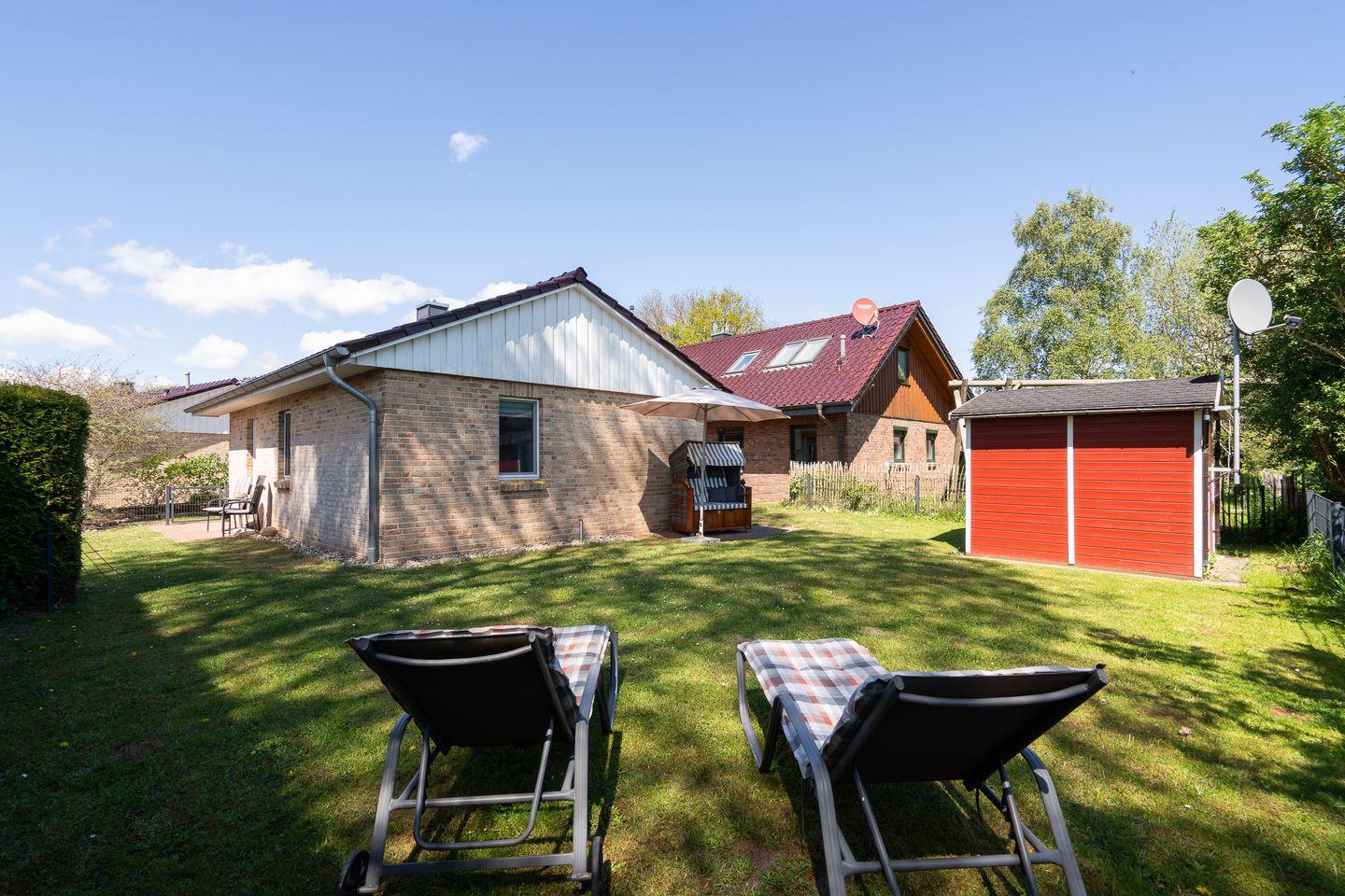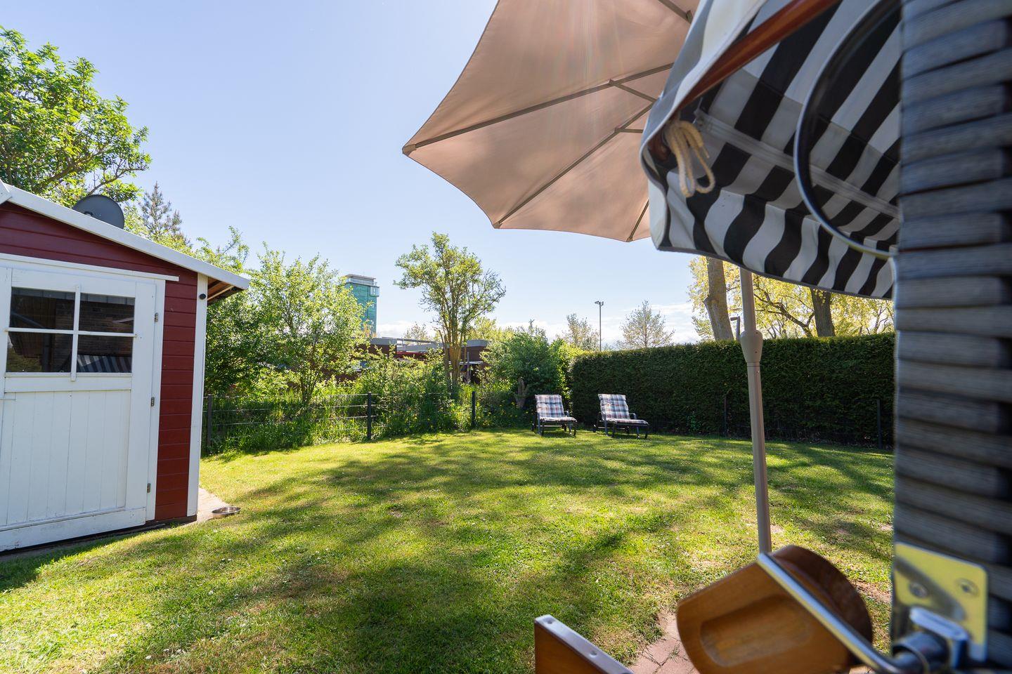 Ein Gartenhaus dient als Abstellmöglichkeit und beinhaltet nützliche Dinge wie Grill, Bollerwagen, zwei Fahrräder und die Auflagen für die Gartenmöbel. Je nach Sonnenstand haben Sie die Wahl zwischen drei Terrassen mit Gartenmöbeln, Sonnenschirm und Strandkorb.