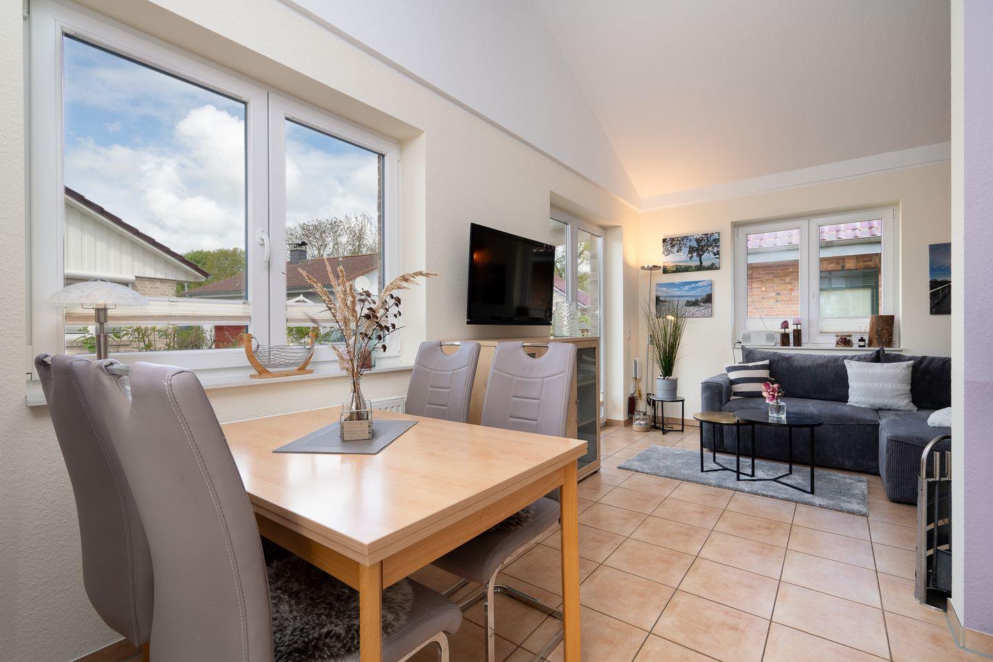 Das Haus bietet einen hellen, gemütlichen Wohnbereich mit Kaminofen und daran angrenzend die offene Küchenzeile mit einem einladenden Essplatz. Ein Schlafzimmer verfügt über ein Doppelbett, das andere über zwei gemütliche Einzelbetten. Das Badezimmer mit ebenerdiger Dusche, Fußbodenheizung, Handtuchwärmer und eigener Sauna vervollständigt den Wohnbereich.