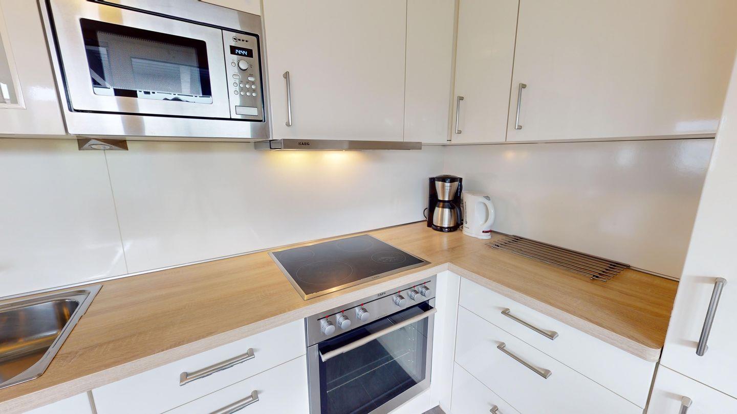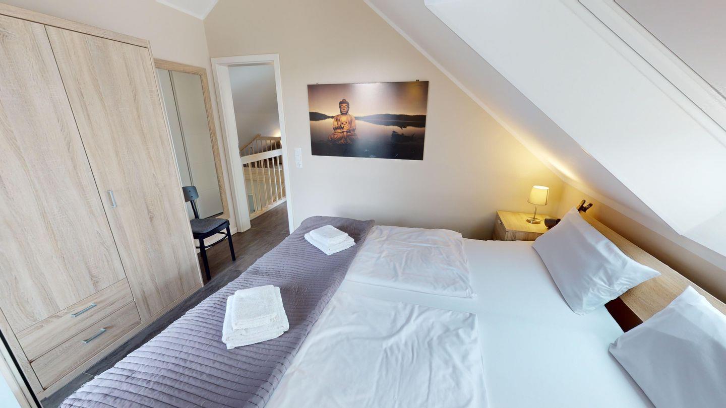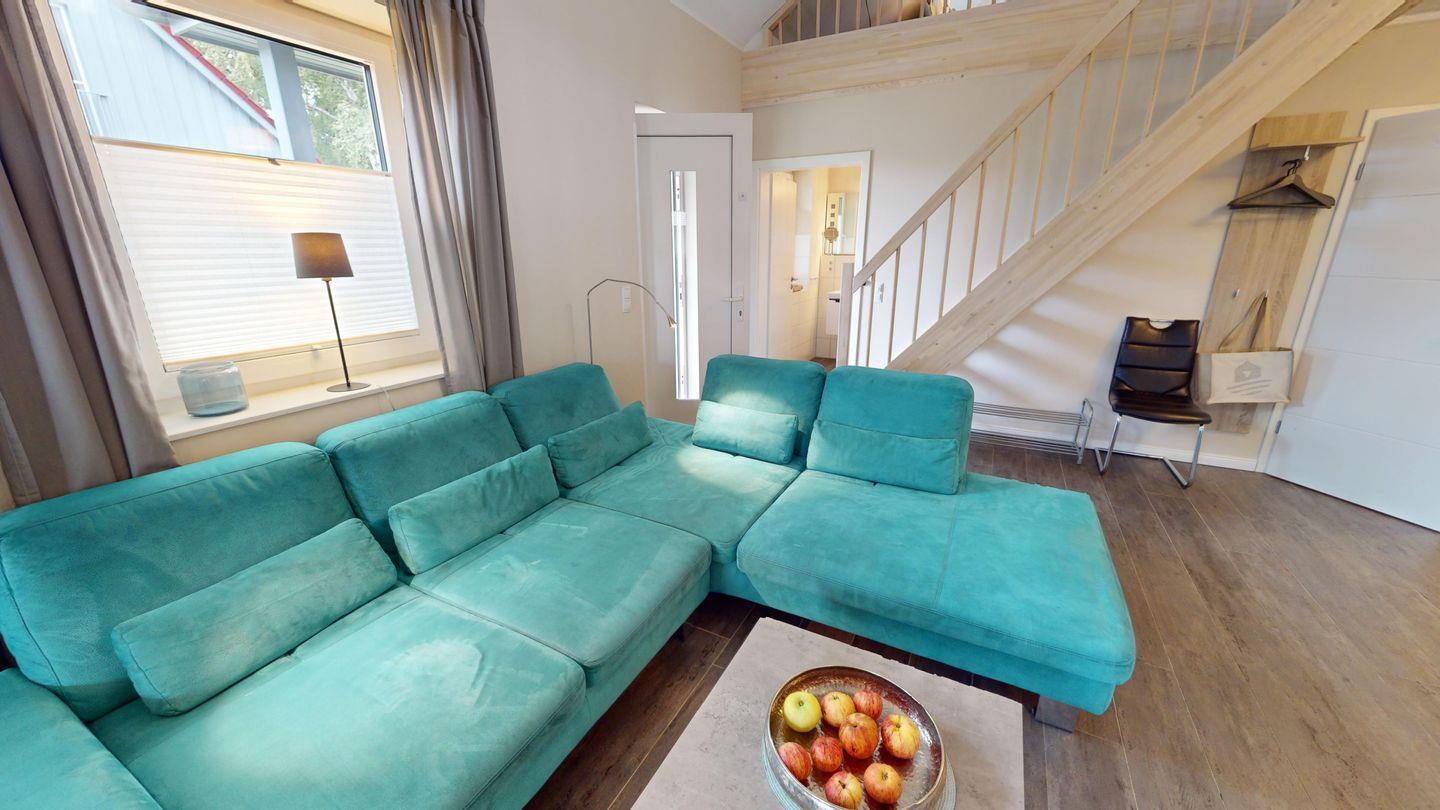 Das Haus bietet einen geschmackvoll eingerichteten Wohn-/Essbereich mit Kaminofen sowie eine angrenzende moderne Küche. Zwei Schlafzimmer mit je einem Doppelbett im Erdgeschoss sowie ein Schlafzimmer mit Doppelbett, ein offener Schlafplatz mit zwei Einzelbetten, ein Duschbad mit WC sowie eine separate Sauna im Obergeschoss runden das Feriendomizil ab