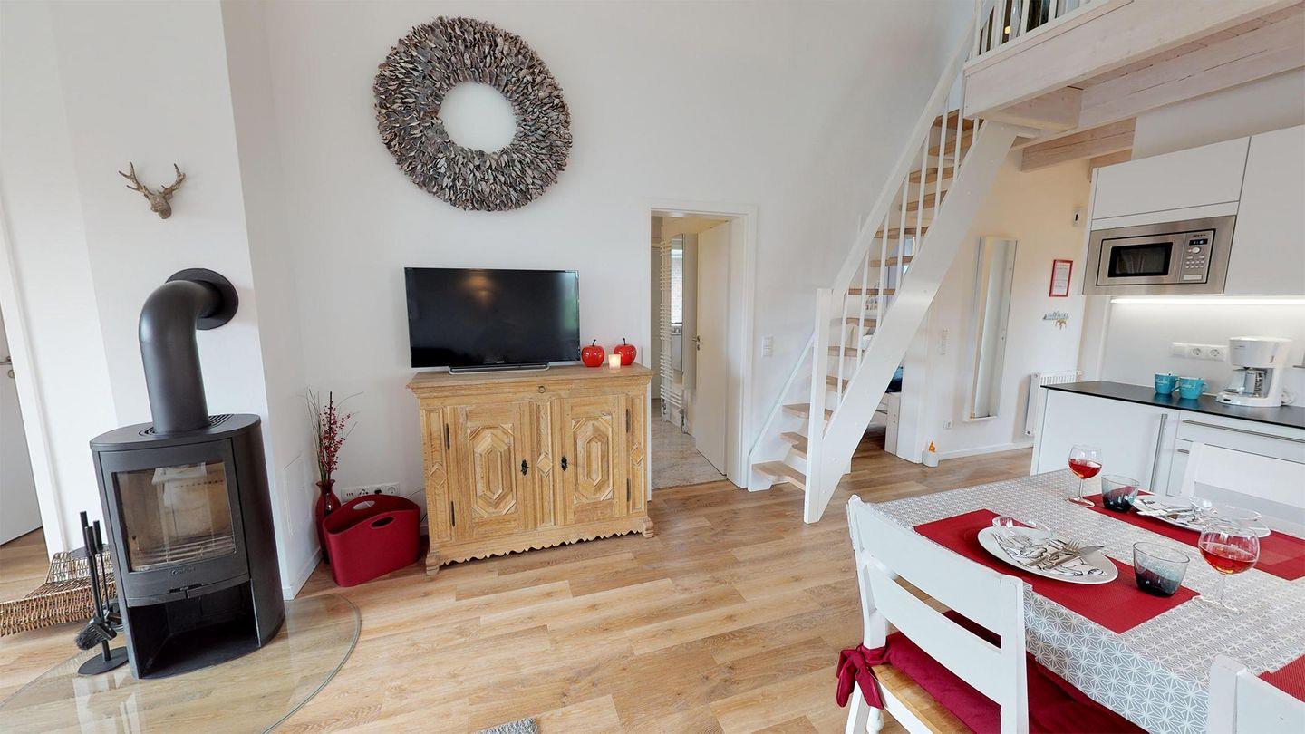 Das Erdgeschoss teilt sich in den Ess- und Wohnbereich mit Einbauküche, Esstisch, Sofa, TV und Kaminofen auf. Daran grenzen zwei Schlafzimmer (einmal mit Doppelbett, einmal mit zwei Einzelbetten) und ein Duschbad. Ein Gäste-WC ist ebenfalls vorhanden. Auf der Empore des Dachgeschosses finden Sie vor dem Kinderzimmer mit zwei Einzelbetten, Babybett und TV eine kleine, gemütliche Leseecke.