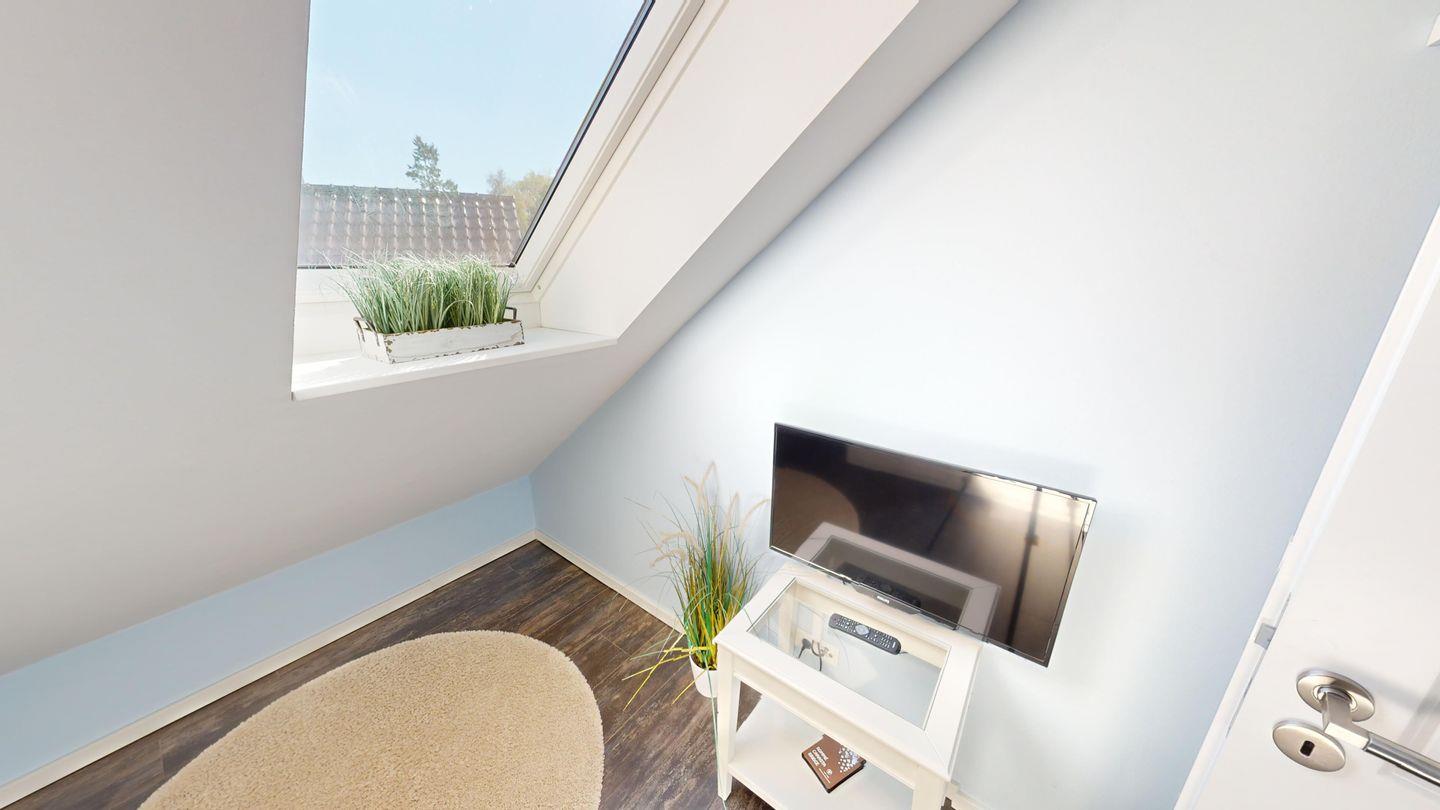 Das Obergeschoss ist ideal für Kinder. Es gibt zwei Schlafzimmer mit jeweils einem Einzelbett, eines davon zusätzlich mit einem Babybett. In der oberen Etage steht außerdem ein WC zur Verfügung.