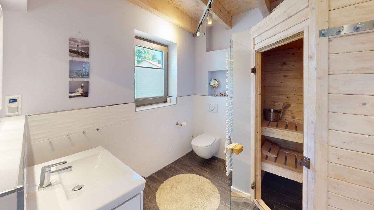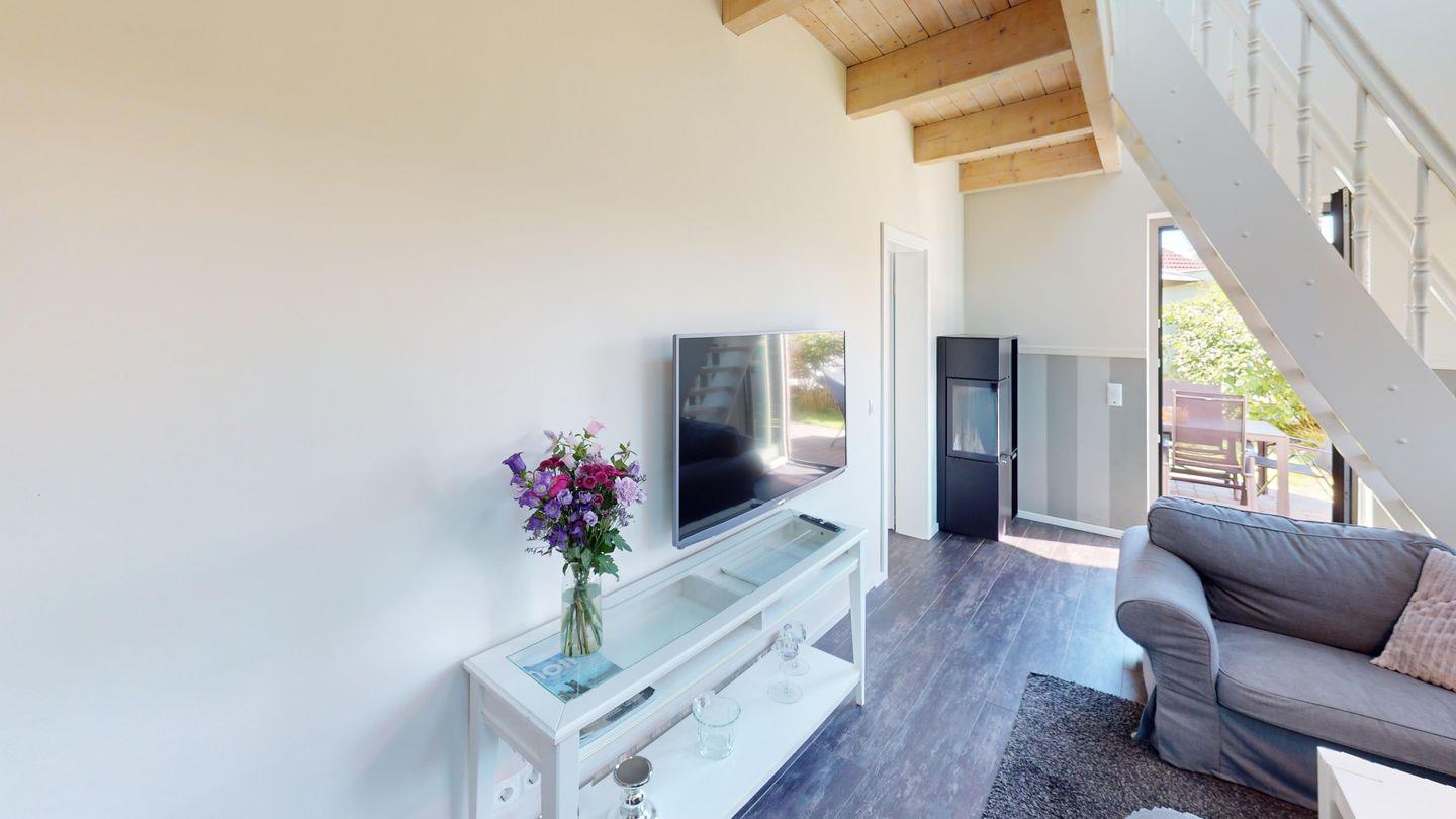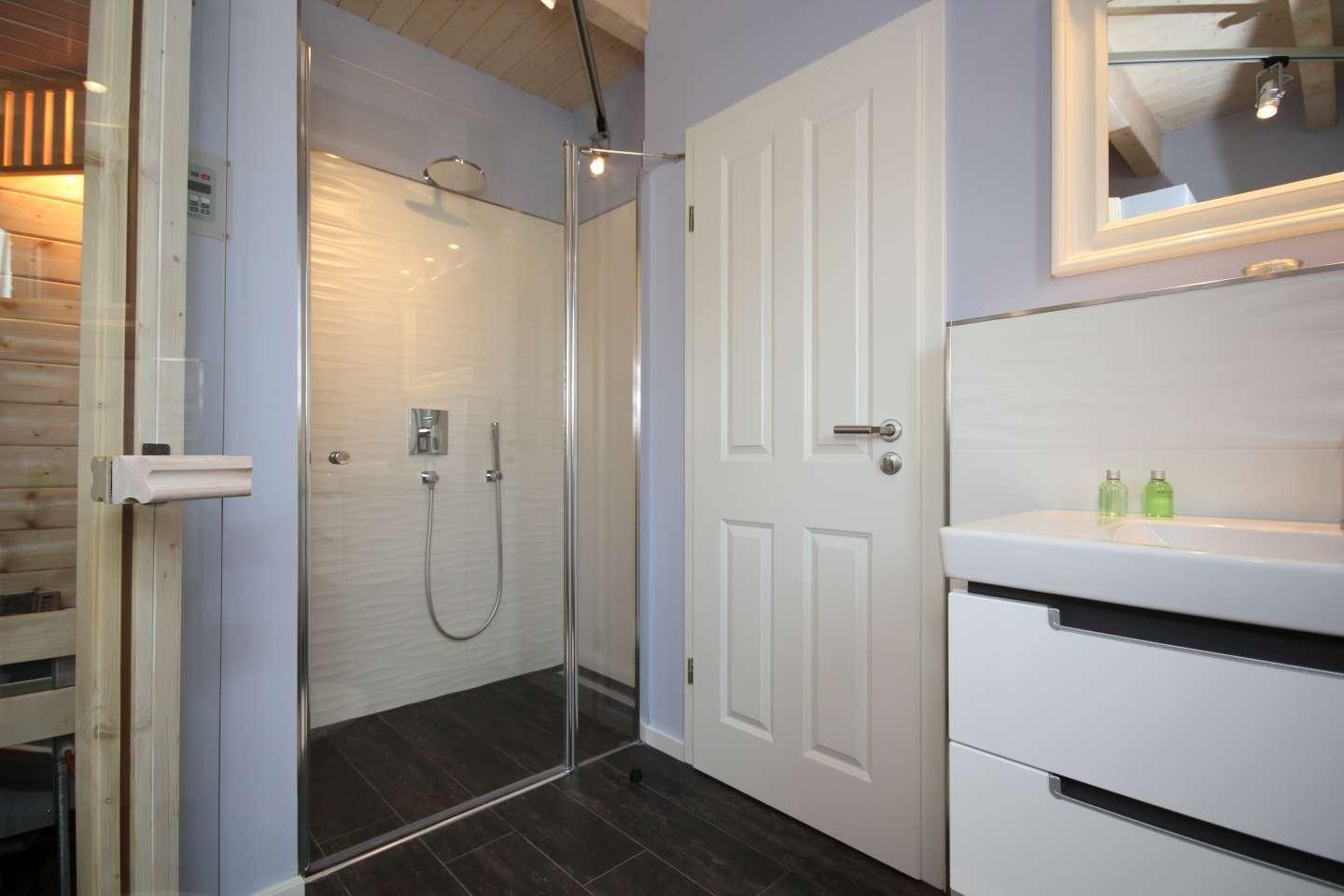 Sie werden von der schönen Küche mit Essbereich begrüßt. Angrenzend liegt das Wohnzimmer mit Kamin. Im Erdgeschoss gibt es zwei Schlafzimmer mit jeweils einem Doppelbett. Das Badezimmer hat eine Dusche und eine Sauna.