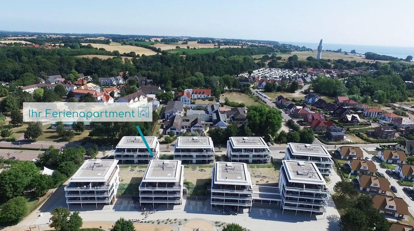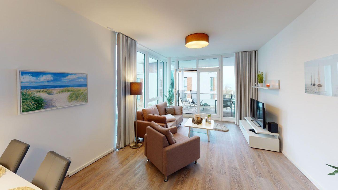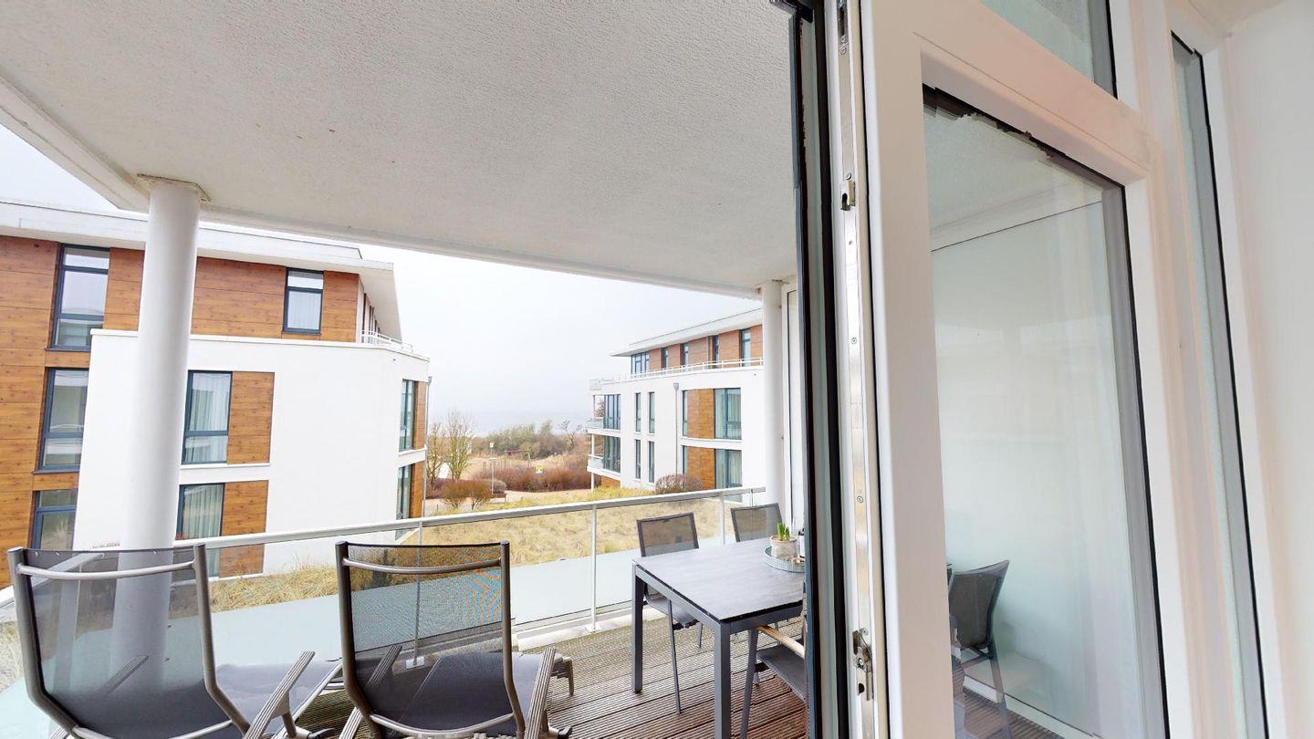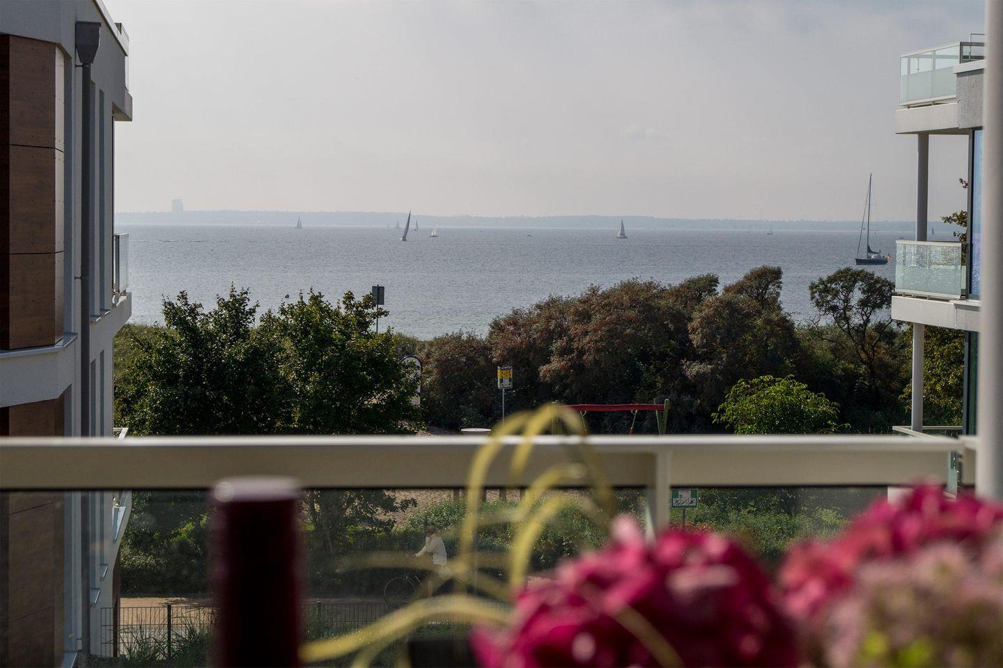 Modernes Ferienapartment in Pelzerhaken mit Balkon und eingeschränktem Meerblick, ideal für einen entspannten Urlaub an der Ostsee.